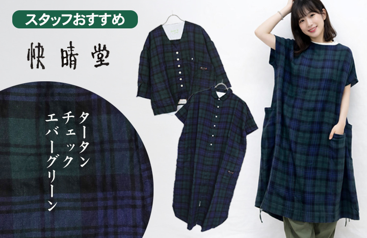 61OP-03 タータンチェック/エバーグリーン wide丸衿タブ半袖ワンピース