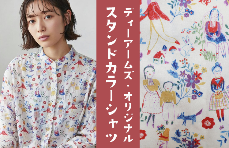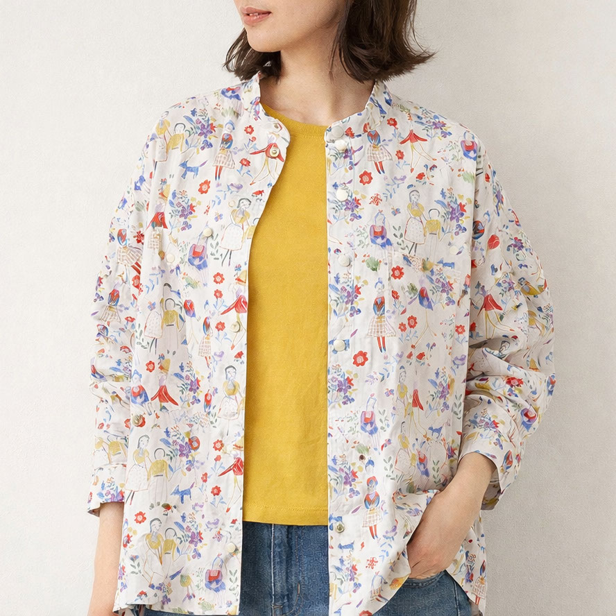 D-ARMSオリジナルライン 「D-ARMS ORIGINAL」 のスタンドカラーシャツ。かわいらしいイラストを総柄でプリントした特別な生地を使用し、一枚で主役になる存在感を持ったアイテムです。シャツとしても羽織としても使えるデザインで、コーディネートの幅が広がるロングシーズン対応の一着に仕上がっています。