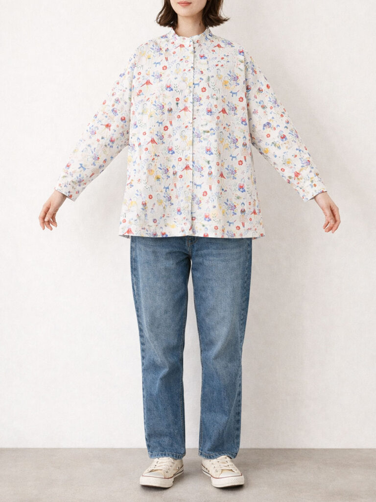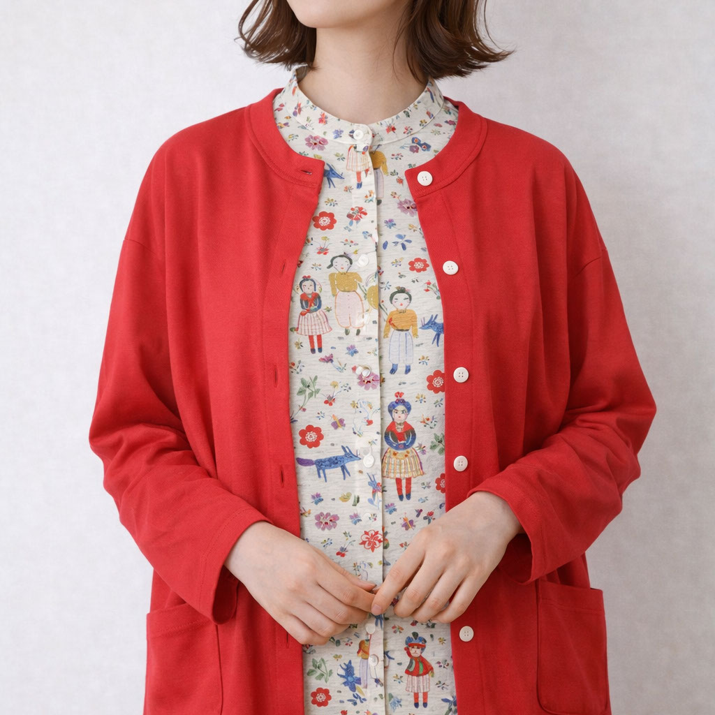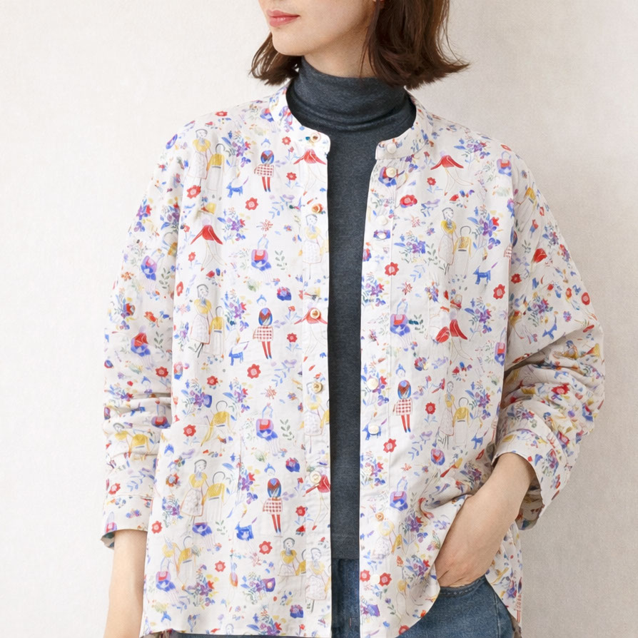 かわいらしいイラストの総柄生地を使用しながらも、シルエットは甘くなりすぎない設計。ジャケット感覚でも羽織れるよう、首元はすっきりとしたスタンドカラーに、身幅はワイドめに取られており、全体の印象はほどよくシャープにまとまっています。「柄は好きだけど可愛くなりすぎるのは苦手」という方にも取り入れやすい、大人バランスの一枚です。