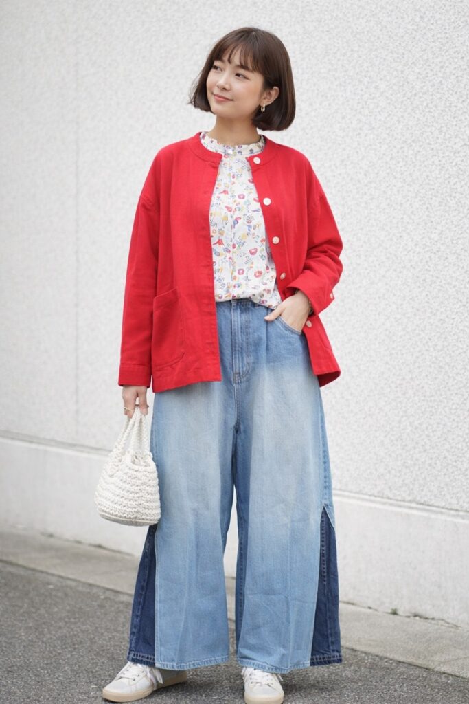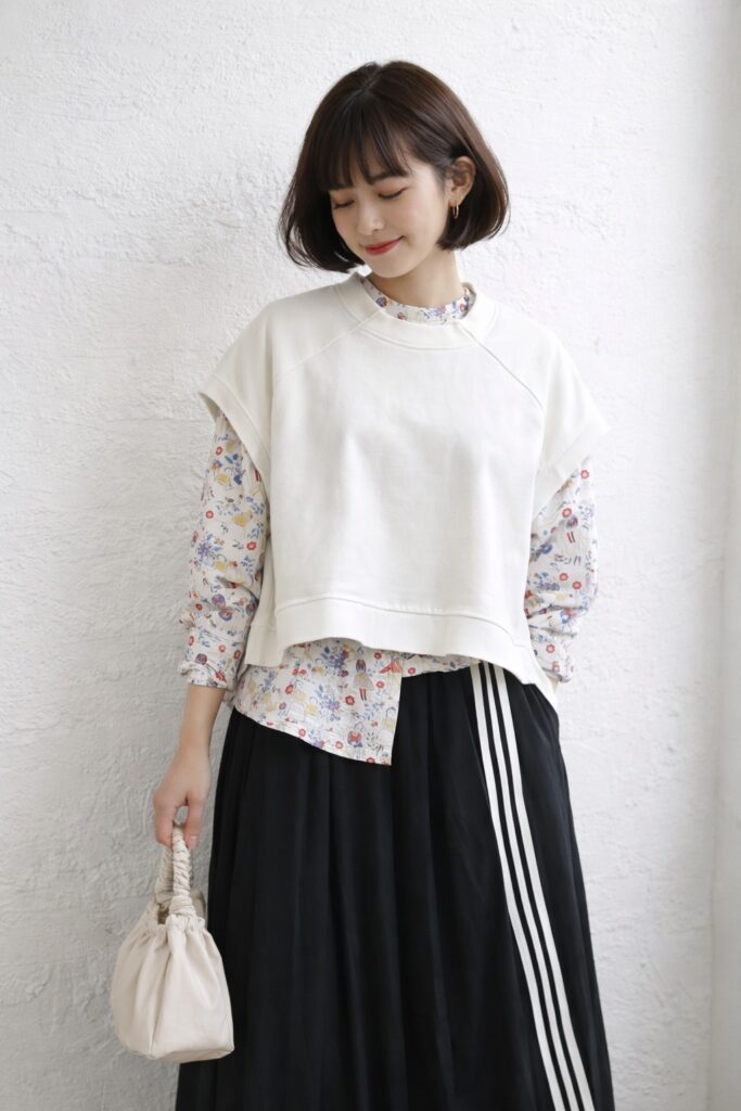 カラーは合わせやすい OFF WHITE。デニム、ワイドパンツ、スカート、テーパードパンツなど、幅広いボトムと相性が良く、ナチュラル系からカジュアルスタイルまで柔軟に対応します。柄物でもコーディネートに取り入れやすいのが魅力です。