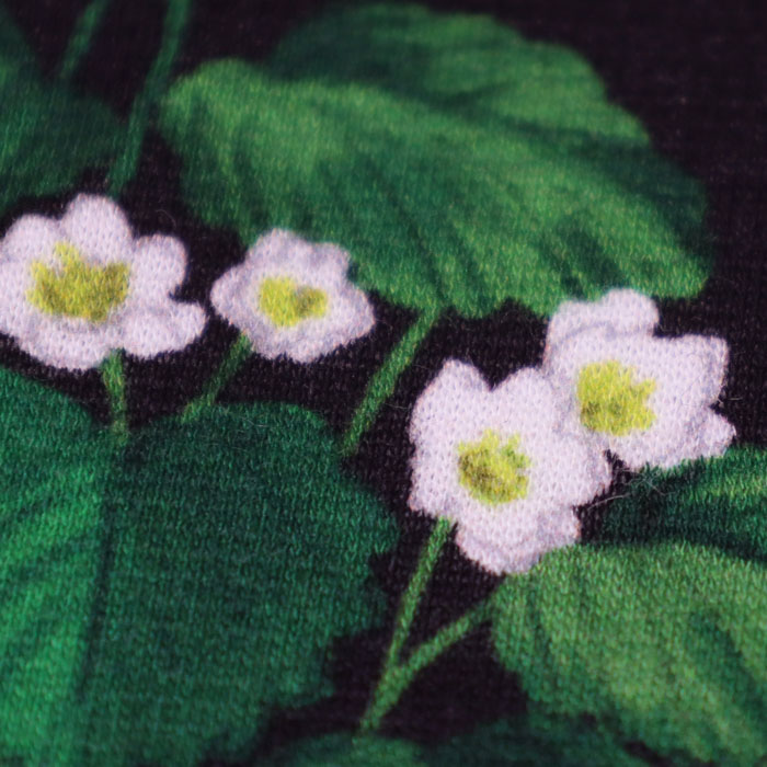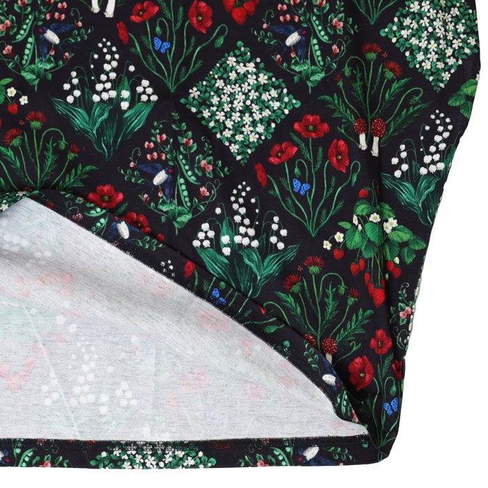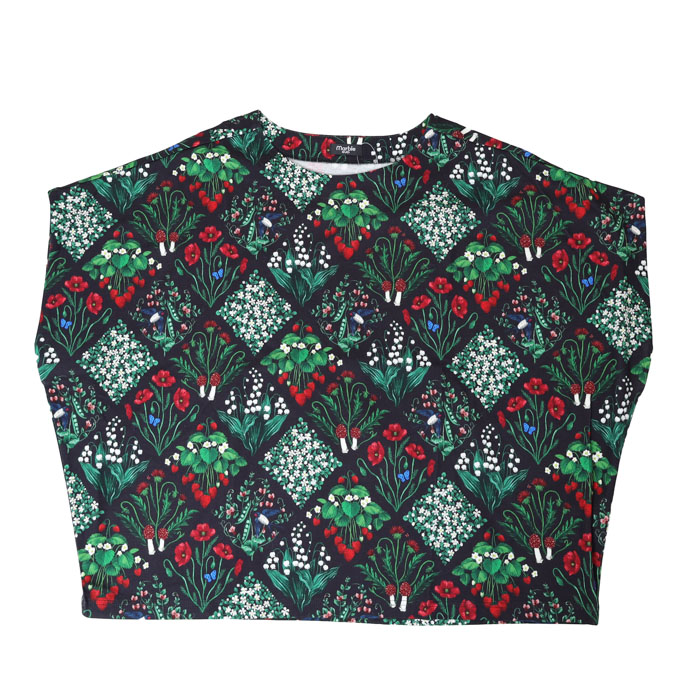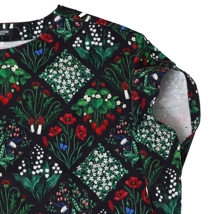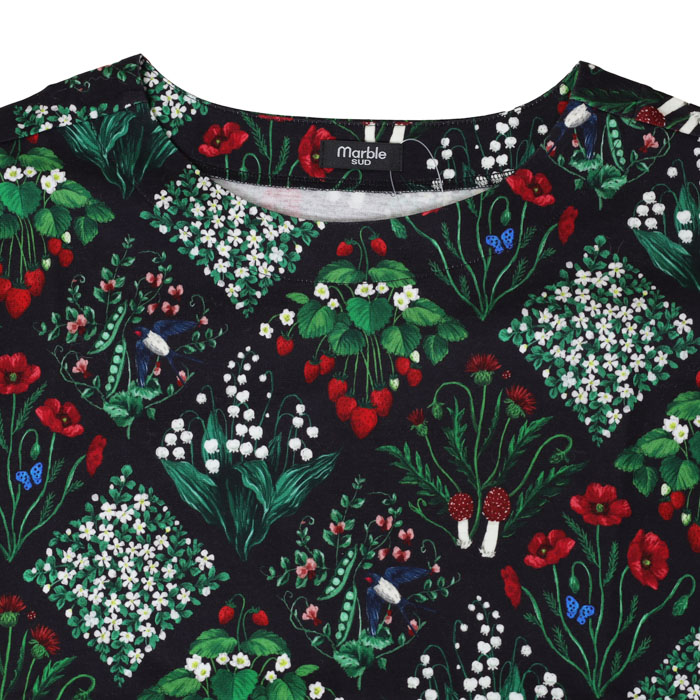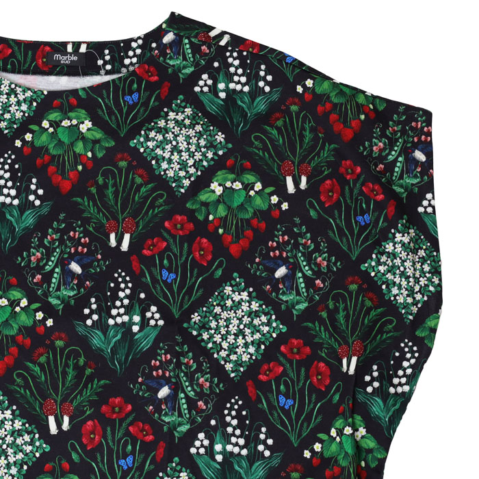 02GS002062 botanical patchwork アンプルTEE は、marble SUD【マーブルシュッド】のリアルタッチで細密に描き込んだ森の野草をパッチワークのように並べた華やかなテキスタイルを使用したTシャツ。草花の間にはツバメやきのこが隠れています。シルエットと滑らかな表面感がきれいなコットンカットソー素材です。