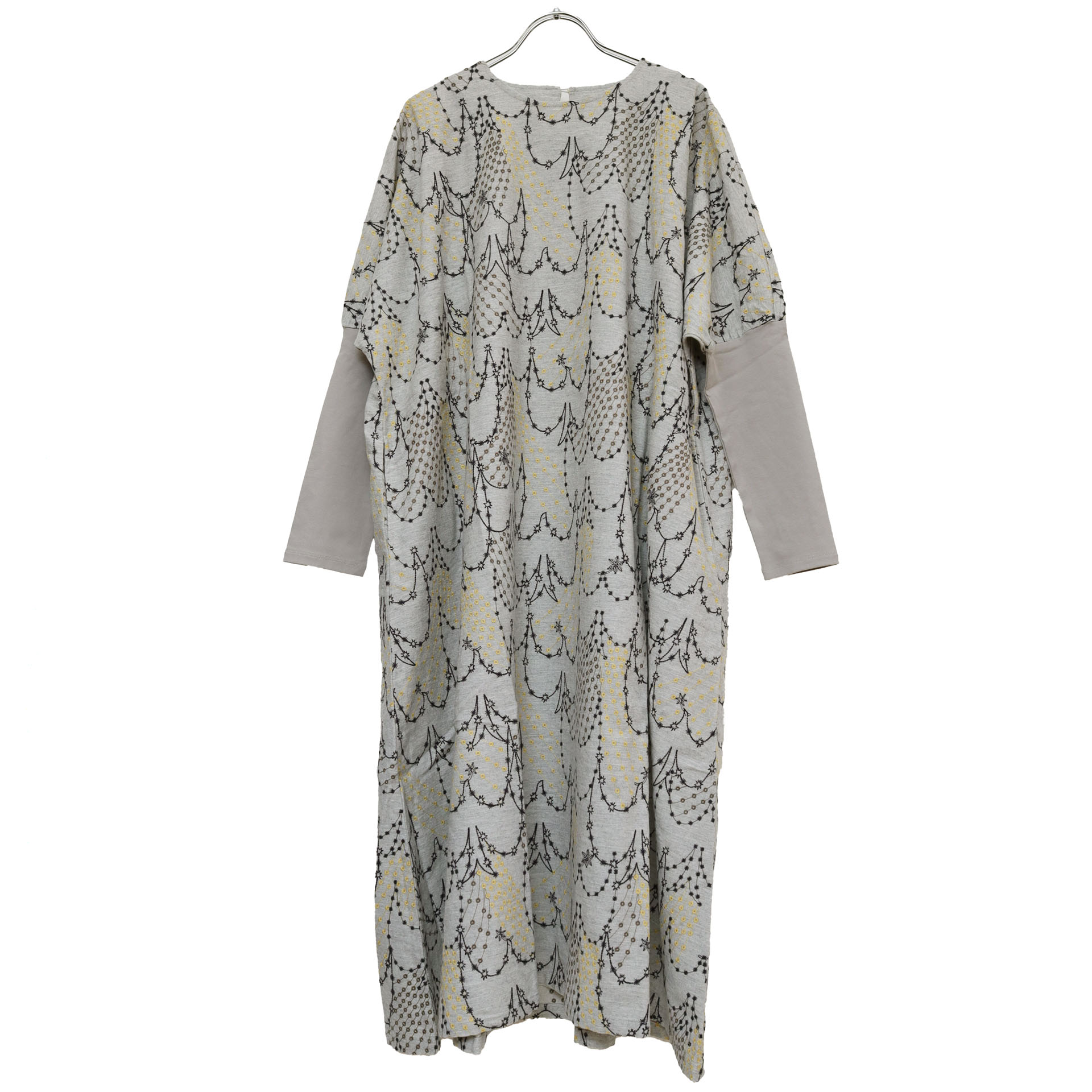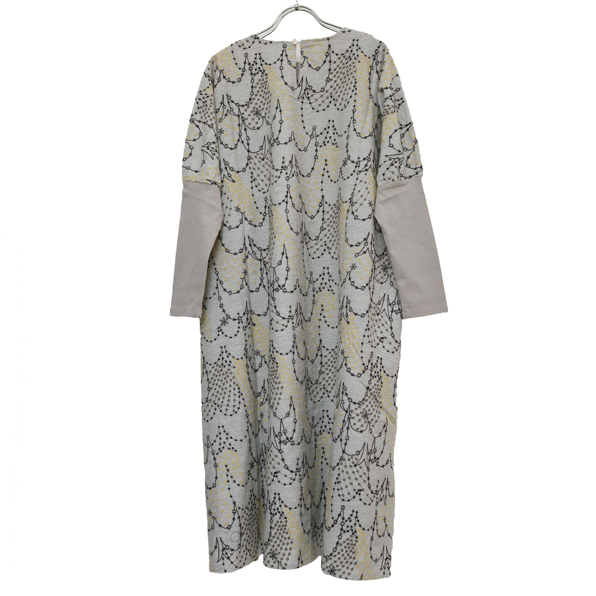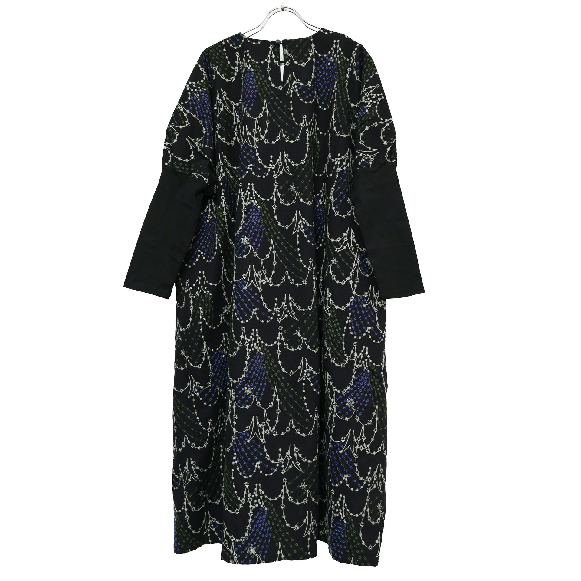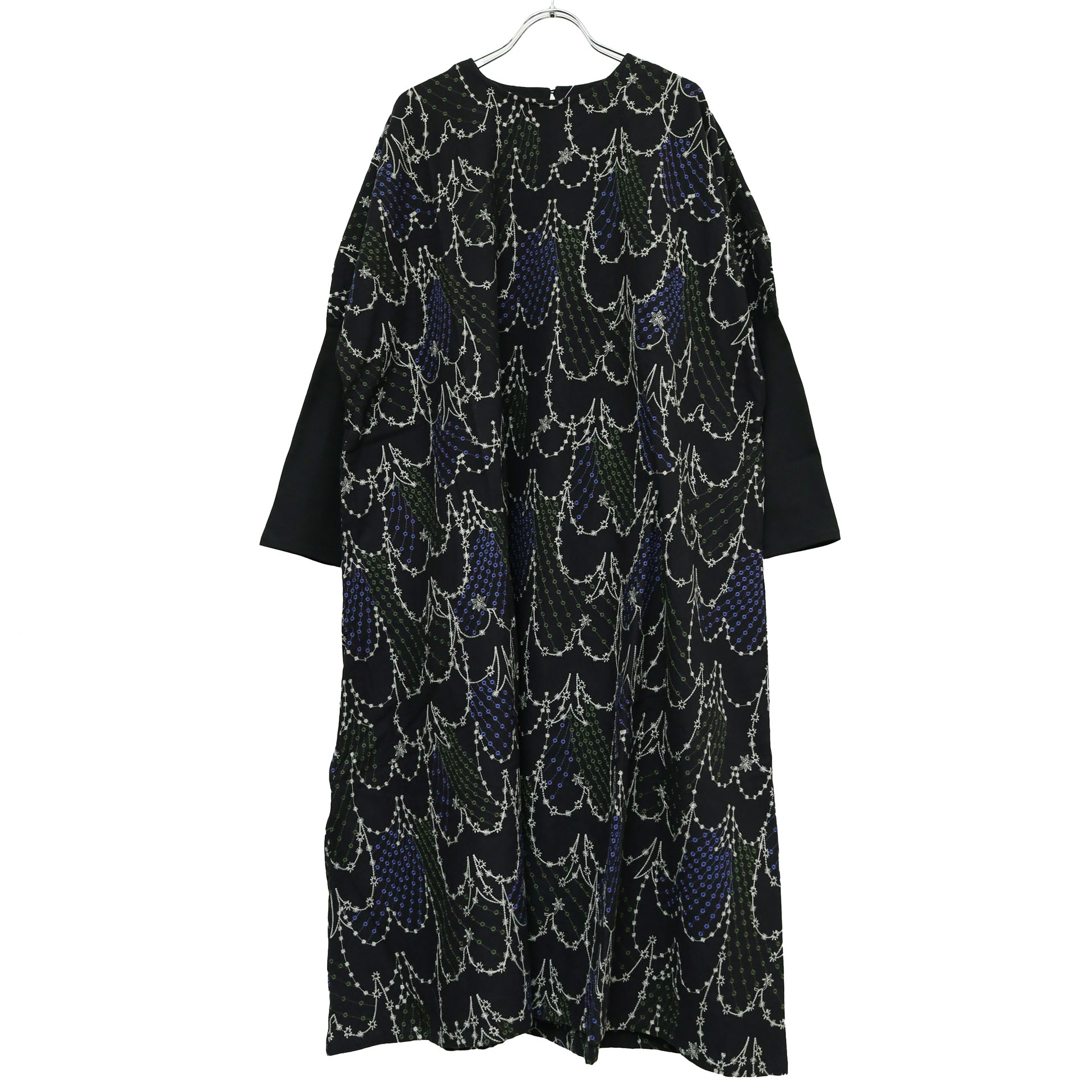 03FF074012 EMB swallow ソデリブワンピースは、marble SUD【マーブルシュッド】の幸運を象徴する渡り鳥であるツバメとキラキラとした星のシャワーを表現した、どこか幻想的で繊細な刺繍のテキスタイルを使用したワンピース。やわらかくほっこりとしたコットン素材です。袖口の長いリブがアクセントになるフレアワンピース。リブは伸縮性のあるフライス素材を使用し、袖のプッシュアップがしやすく、袖丈をアレンジしてお召しいただけます。リブの上部分は少しパフ袖のようなふんわりとしたシルエットを作り、女性らしさを演出。たっぷりとした生地の分量感があり、歩いた時の揺れ感が綺麗な一着です。ポケットが付いているのも嬉しいポイントです。