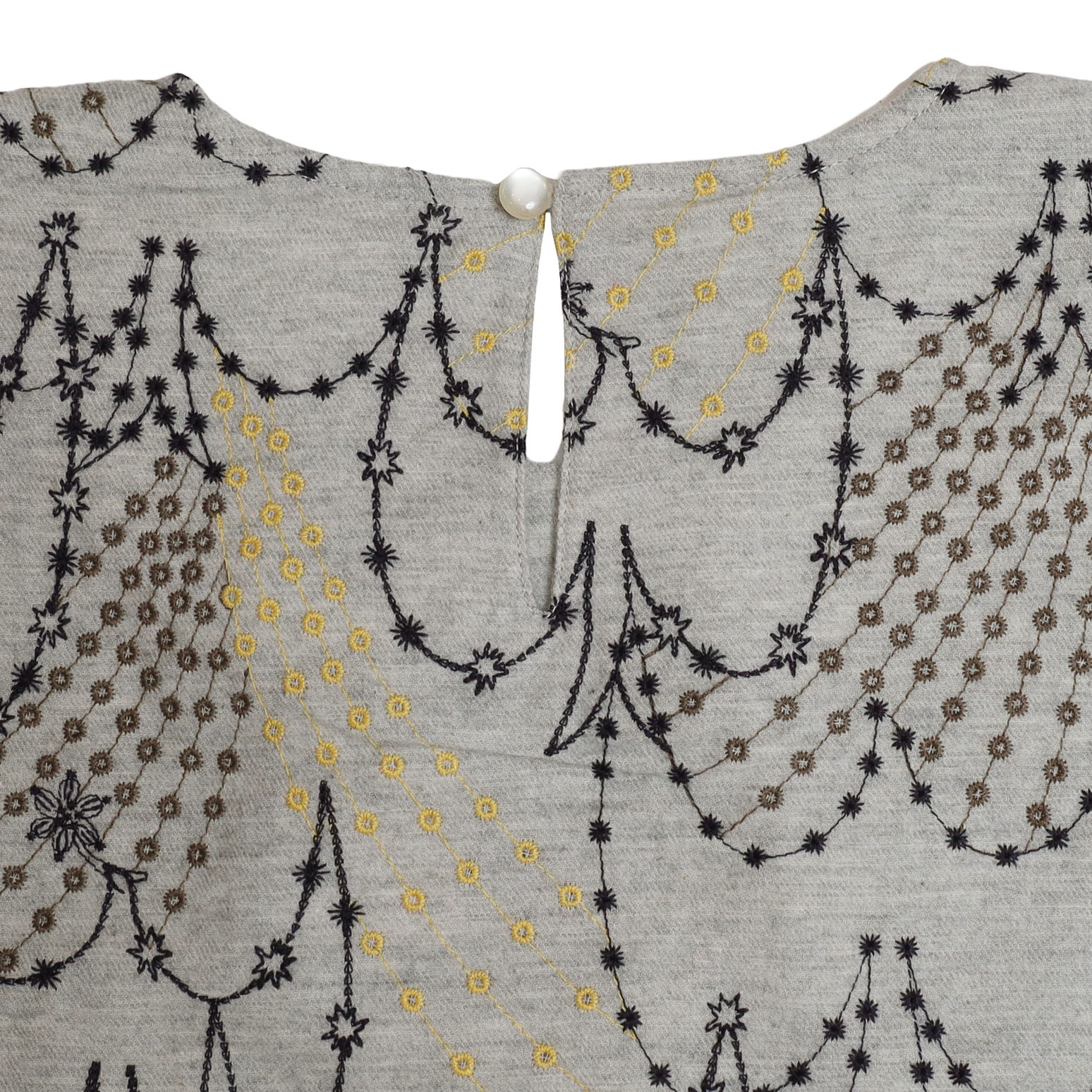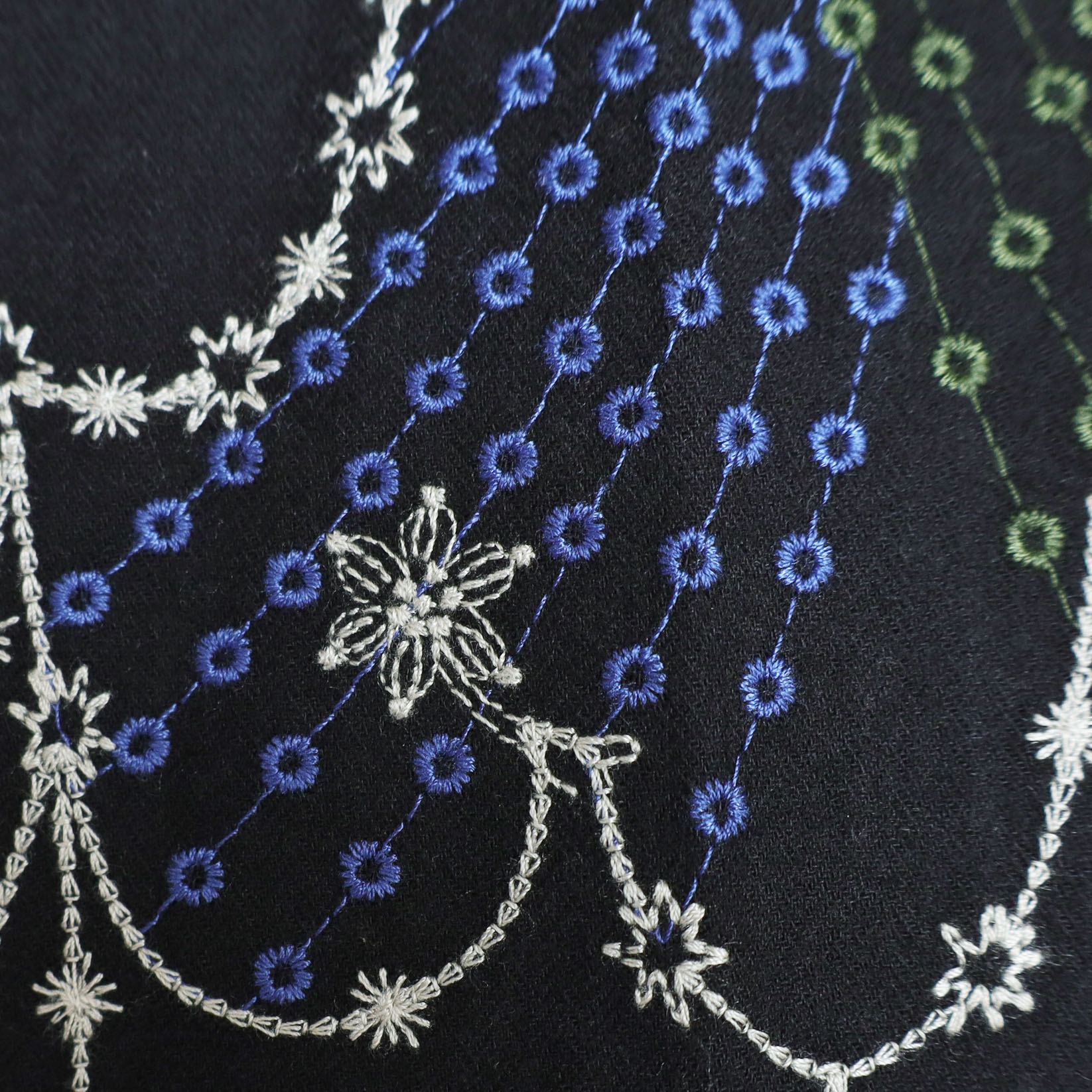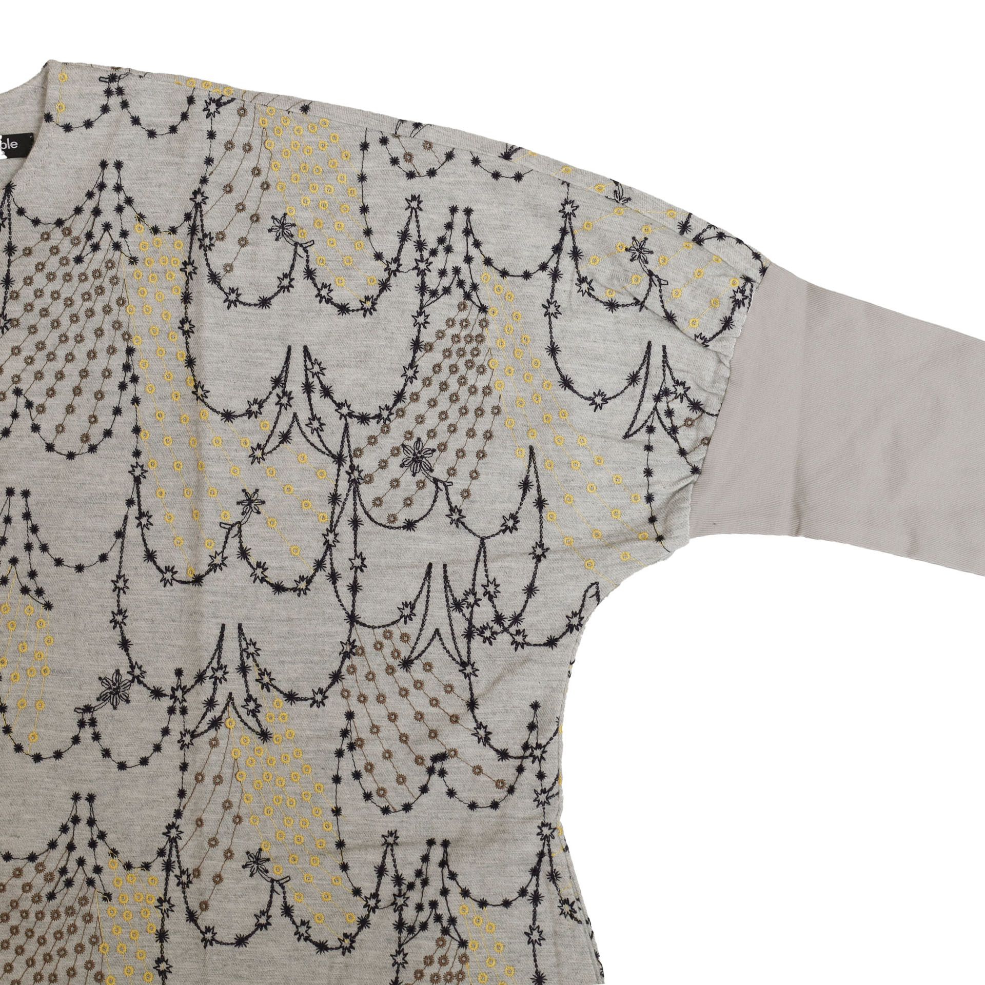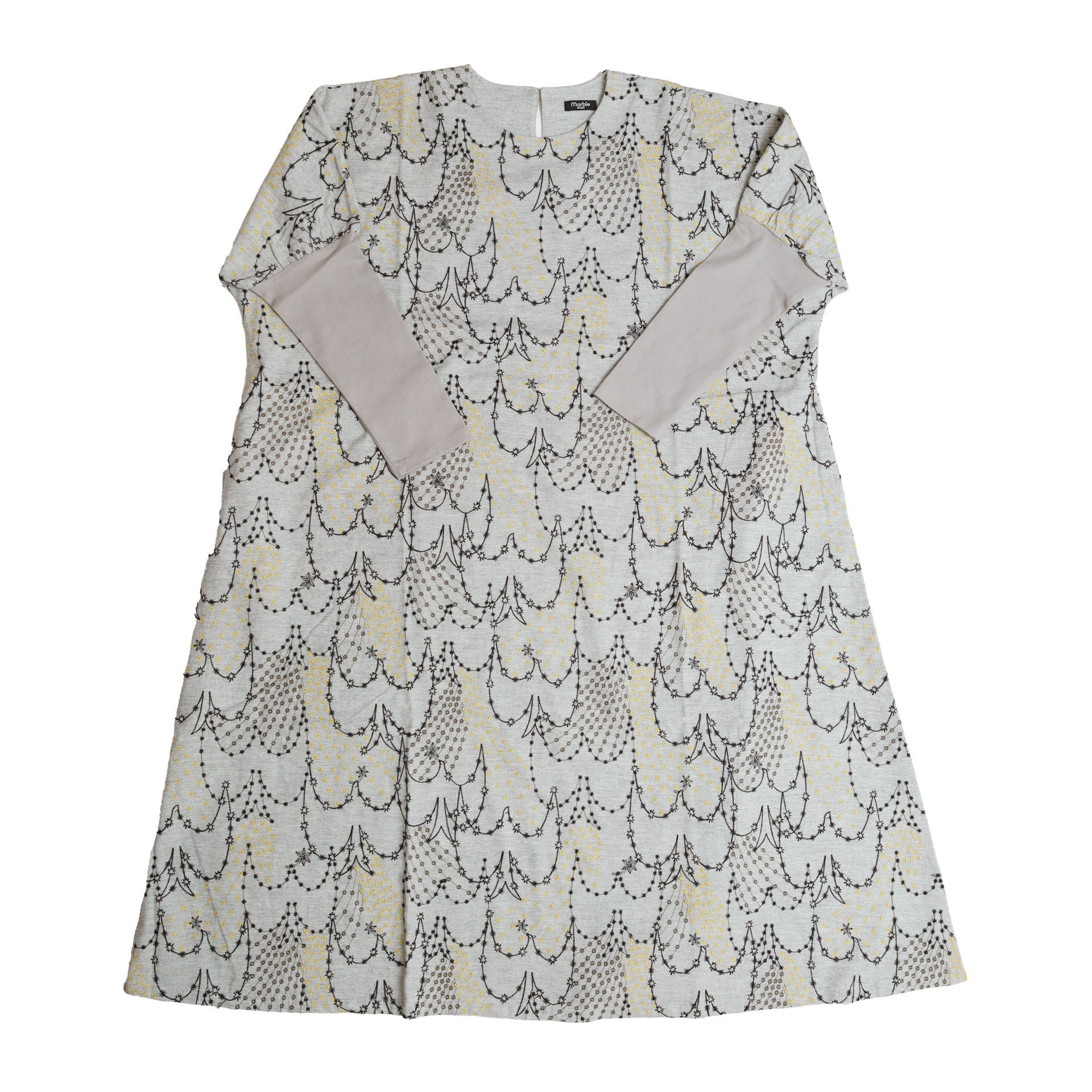 03FF074012 EMB swallow ソデリブワンピースは、marble SUD【マーブルシュッド】の幸運を象徴する渡り鳥であるツバメとキラキラとした星のシャワーを表現した、どこか幻想的で繊細な刺繍のテキスタイルを使用したワンピース。やわらかくほっこりとしたコットン素材です。袖口の長いリブがアクセントになるフレアワンピース。リブは伸縮性のあるフライス素材を使用し、袖のプッシュアップがしやすく、袖丈をアレンジしてお召しいただけます。リブの上部分は少しパフ袖のようなふんわりとしたシルエットを作り、女性らしさを演出。たっぷりとした生地の分量感があり、歩いた時の揺れ感が綺麗な一着です。ポケットが付いているのも嬉しいポイントです。