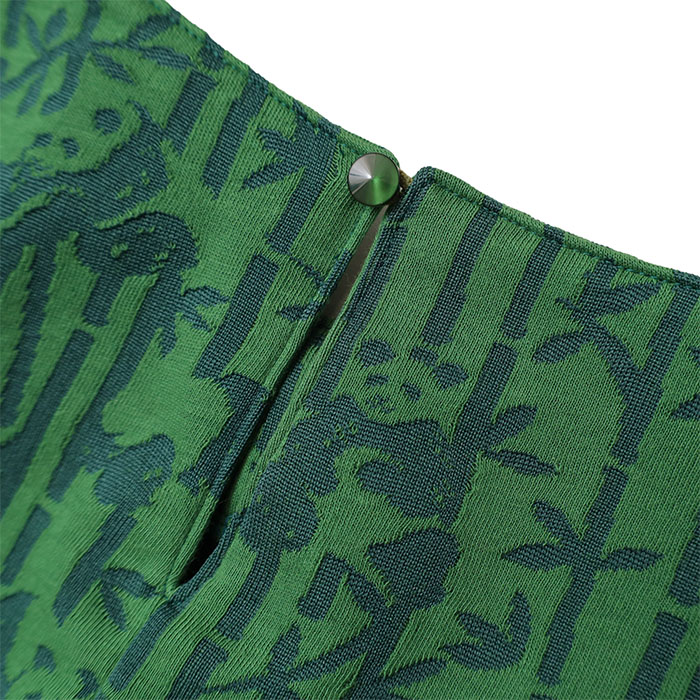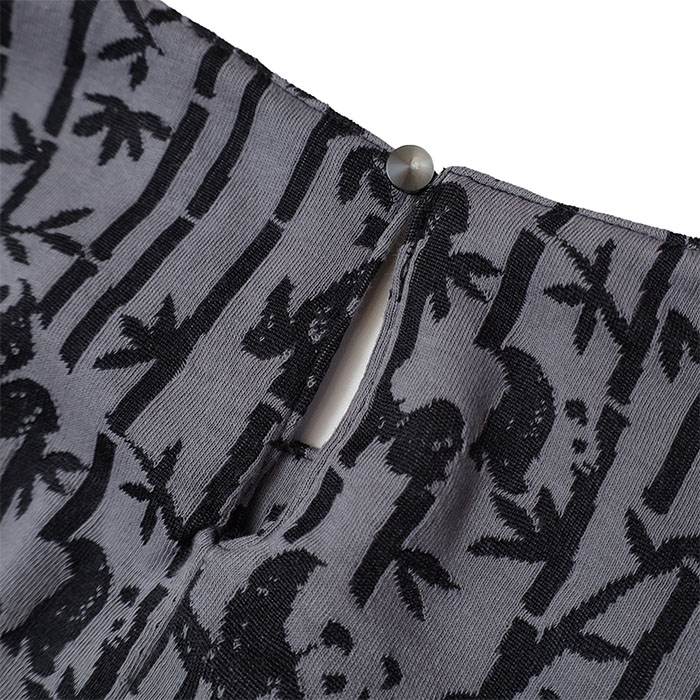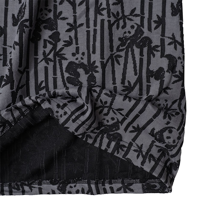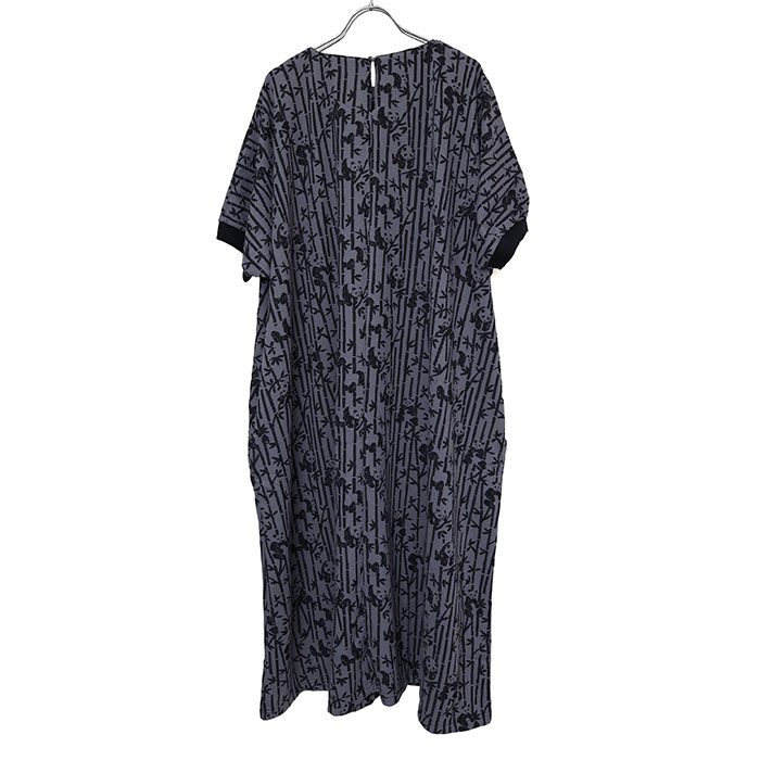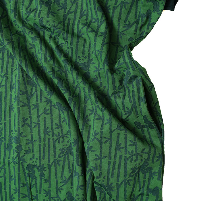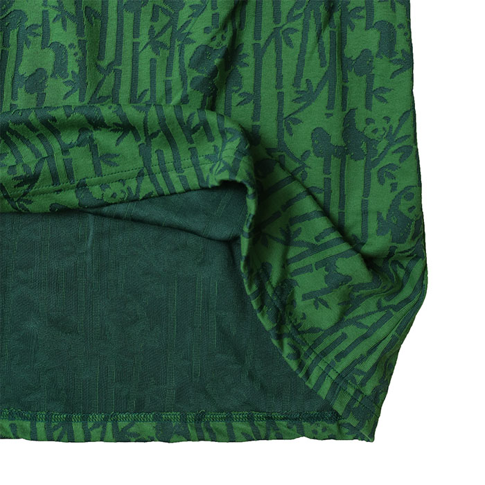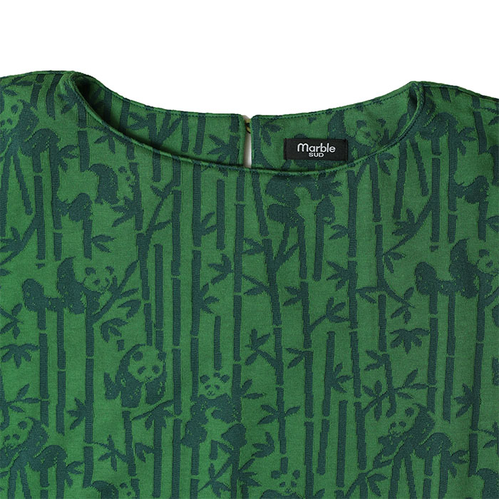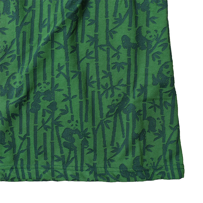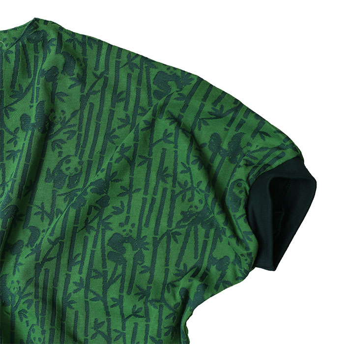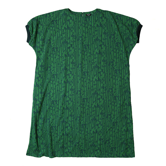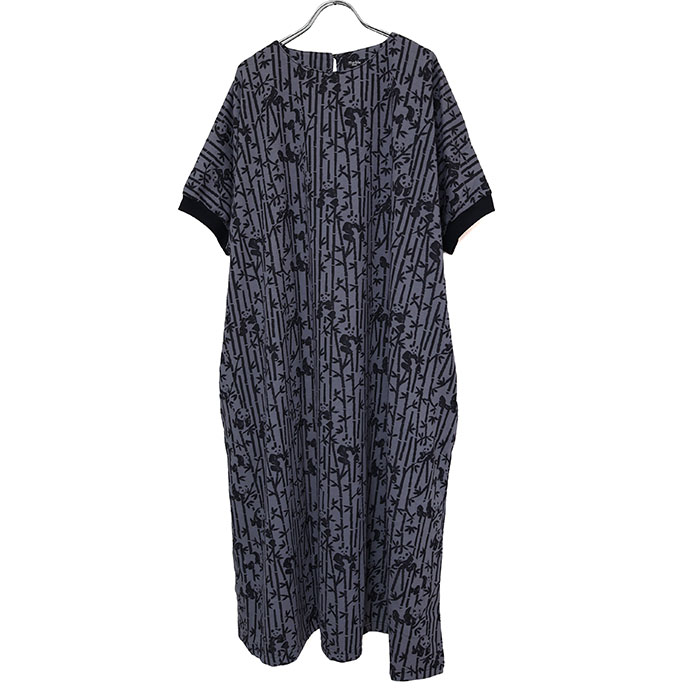 03GS043071 bamboo panda JQ ソデリブワンピース は、marble SUD【マーブルシュッド】の竹林のストライプの中でのんびりパンダがごろごろかくれんぼしている、どこかオリエンタルな雰囲気のモチーフが、ロングシーズン着回せる軽い着心地のジャカード生地のテキスタイルになり、その生地を使用したワンピース。ポリエステルとコットンを組み合わせた独特な立体感が魅力の素材です。