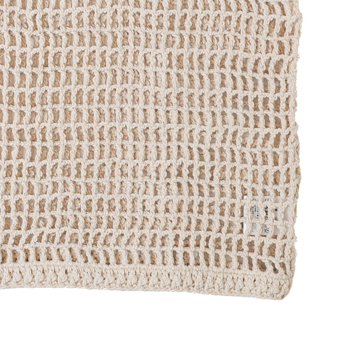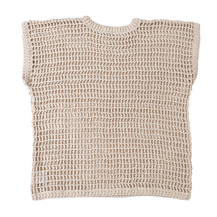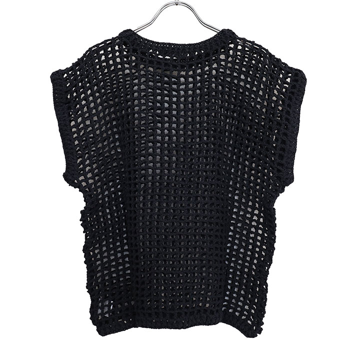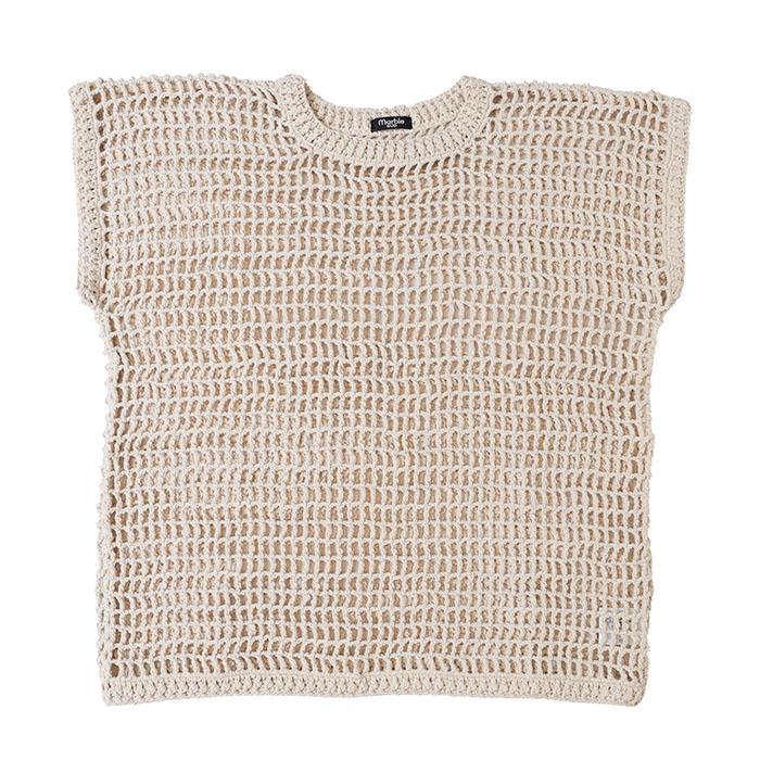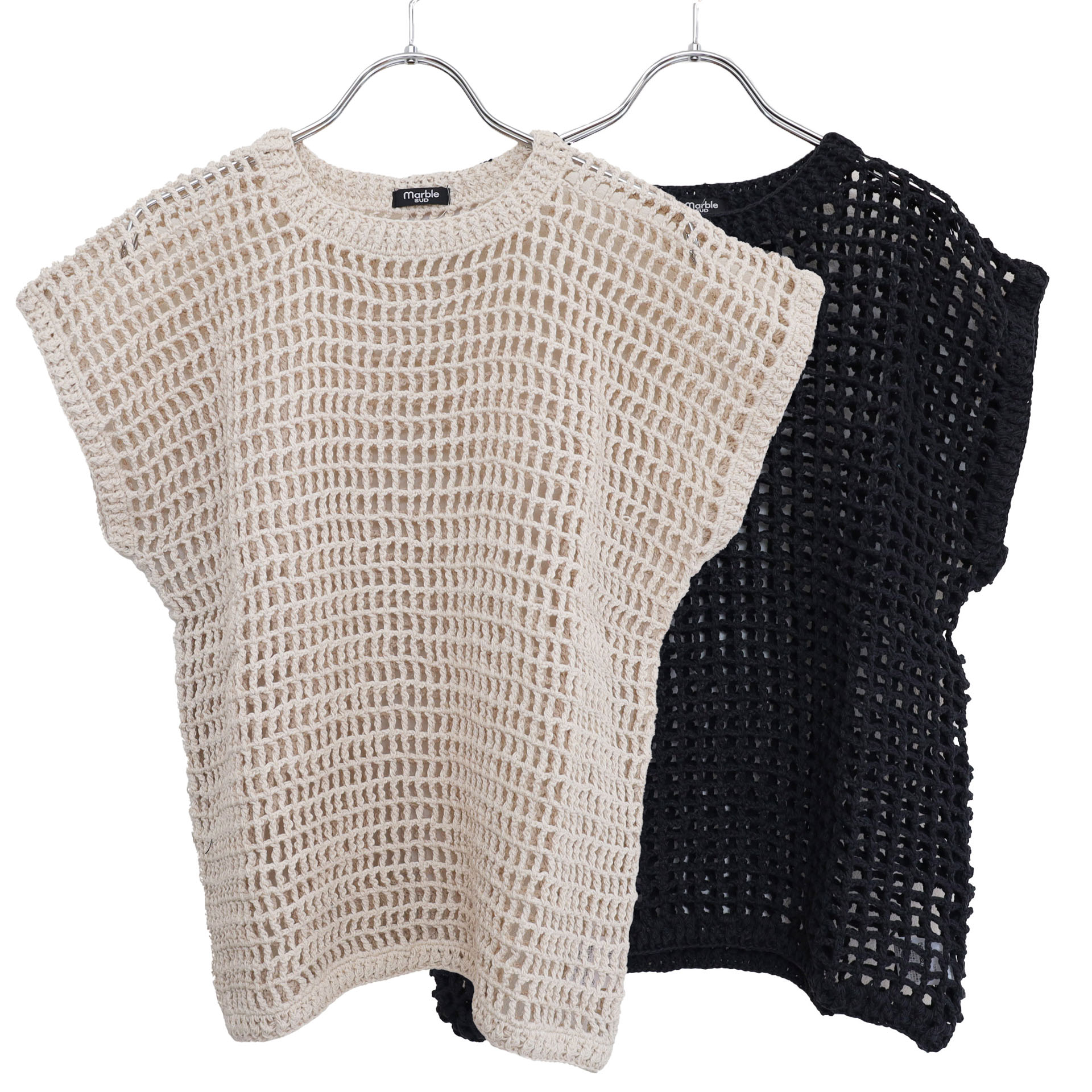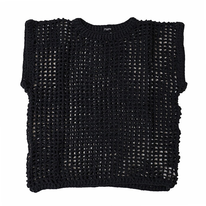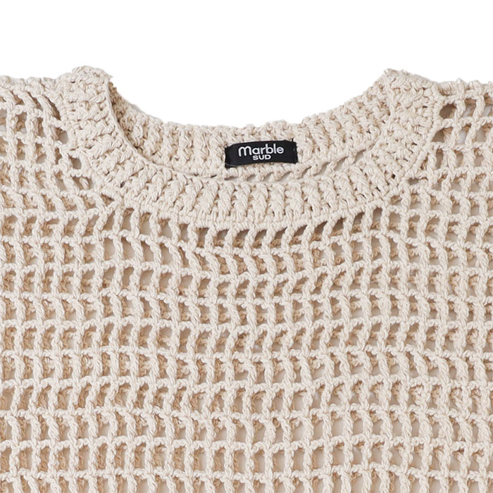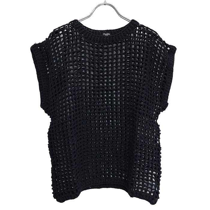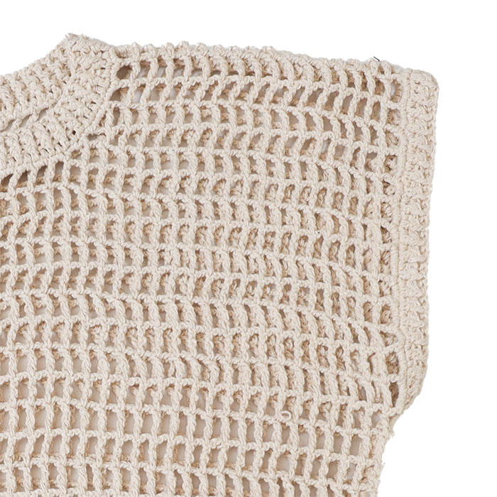 04GS030105 すかしニット ベスト は、marble SUD【マーブルシュッド】の手編みならではの温もりを感じる、ざっくりとしたメッシュ編みのニットベスト。 編み目が大きく、インナーとの重ね着で表情の変化を楽しめる一枚です。