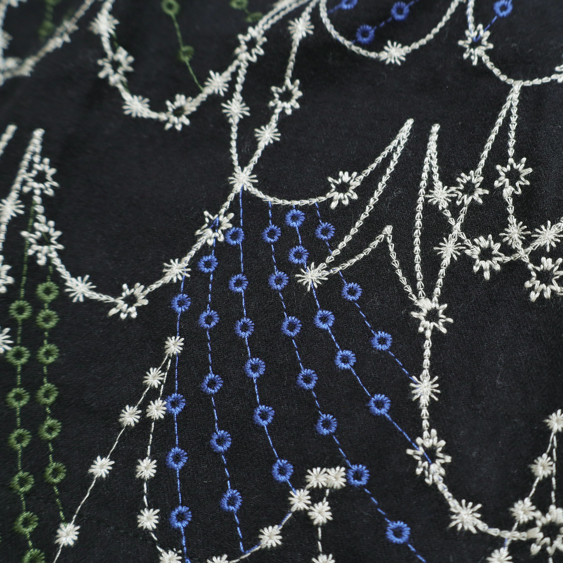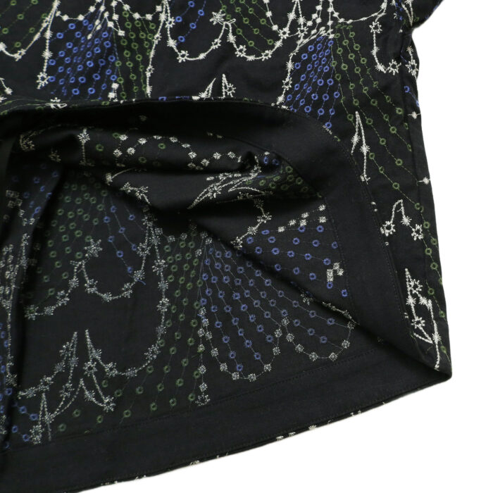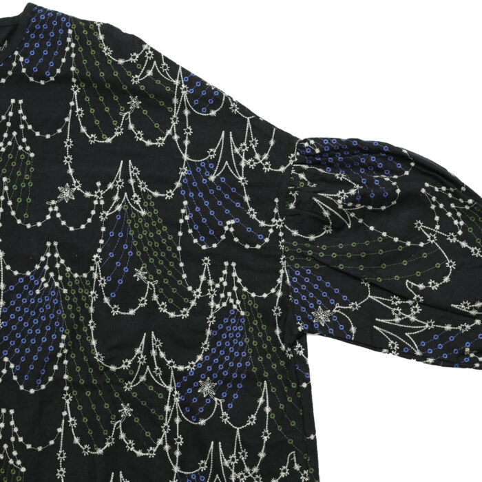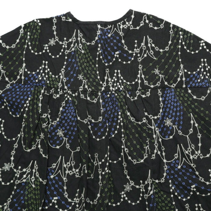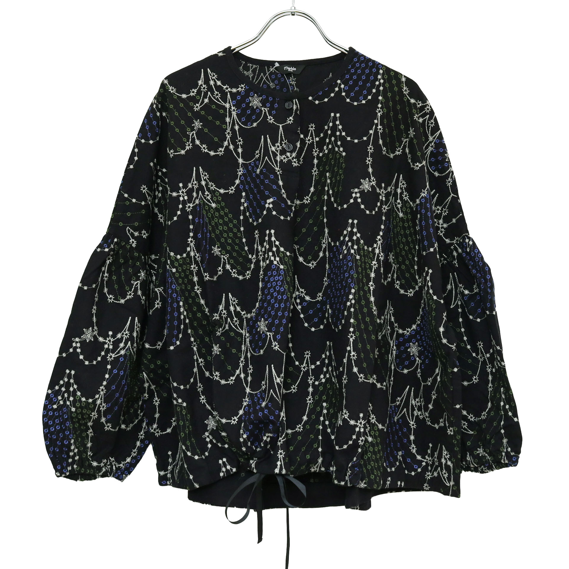 05FF074010 EMB swallow ストリングシャツは、marble SUD【マーブルシュッド】の幸運を象徴する渡り鳥であるツバメとキラキラとした星のシャワーを表現した、どこか幻想的で繊細な刺繍のテキスタイルを使用したシャツ。やわらかくほっこりとしたコットン素材です。前裾に通した紐で絞りを入れてシルエットの変化を楽しめるシャツ。前後差のある着丈は、パンツ・スカート共に合わせやすく、裾を絞ってトップスとして、ボタンを開けて羽織りとしてもお召しいただけます。前後差のある着丈と立体的なシルエットがこなれた雰囲気を演出します。