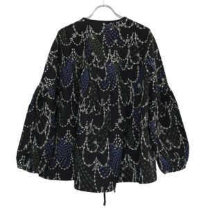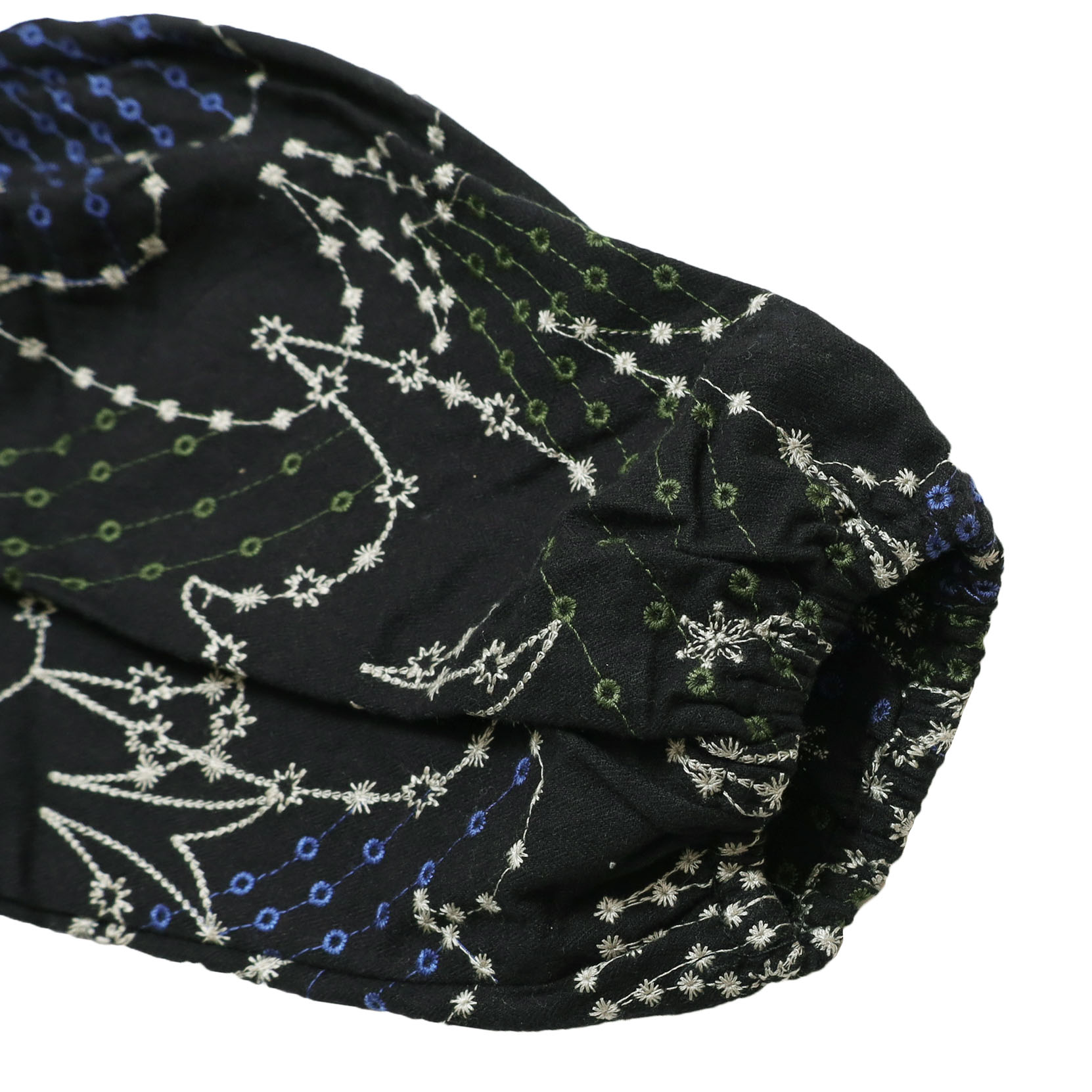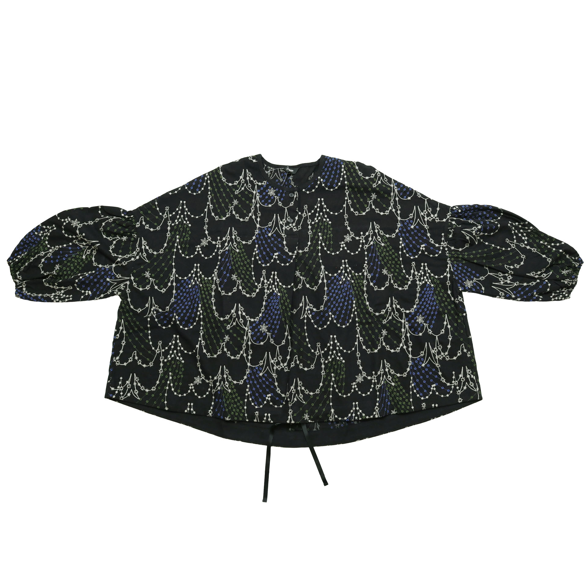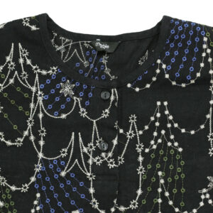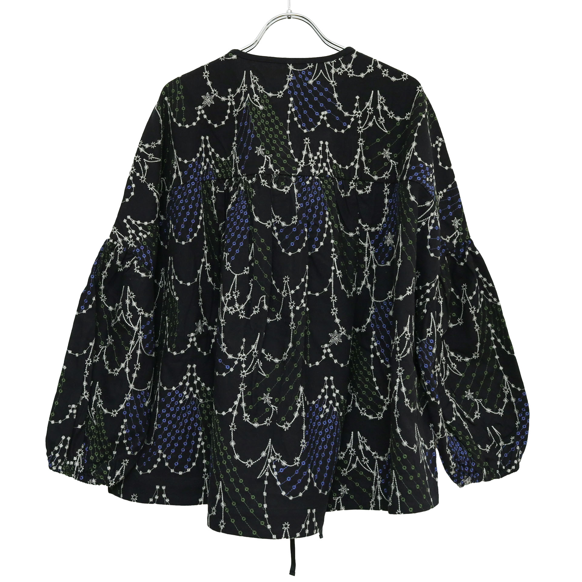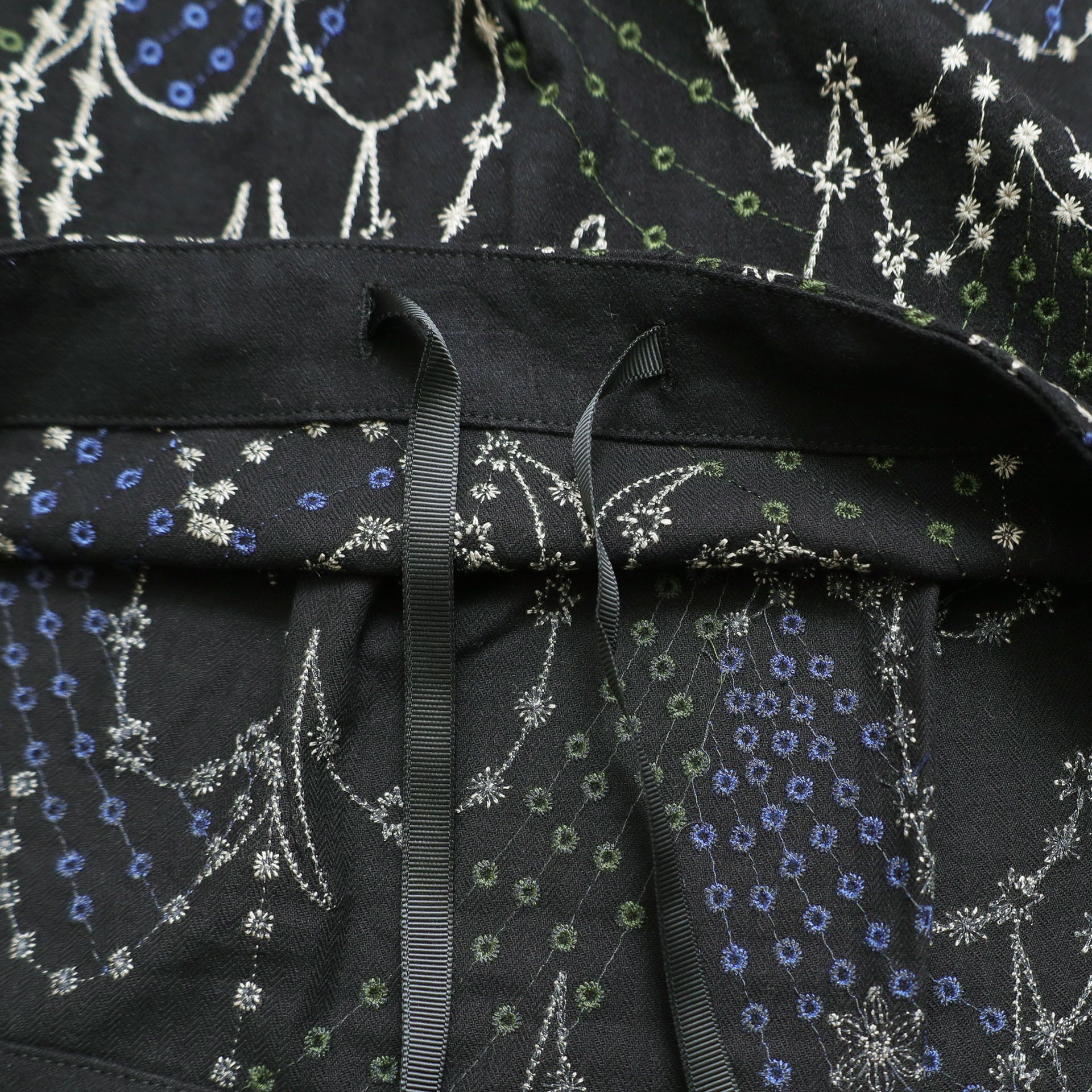 05FF074010 EMB swallow ストリングシャツは、marble SUD【マーブルシュッド】の幸運を象徴する渡り鳥であるツバメとキラキラとした星のシャワーを表現した、どこか幻想的で繊細な刺繍のテキスタイルを使用したシャツ。やわらかくほっこりとしたコットン素材です。前裾に通した紐で絞りを入れてシルエットの変化を楽しめるシャツ。前後差のある着丈は、パンツ・スカート共に合わせやすく、裾を絞ってトップスとして、ボタンを開けて羽織りとしてもお召しいただけます。前後差のある着丈と立体的なシルエットがこなれた雰囲気を演出します。
