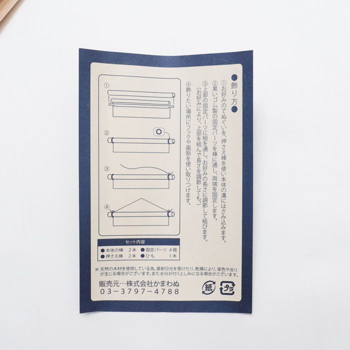 NEW 06116344 白木タペストリー棒 サイズ F カラー 白木 在庫有り ¥1,980 ¥1,980 ¥1,980(税込) SOLD OUT この商品に関するお問い合わせ 数量 この商品に関するお問い合わせ カラー白木 素材木製 ブナ サイズ約40.5cm✕φ1.8cm 商品説明 06116344 白木タペストリー棒は、かまわぬ【かまわぬ】の家具などによく用いられるブナの木を使ったタペストリー棒です。木の質感を生かしてクリア塗装で仕上げられています。ナチュラルで軽やかな印象で淡い色合いのてぬぐいにも合わせやすく、飾る場所も選びません。