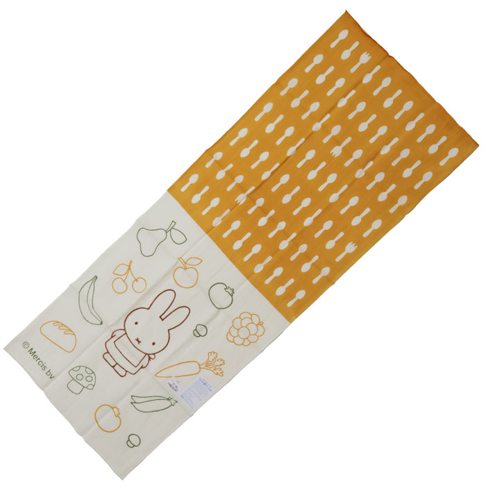 06166417 お食事ミッフィーは、かまわぬ【かまわぬ】のたべものに囲まれて楽しい食事の時間を待っているミッフィー柄の手ぬぐい。カトラリー柄との切り替えのデザインなので、半分に折り畳んでランチョンマットにすれば雰囲気の違った楽しみが。また、お子様には半分でカットして、ふたつの小さなハンカチとしてもお使いいただけます。