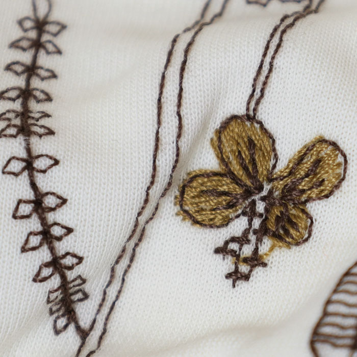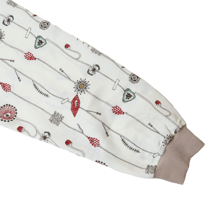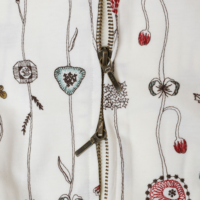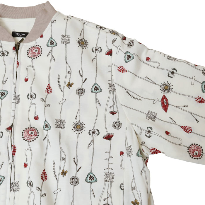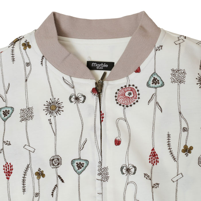06GS073019 Oshibana stripe ブルゾン は、marble SUD【マーブルシュッド】の押し花がきちんと並んだストライプ調の刺繍のテキスタイルが目を惹くブルゾン。まだまだ肌寒い季節に大活躍の、シルエット感がきれいなしっかりとしたカットソー素材です。