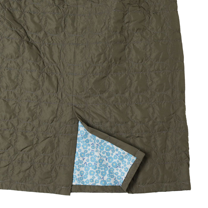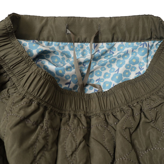 07FF083062 シマエナガキルト スカートは、marble SUD【マーブルシュッド】のまんまるふわふわで愛らしい、冬の妖精シマエナガをキルト素材にしたキュートなスカート。薄くて軽いけれどしっかりあたたかい、便利な機能素材のキルトシリーズ。キルティングの中綿には、赤外線を吸収して熱に換える高機能蓄熱素材の「LITHERMO®」を使用。程よい厚さのキルティングで、軽いのにあったか!が叶います。重ね着をする機会が増える冬には嬉しい生地です。定番のボックス型スカート。ややAラインの細めのシルエットで、ゆったりしたトップスと合わせやすいアイテムです。軽い着心地でありながら、発熱綿入りで保温性も抜群の赤外線を吸収して熱に換える高機能蓄熱素材の「LITHERMO®」を使用。裏地には”flower shower”を採用しています。両脇にポケット付き。後ろゴムギャザーで内紐付きです。