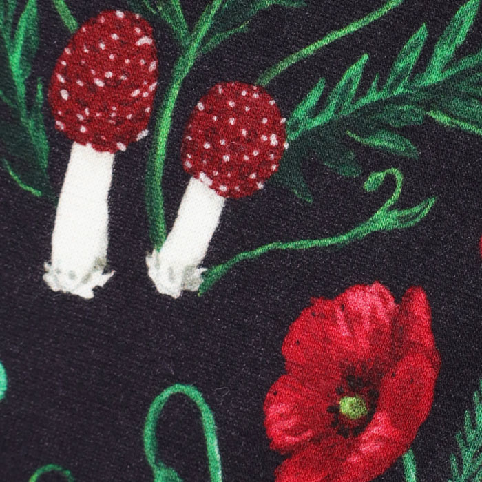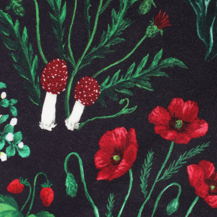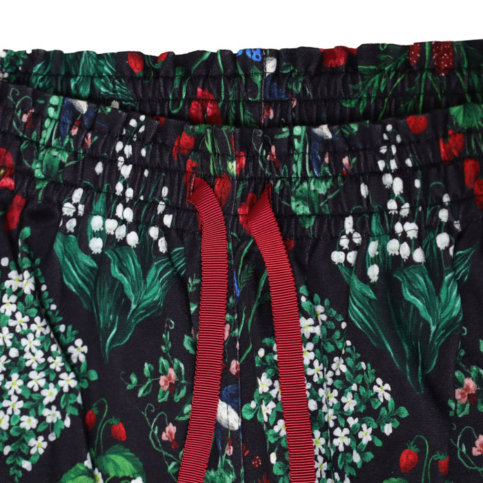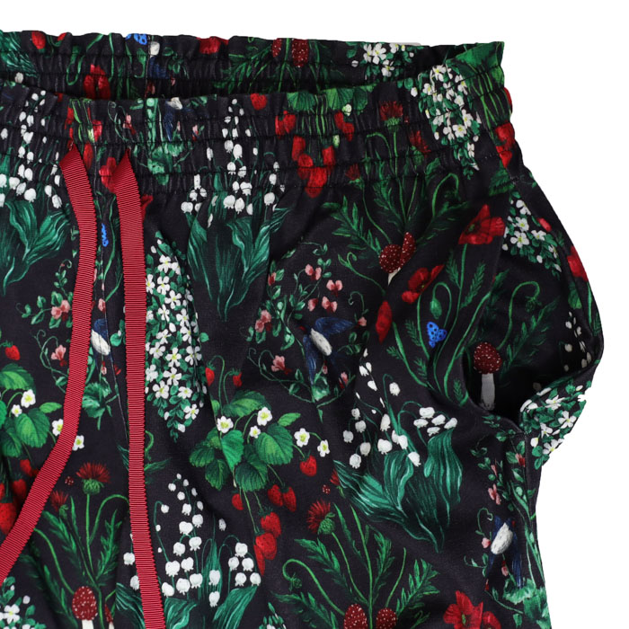 07GS002066 botanical patchwork Bigパンツ は、marble SUD【マーブルシュッド】のリアルタッチで細密に描き込んだ森の野草をパッチワークのように並べた華やかなテキスタイルを使用したパンツ。草花の間にはツバメやきのこが隠れています。シルエットと滑らかな表面感がきれいなコットンカットソー素材です。