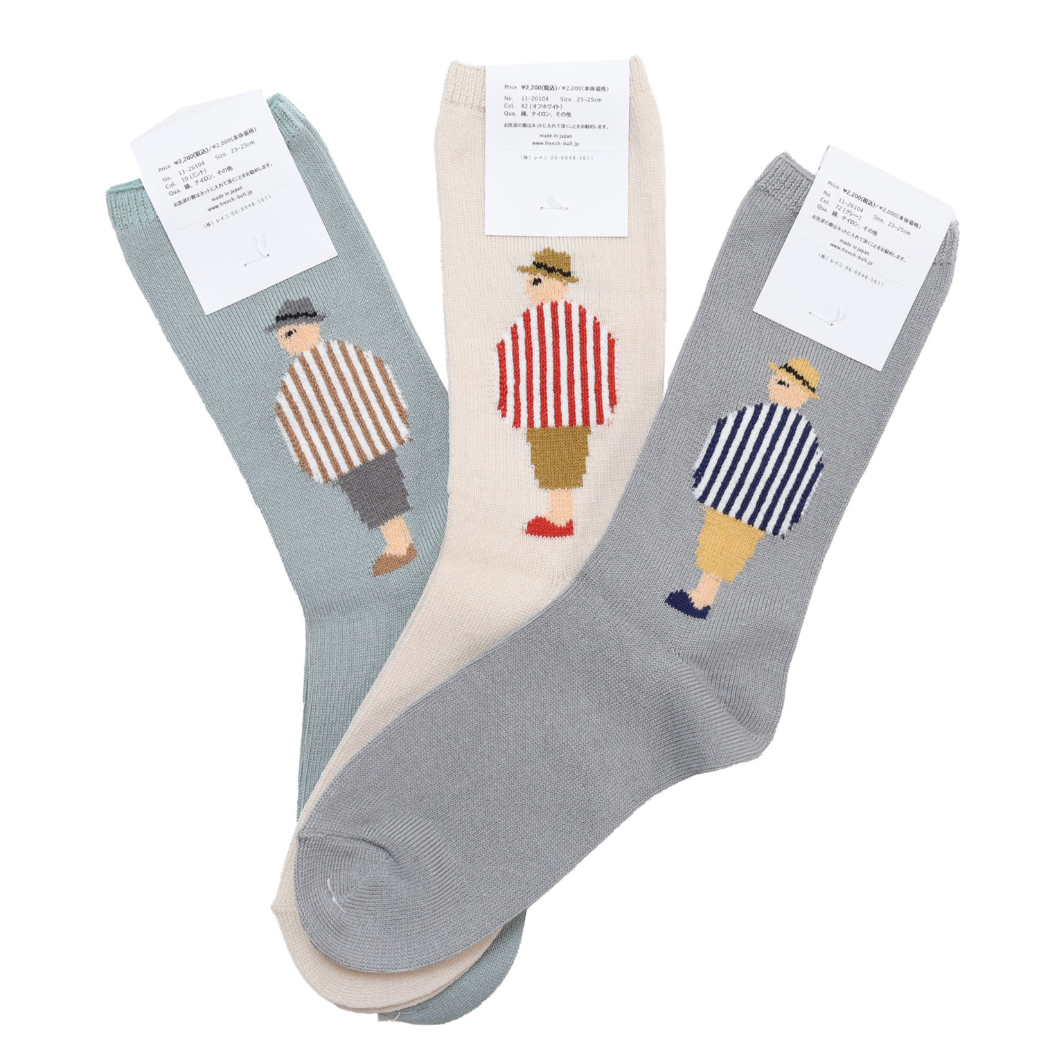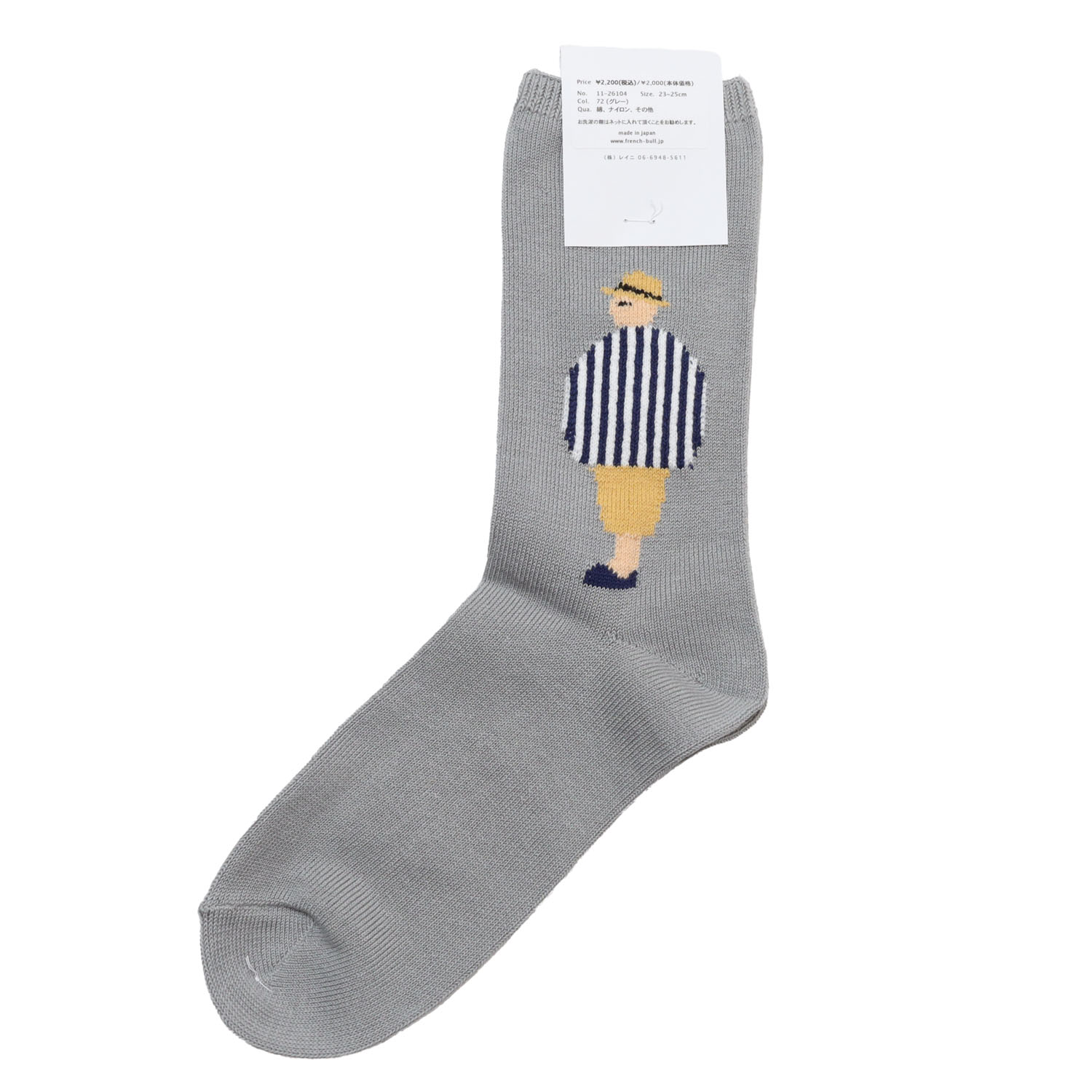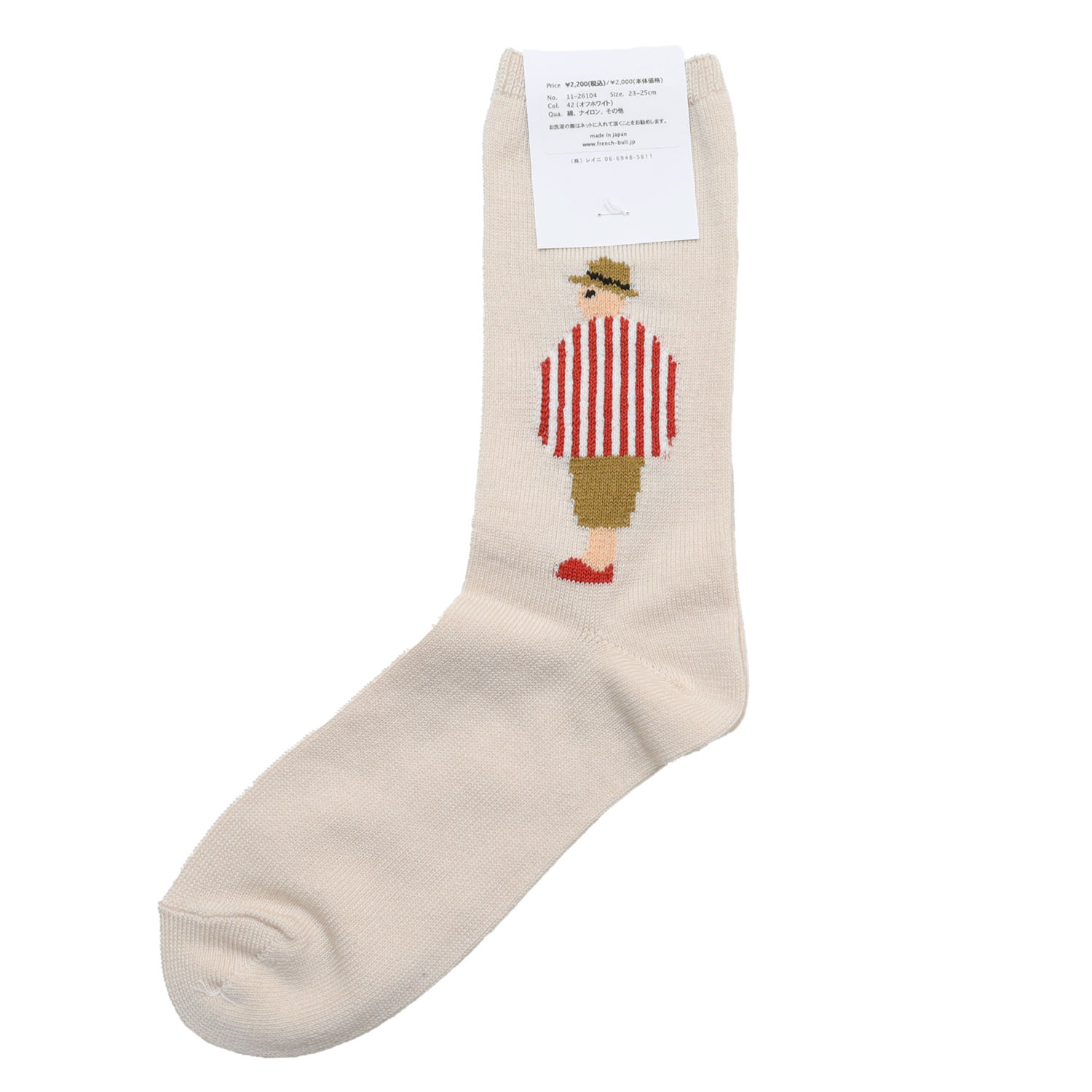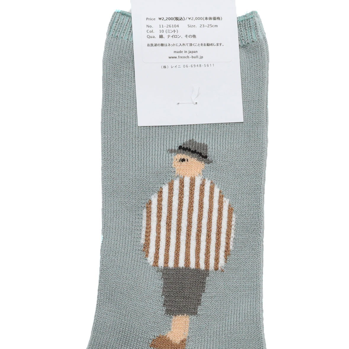 11-26104 カップルソックス vacances は、French bull【フレンチブル】の男性と女性がモチーフで、左右で柄が変わる楽しいソックス。夏のバカンスらしい爽やかな装いに仕上げられています。光沢感のある綿シルケットを使用し、程よい厚みに編み立てられています。コーディネートのポイントになるアイテムです。