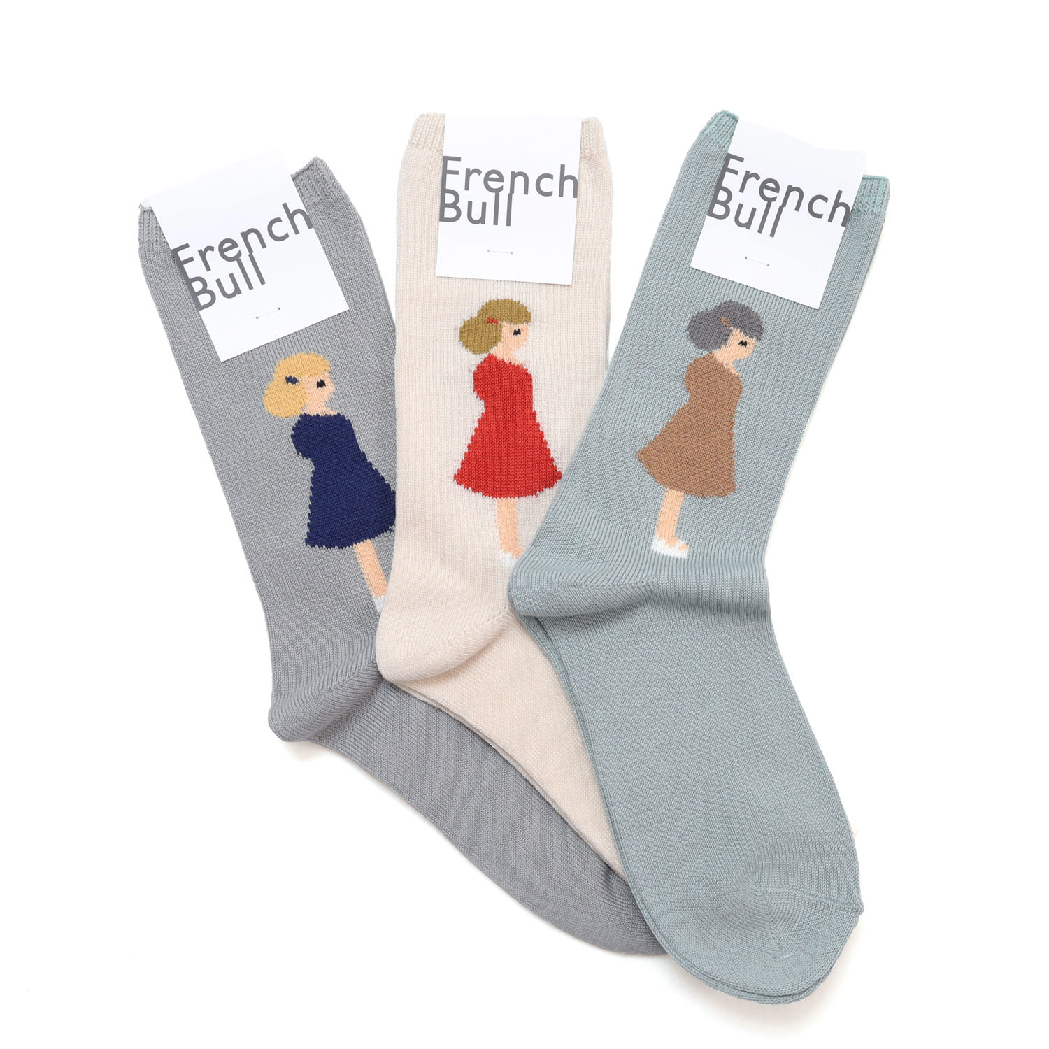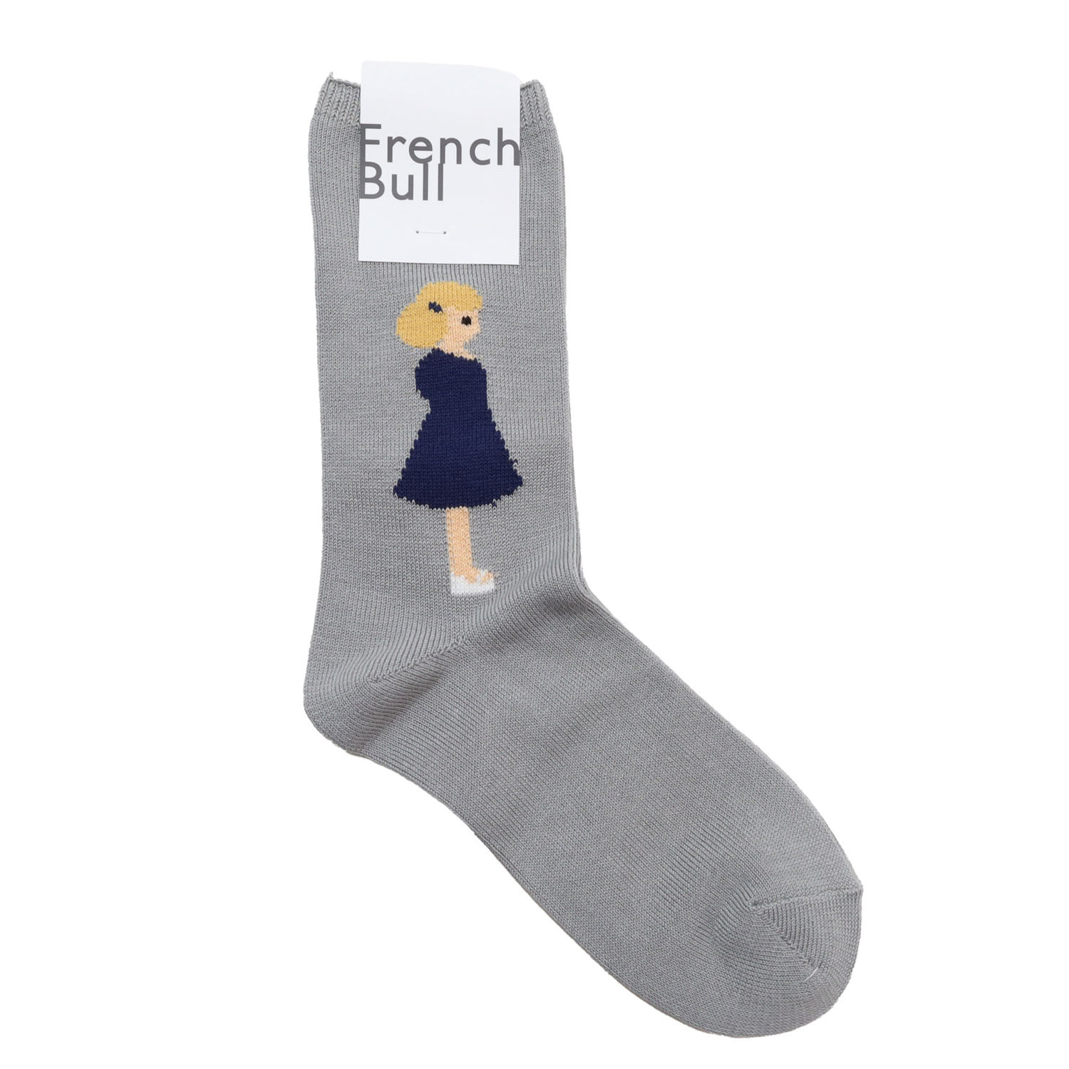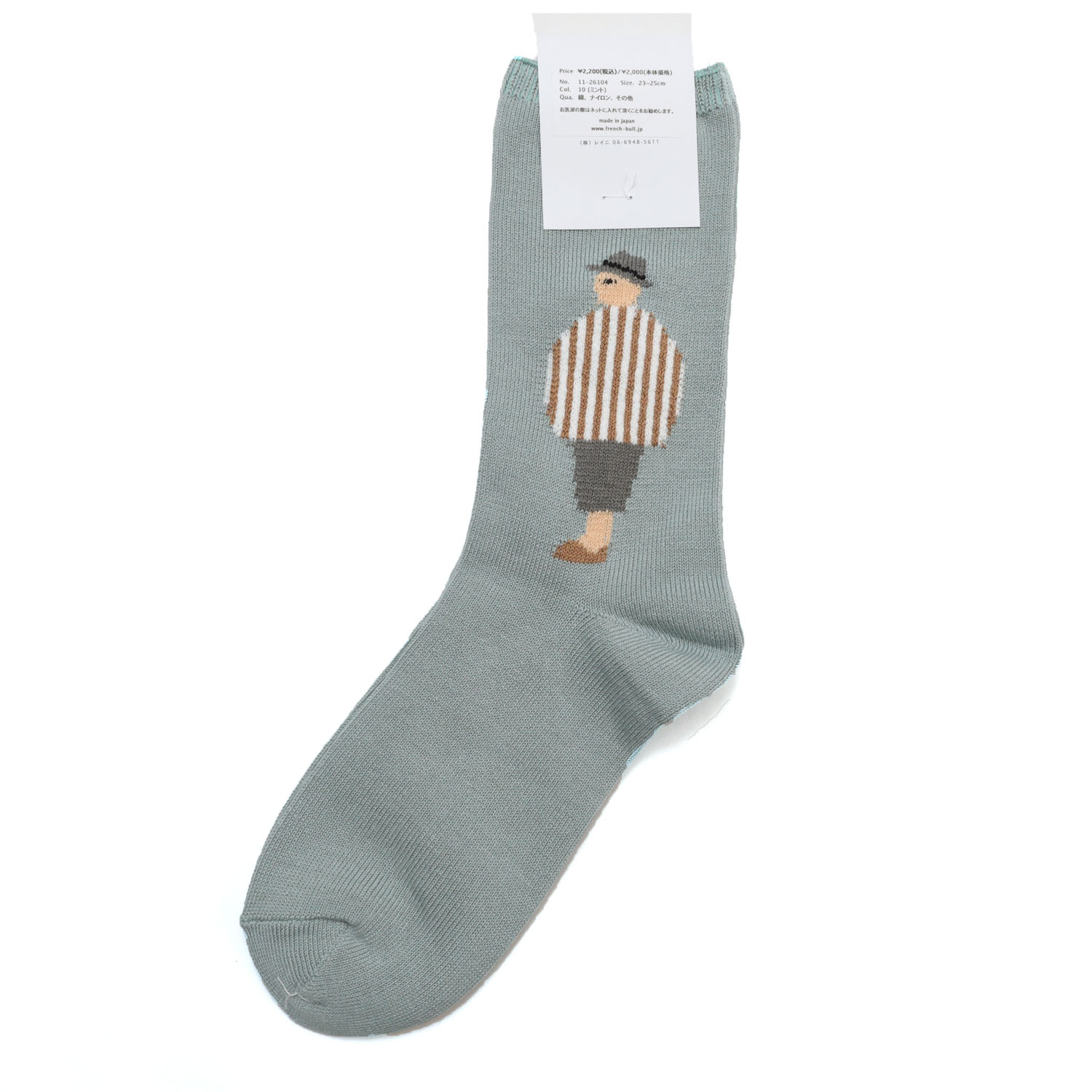 11-26104 カップルソックス vacances は、French bull【フレンチブル】の男性と女性がモチーフで、左右で柄が変わる楽しいソックス。夏のバカンスらしい爽やかな装いに仕上げられています。光沢感のある綿シルケットを使用し、程よい厚みに編み立てられています。コーディネートのポイントになるアイテムです。