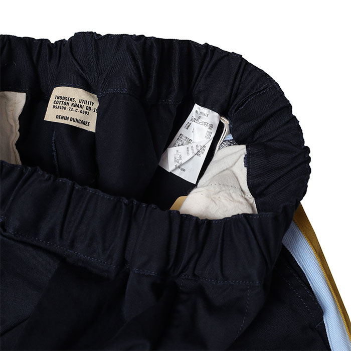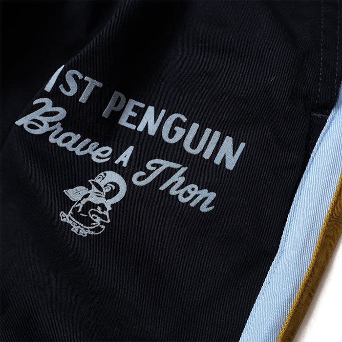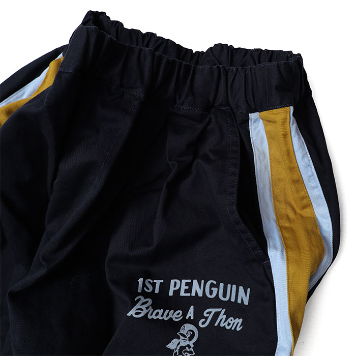 22580615 コンパクトチノ PENNIE リメイク ベースボールパンツは、DENIM DUNGAREE【デニム&ダンガリー】のアメリカ陸軍のチノ・パンツをベースボールパンツ風に脇に配色の切り替えを足し、チームキャラクター(架空)をプリントした一着。ウエストをゴム仕様にリサイズしたという設定のリメイクパンツです。
