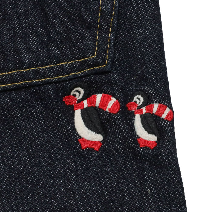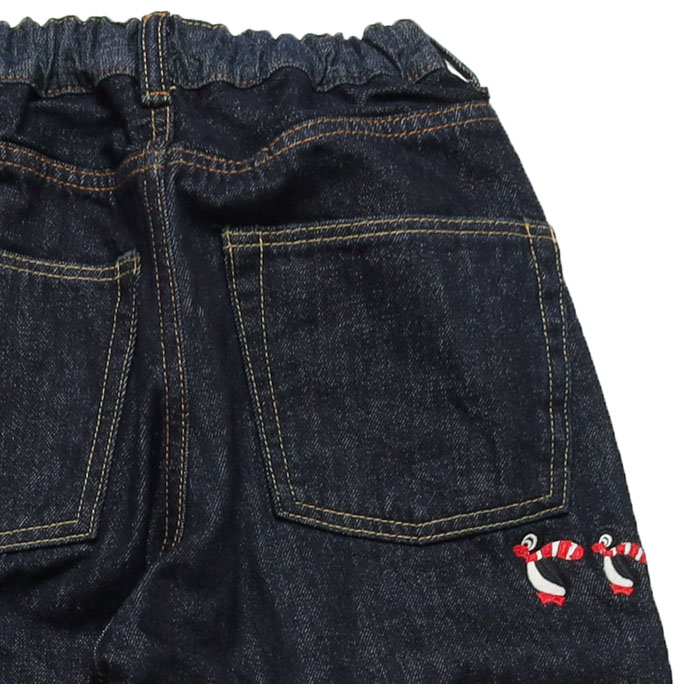 22580621 ウラキモウデニムイージーパンツは、DENIM DUNGAREE【デニム&ダンガリー】の裏起毛のデニムを使用した通常のデニムより暖かいデニムパンツ。前にタックが入って腰回りは大きくコーディネートし易いです。右後に親子ペンギンが可愛い一着です。