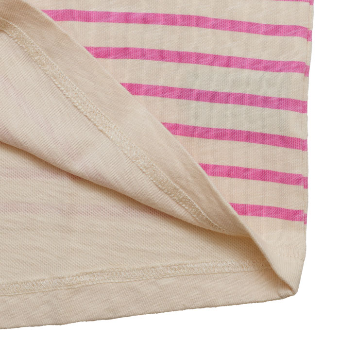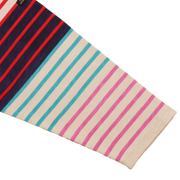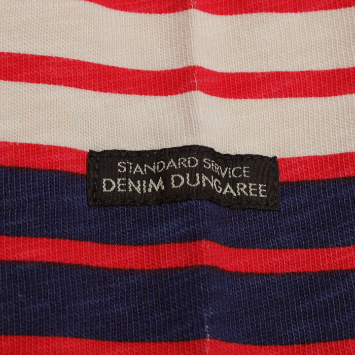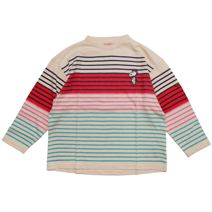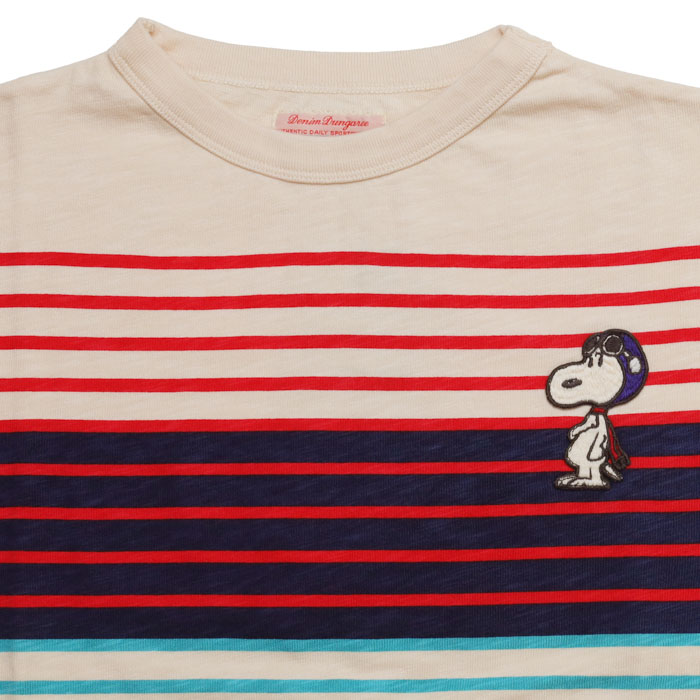 22581493 テンジク SNOOPY ボーダープリント Tシャツは、DENIM DUNGAREE【デニムアンドダンガリー】の胸にスヌーピーのワッペンが付いたマルチボーダープリントが可愛いTシャツ。カラフルなボーダーが目を惹きます。若干ハイネックになっているのもポイントです。