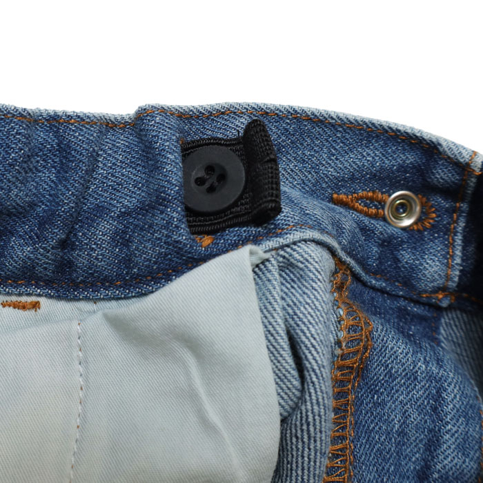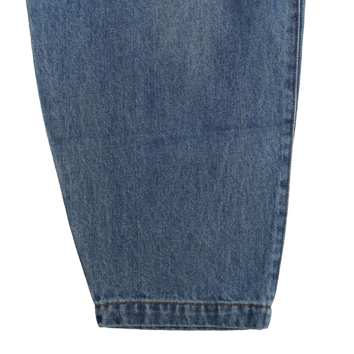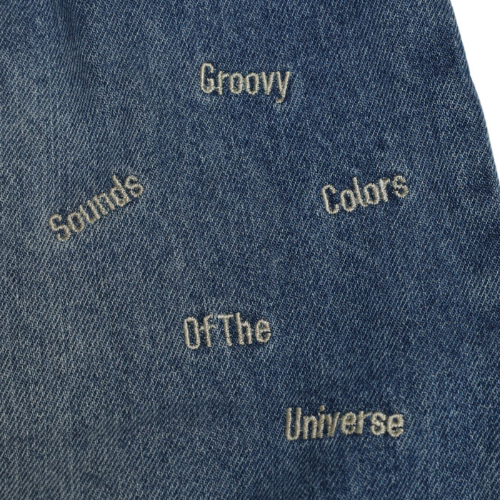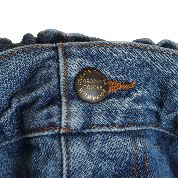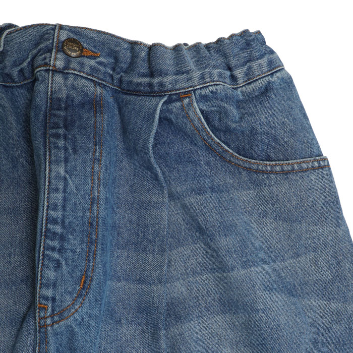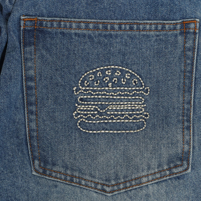 42580603 ムライトデニム HAMBURGER パンツは、GROOVY COLORS【グルービーカラーズ】の時間と手間をかけて染色した糸を使用し、加工後に深みがある表情の本格的なムラ糸デニム素材を使用したパンツ。 ワンタックでヒップ周りにゆとりを持たせ、丸みのあるシルエットが特徴のバルーンデニム型。 ウエストを釦で調整できるアジャストゴム仕様。 左前にはランダムに散りばめられたロゴ刺繍。 右後ろポケットにはハンバーガーのステッチ刺繍を施しています。