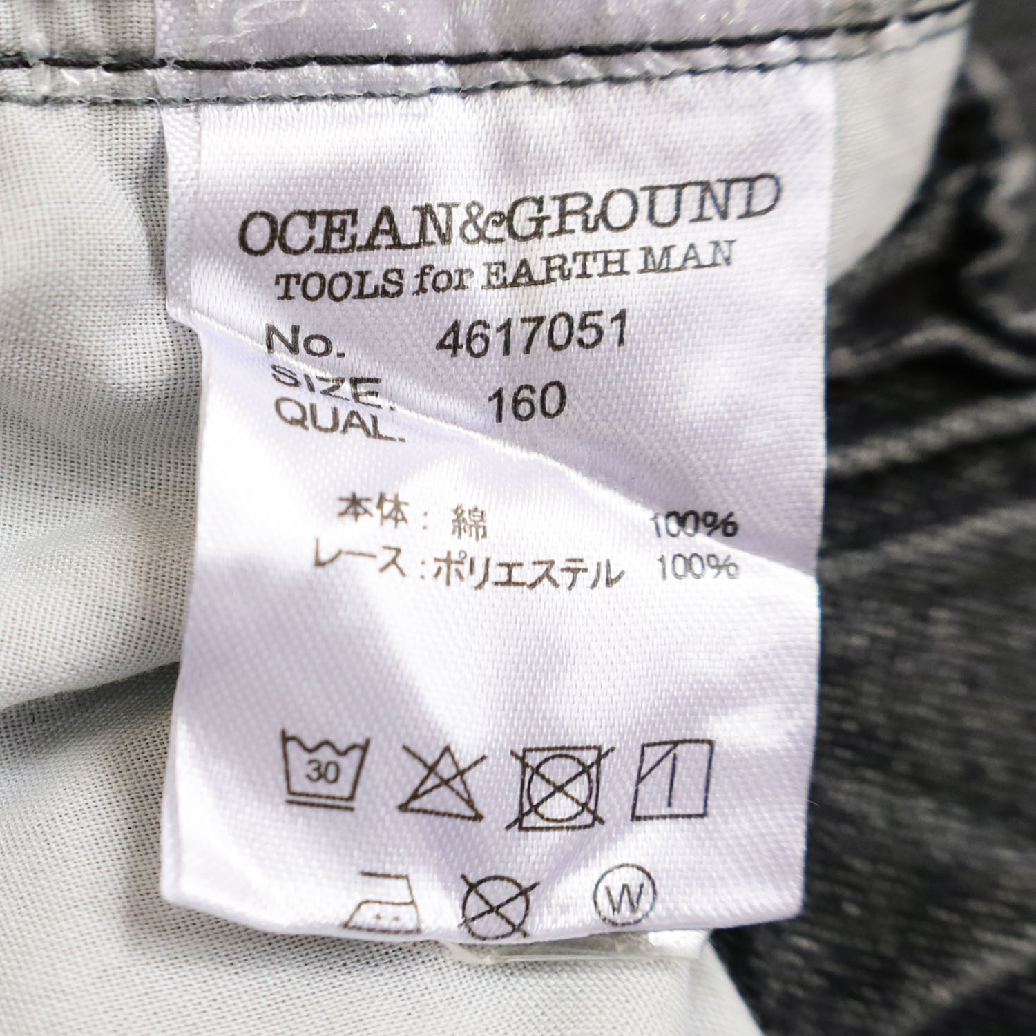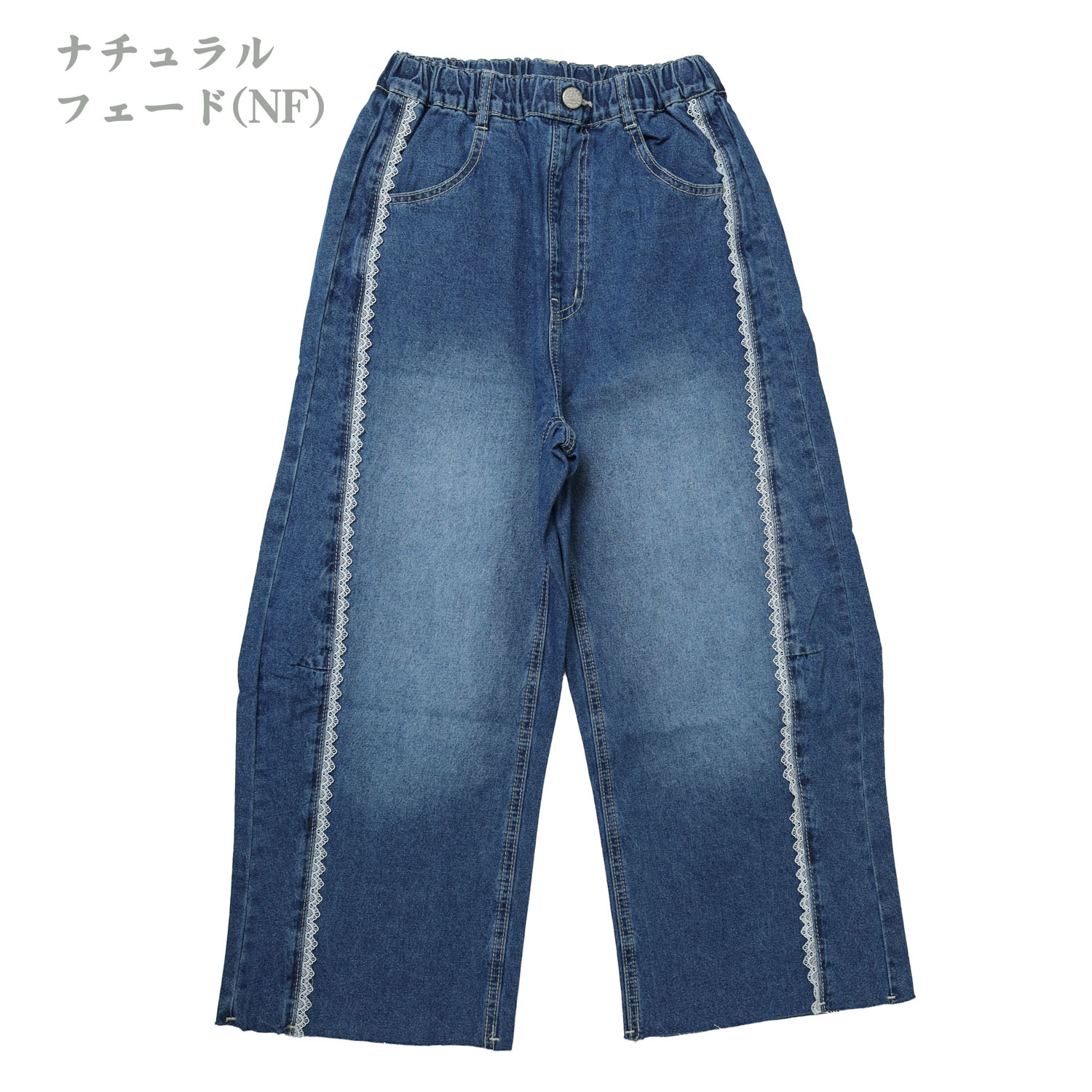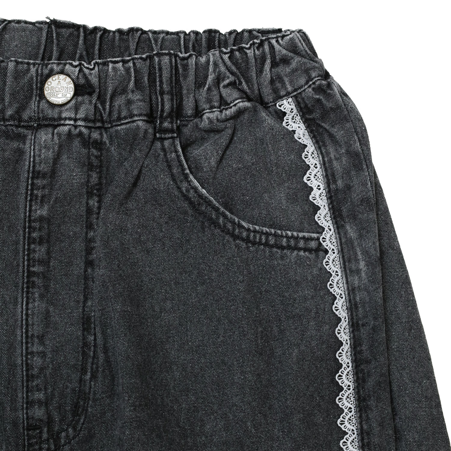 4617001・1617051 レースリメイクデニムパンツ は、OCEAN&GROUND【オーシャンアンドグラウンド】の切り替えに挟んだレースがポイントのデニムパンツ。 ヒップから裾にかけて丸みを出したバレルシルエット。 切りっぱなしの裾がこなれた雰囲気のアイテムです。