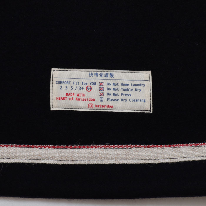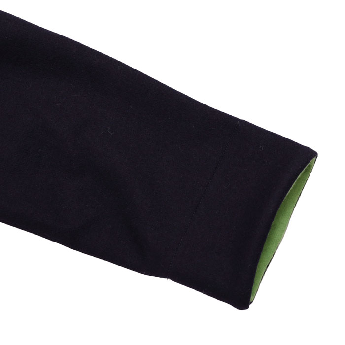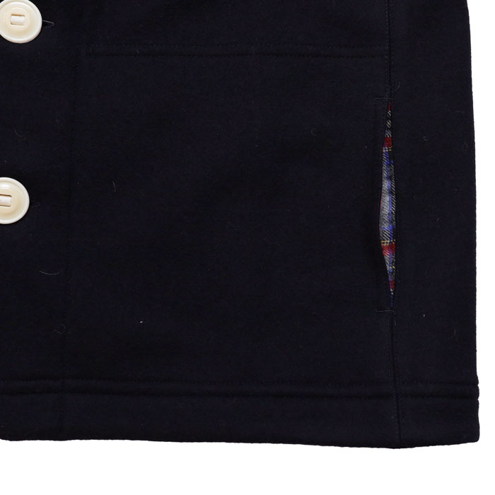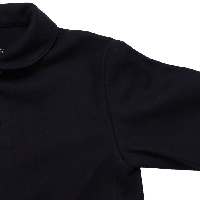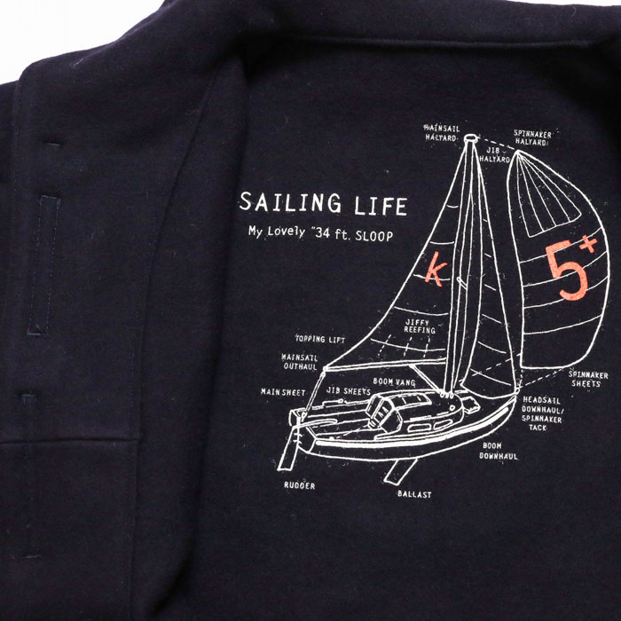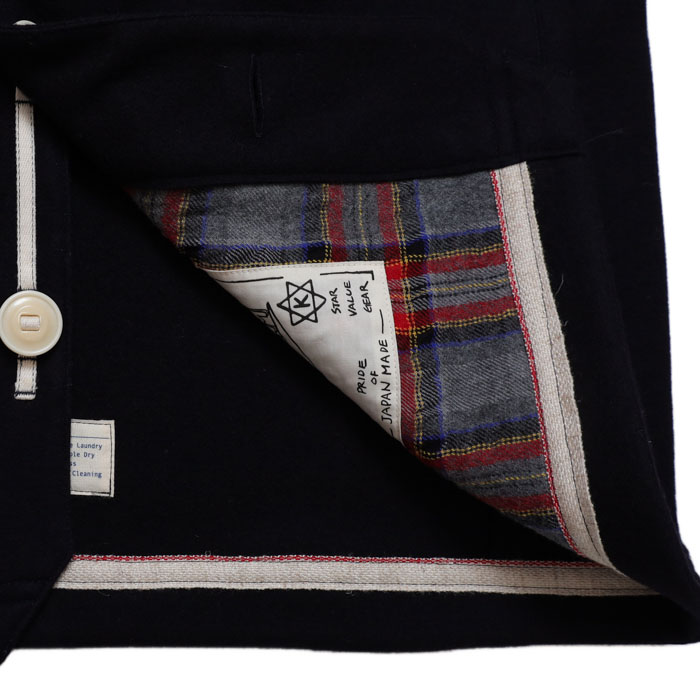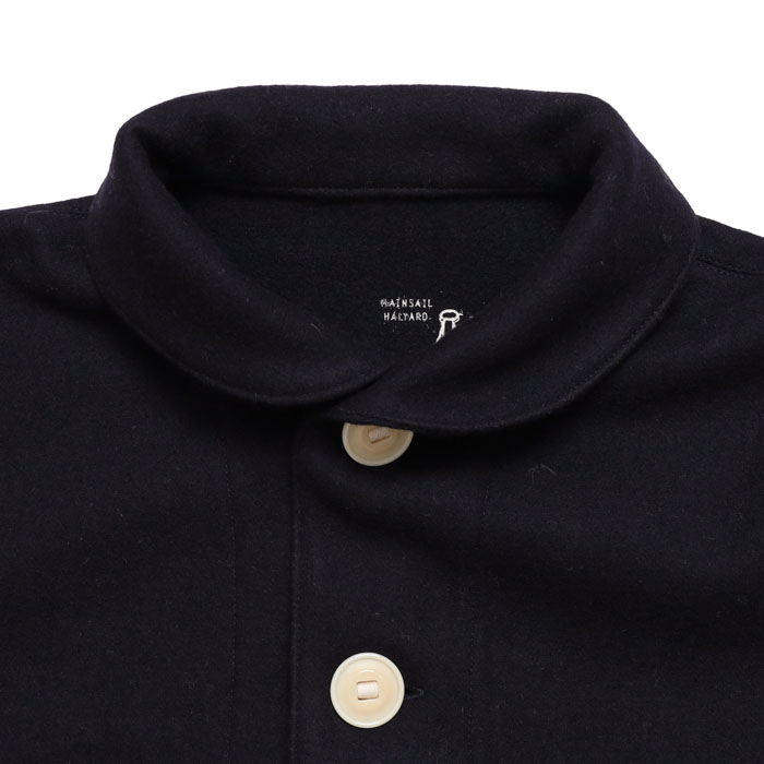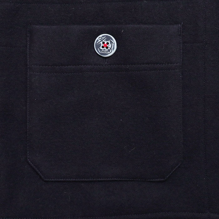 53JK-40 マリネデッキクルー ジャケットは、快晴堂【かいせいどう】のカットソーを織る機械で作る非常に軽くて柔らかく、なめらかなカットメルトンを使用したジャケット。快晴堂ならではの内側のプリントや、裏ネームタグなど見えないところまでこだわりを感じる一着。パラシュートボタンにテープを通し、前立てに止めた凝った仕様です。