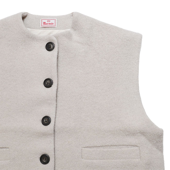 541125 圧縮ウール×タフタ中綿キルトシリーズ 中綿キルト ドッキングめっちゃ軽いゆったりサイズのベストは、mao made【マオメイド】のウールの繊維の隙間と隙間をぎゅぎゅっと詰め圧縮させた生地とタフタの中綿キルトをドッキングさせたゆったりサイズのベスト。あたたかい異素材同士をドッキングすることで、とにかく軽くてあたたかなアイテム。リラックスした着心地ながら、体型もさりげなくカバーしてくれます。