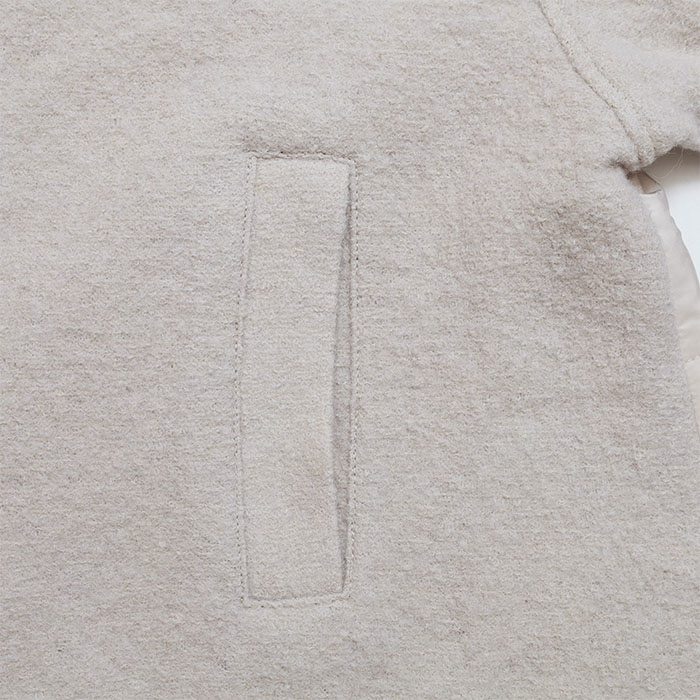541126 圧縮ウール×タフタ中綿キルトシリーズ 中綿キルト ドッキングめっちゃ軽いモックネックAラインコートは、mao made【マオメイド】のウールの繊維の隙間と隙間をぎゅぎゅっと詰め圧縮させた生地とタフタの中綿キルトをドッキングさせたモックネックのコート。前身頃とお袖を圧縮に、後身頃中綿キルトに。前後差で印象が変わるデザインです。とにかく軽く、ライトな肉感があたたかい一着。長すぎない着丈、ゆったりとした身幅、程よいAライン。体型カバーしつつきれいなシルエットです。