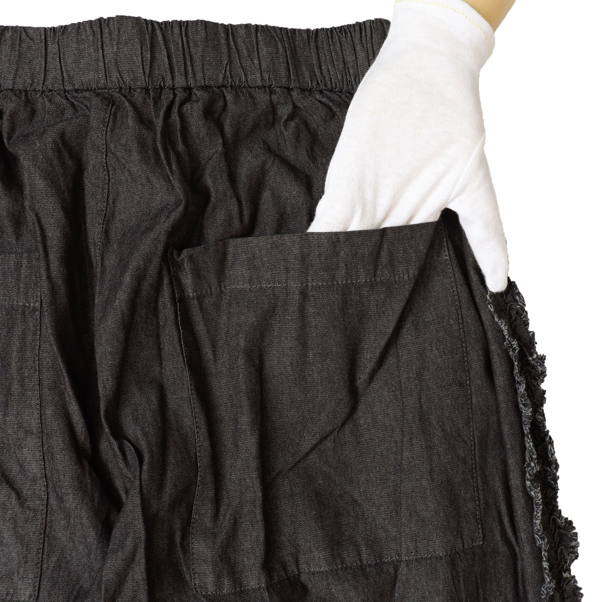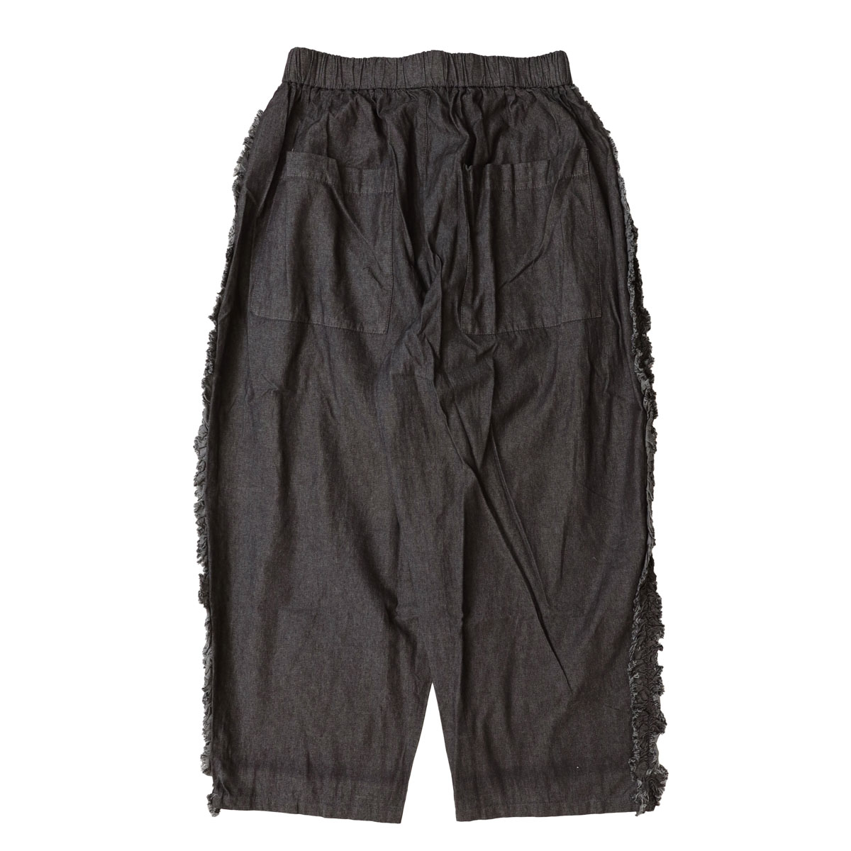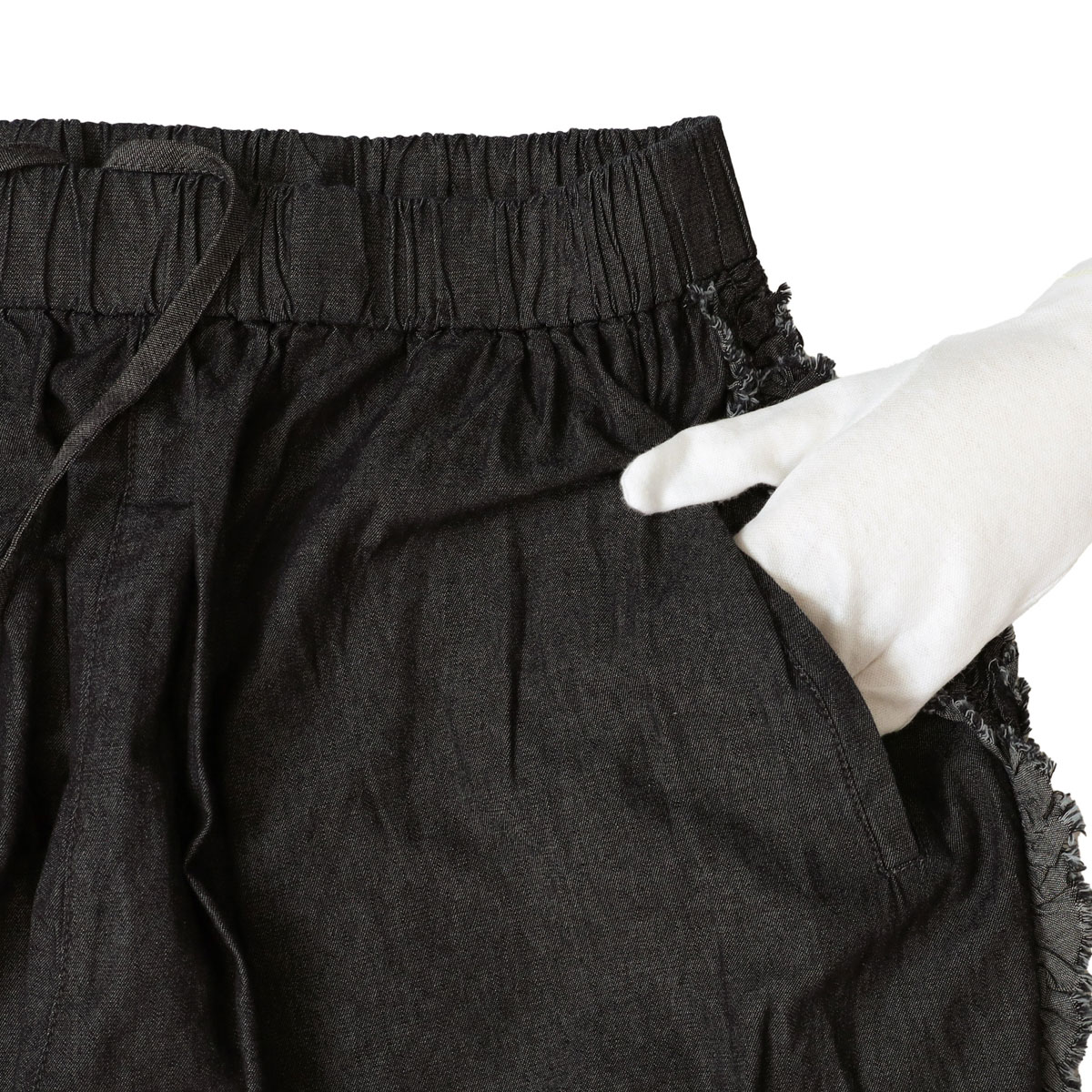 611313 サイド ふりふり ゆったり テーパード パンツ イージーパンツ は、mao made【マオメイド】の薄く軽いデニムを使用したパンツ。切りっぱなしのラフなフリルがほんのり甘く大人にぴったり。気になる太ももやお尻周りをしっかりとカバーしつつ、ニュアンスのあるテーパードシルエットに仕上がっています。デニムなのでお手持ちのアイテムとも合わせやすく日々のコーディネートで活躍してくれます。