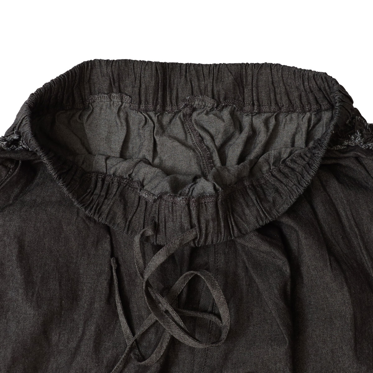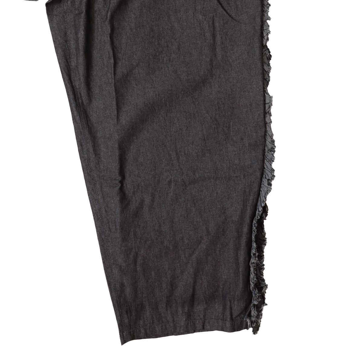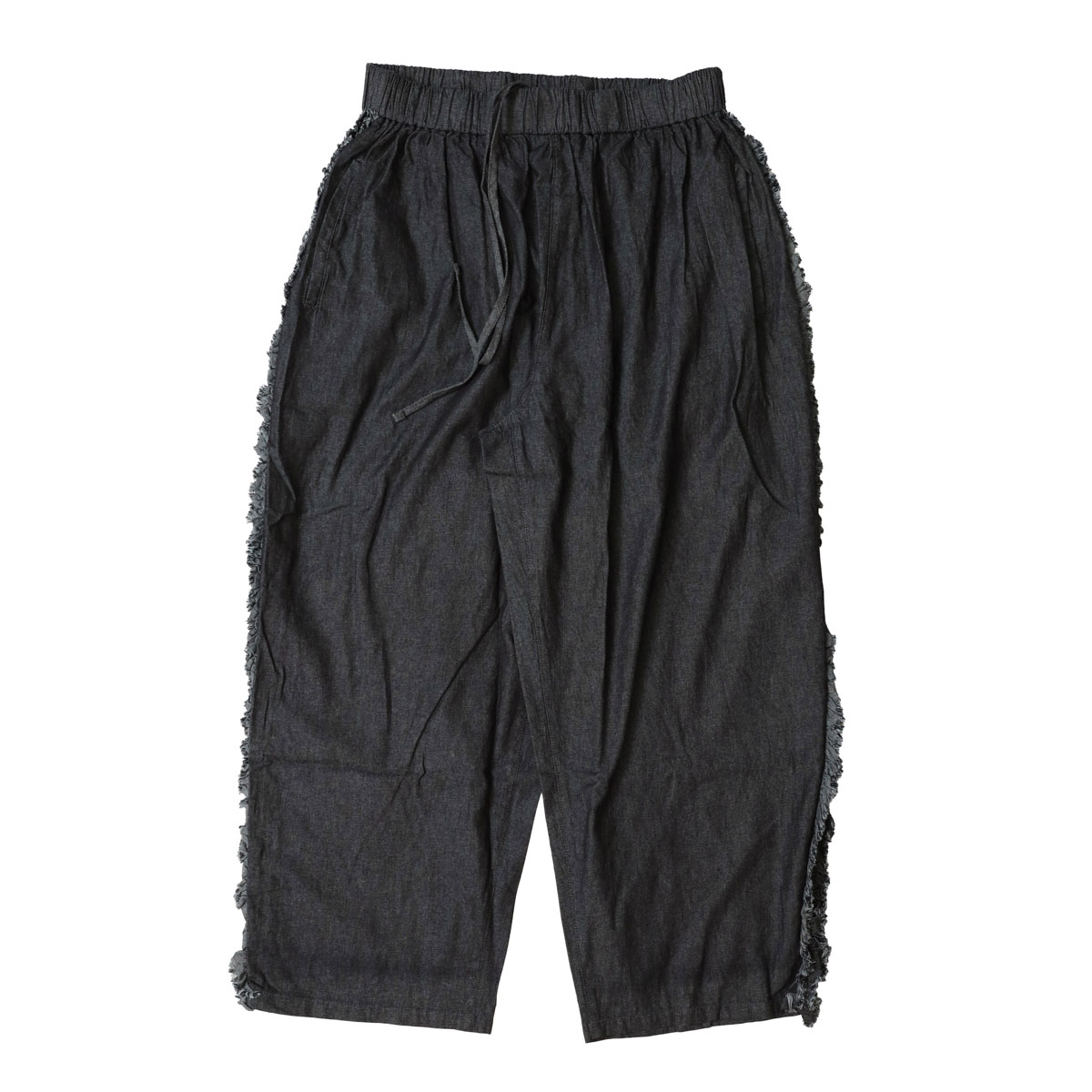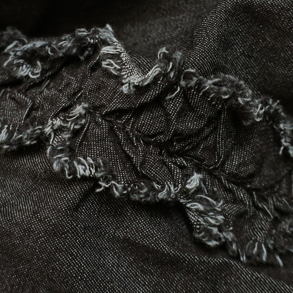611313 サイド ふりふり ゆったり テーパード パンツ イージーパンツ は、mao made【マオメイド】の薄く軽いデニムを使用したパンツ。切りっぱなしのラフなフリルがほんのり甘く大人にぴったり。気になる太ももやお尻周りをしっかりとカバーしつつ、ニュアンスのあるテーパードシルエットに仕上がっています。デニムなのでお手持ちのアイテムとも合わせやすく日々のコーディネートで活躍してくれます。
