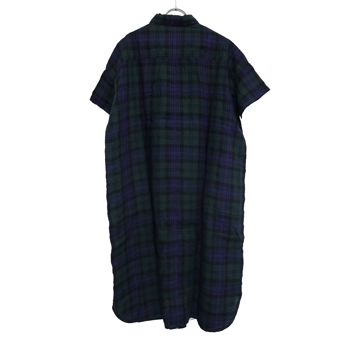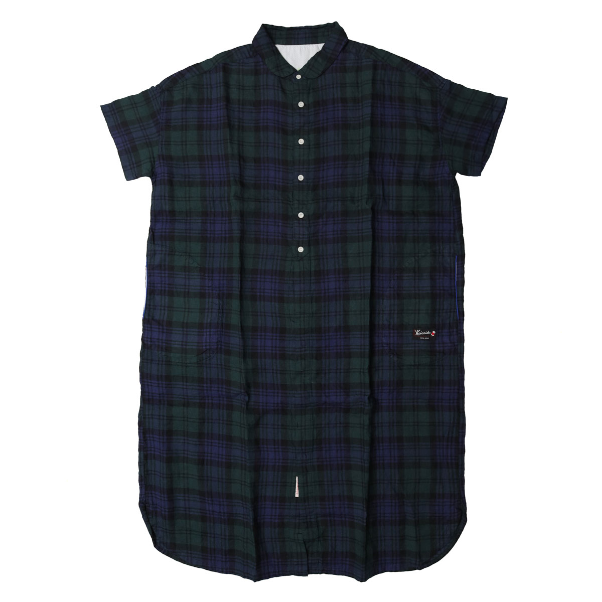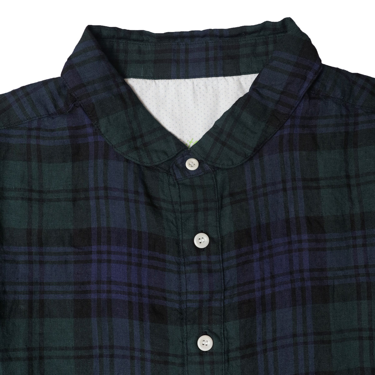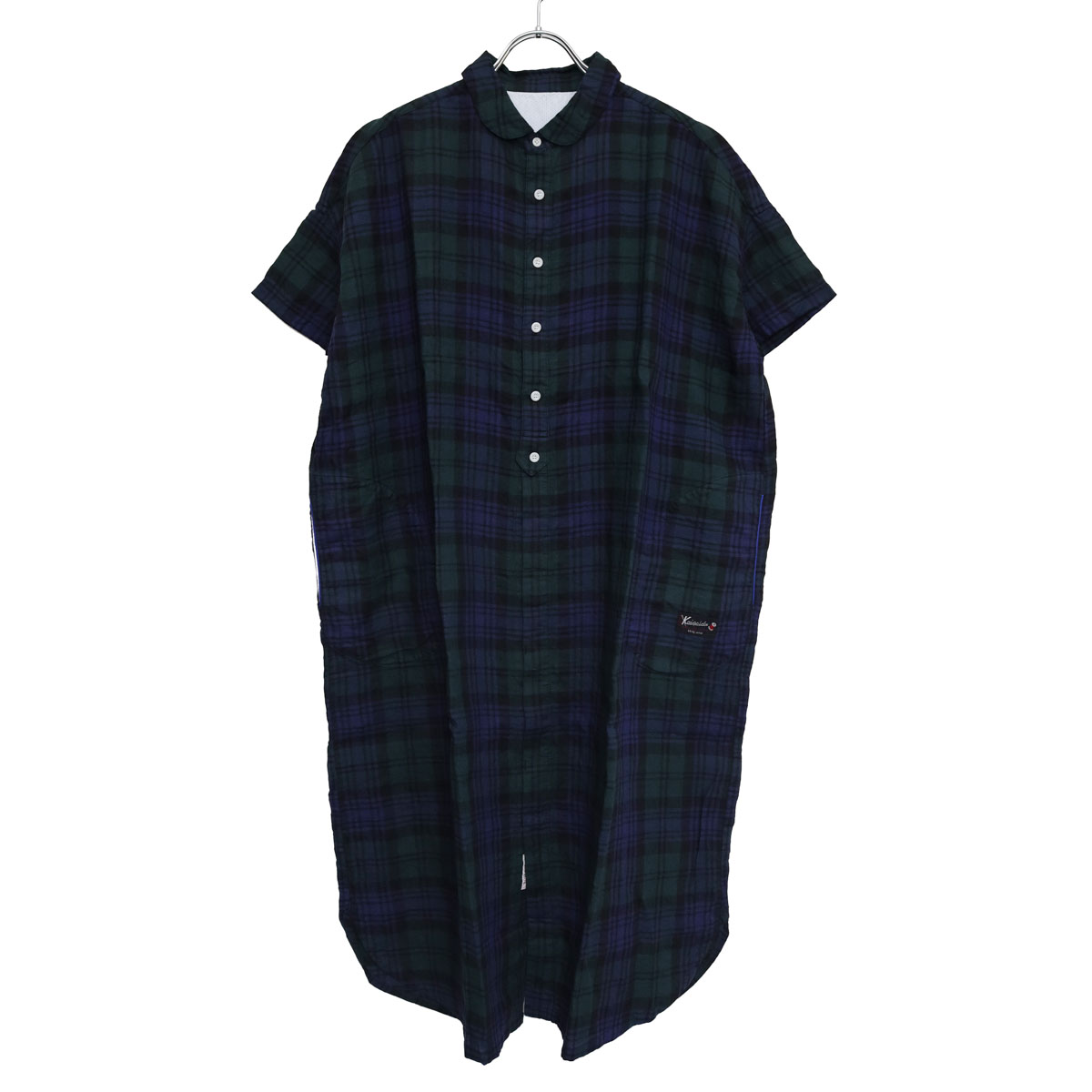61OP-03 タータンチェック/エバーグリーン wide丸衿タブ半袖ワンピース は、快晴堂【かいせいどう】の時代を超えて愛されるタータンチェックのワンピース。「日本綿布」による快晴堂オリジナルのリネンタータンです。チェック柄はスコットランドの伝統的な柄ですが、格子になる糸の色や並べ方を快晴堂がこだわったオリジナル。青を明るめに、緑を深めにして少しシックな大人っぽい印象に仕上がっています。ゆとりのある身幅で風通しも良く、控えめな衿がすっきり見えを実現。ふわっとした風合いで、シルエットが綺麗に見え、さっぱりとした着心地です。