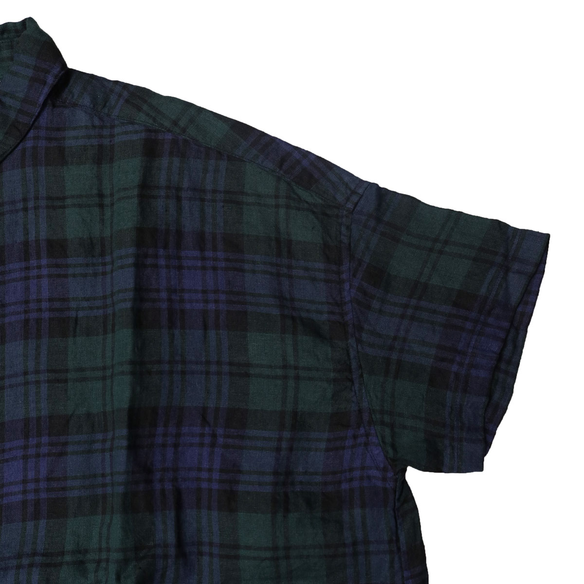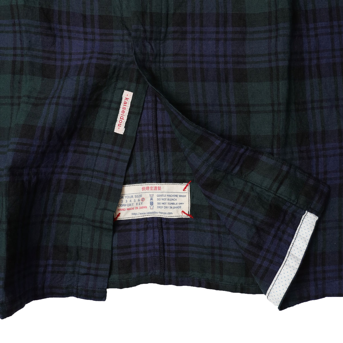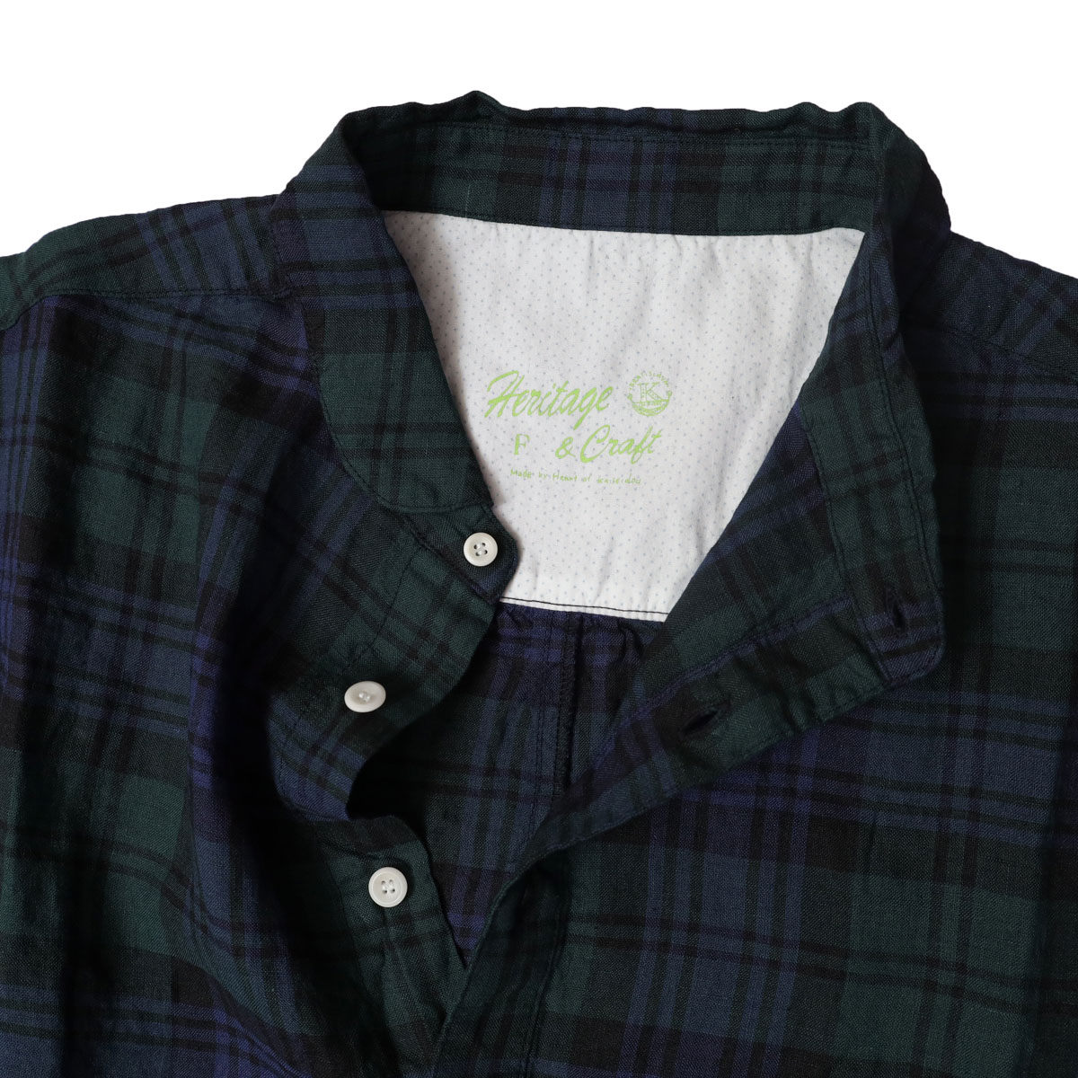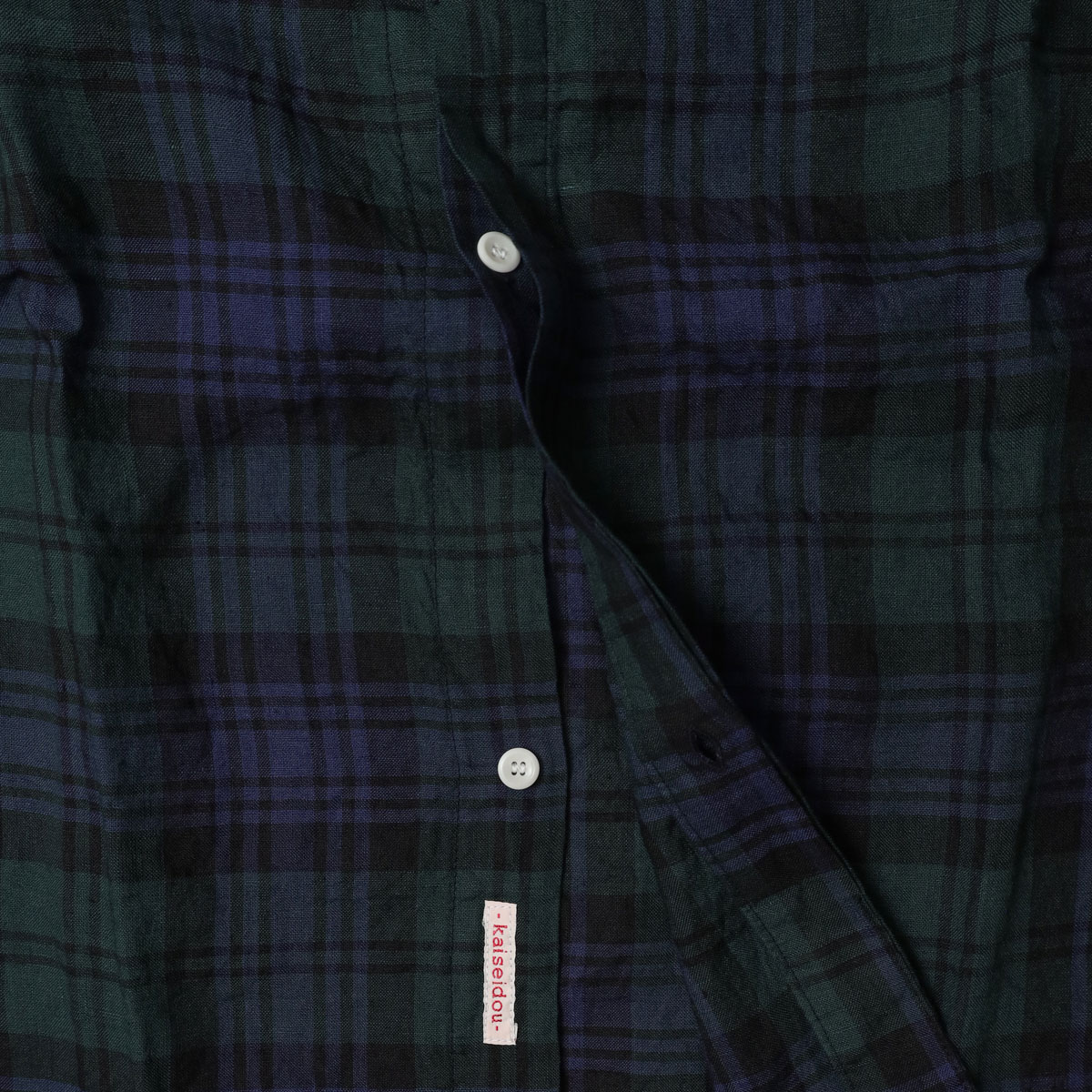 61OP-03 タータンチェック/エバーグリーン wide丸衿タブ半袖ワンピース は、快晴堂【かいせいどう】の時代を超えて愛されるタータンチェックのワンピース。「日本綿布」による快晴堂オリジナルのリネンタータンです。チェック柄はスコットランドの伝統的な柄ですが、格子になる糸の色や並べ方を快晴堂がこだわったオリジナル。青を明るめに、緑を深めにして少しシックな大人っぽい印象に仕上がっています。ゆとりのある身幅で風通しも良く、控えめな衿がすっきり見えを実現。ふわっとした風合いで、シルエットが綺麗に見え、さっぱりとした着心地です。