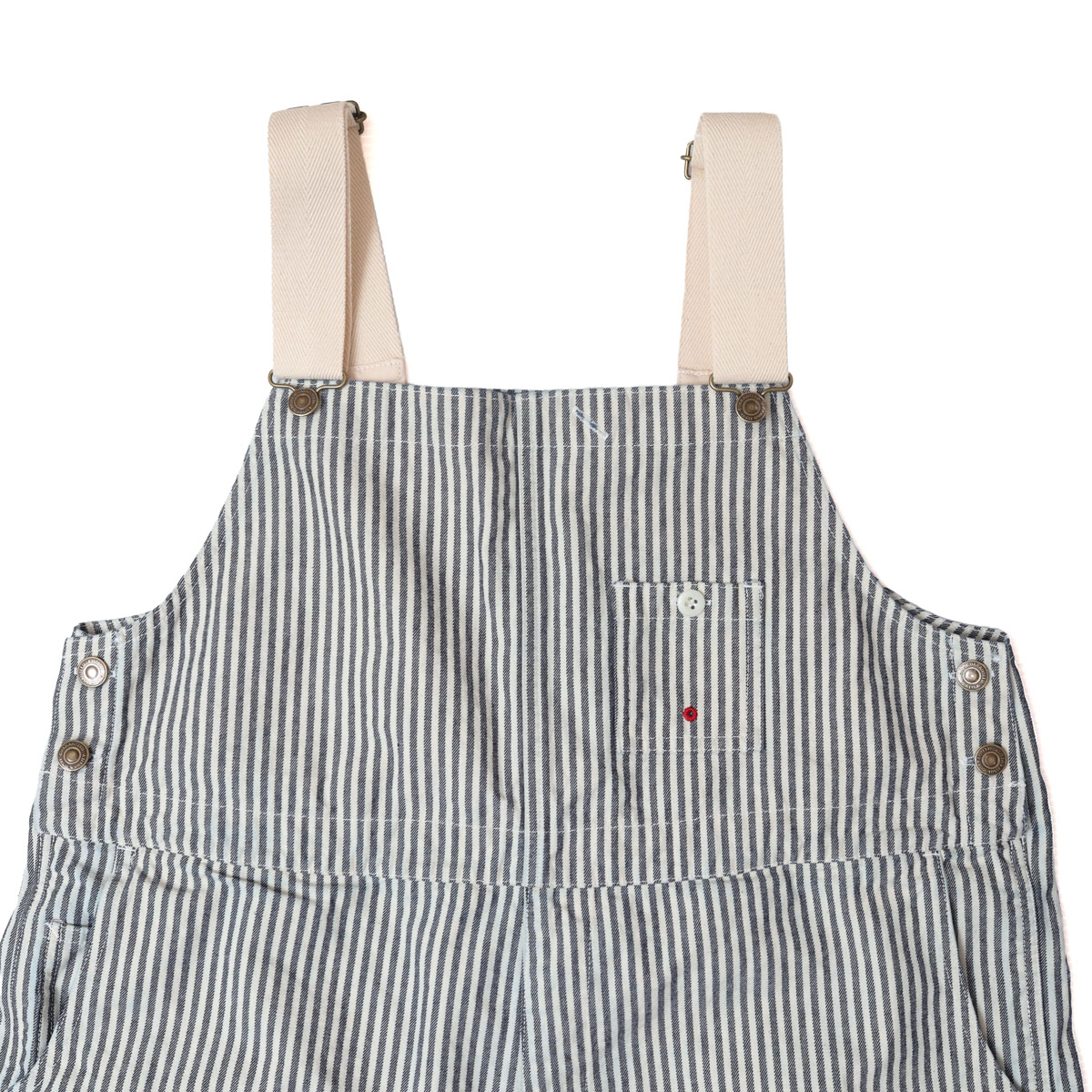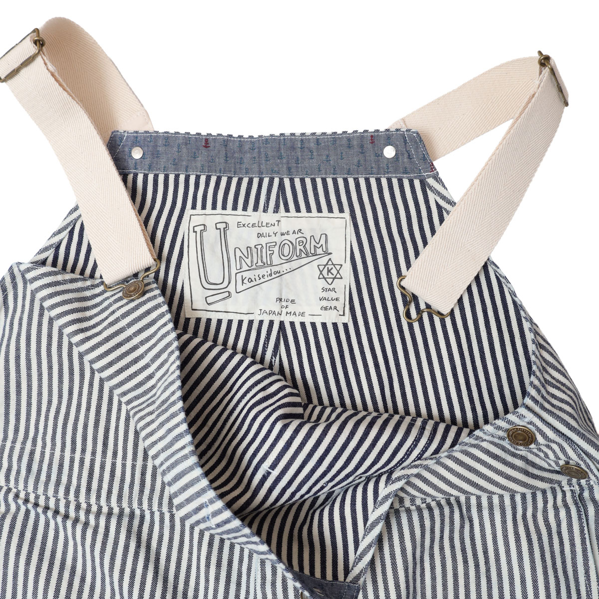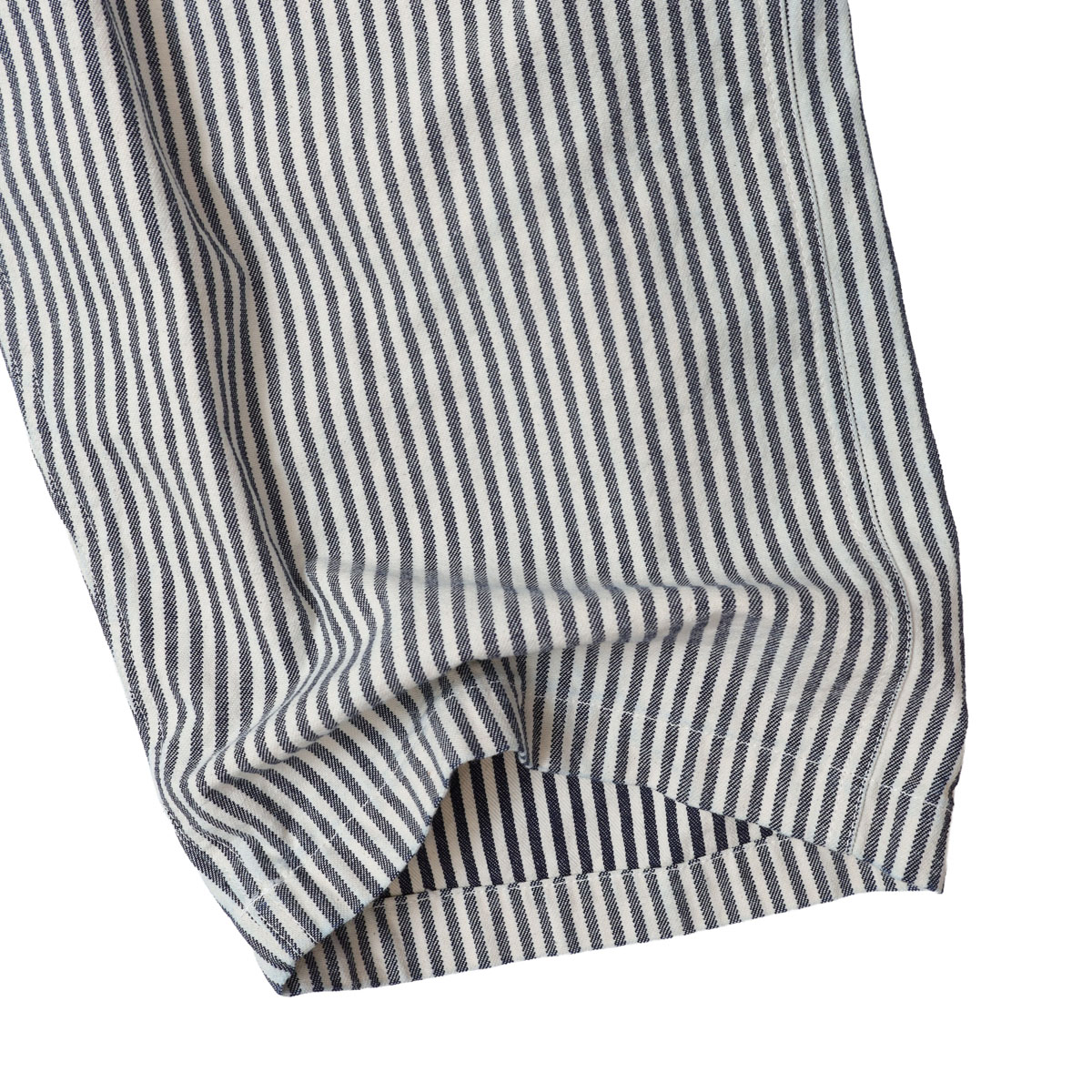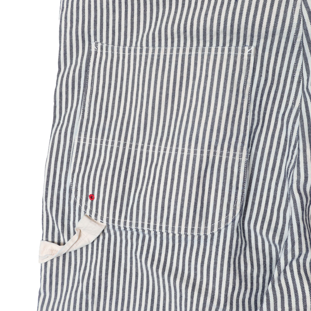 61P73 BIGオーバーオール HAYATE CCBY DUTY WEAR は、快晴堂【かいせいどう】の架空の小さな造船所「CAPE COD BOAT YARD」のユニフォームをイメージして作られたオーバーオール。「日本綿布」の8オンスヒッコリーデニムを使用。生地の裏側をあえて表にしてストライプのコントラストを抑えています。そのため、長く着ているかのようなヴィンテージ感があるワークウエアに仕上がっています。生地に少しハリがあるので、だらしなく見えずすっきりとした印象の一着です。