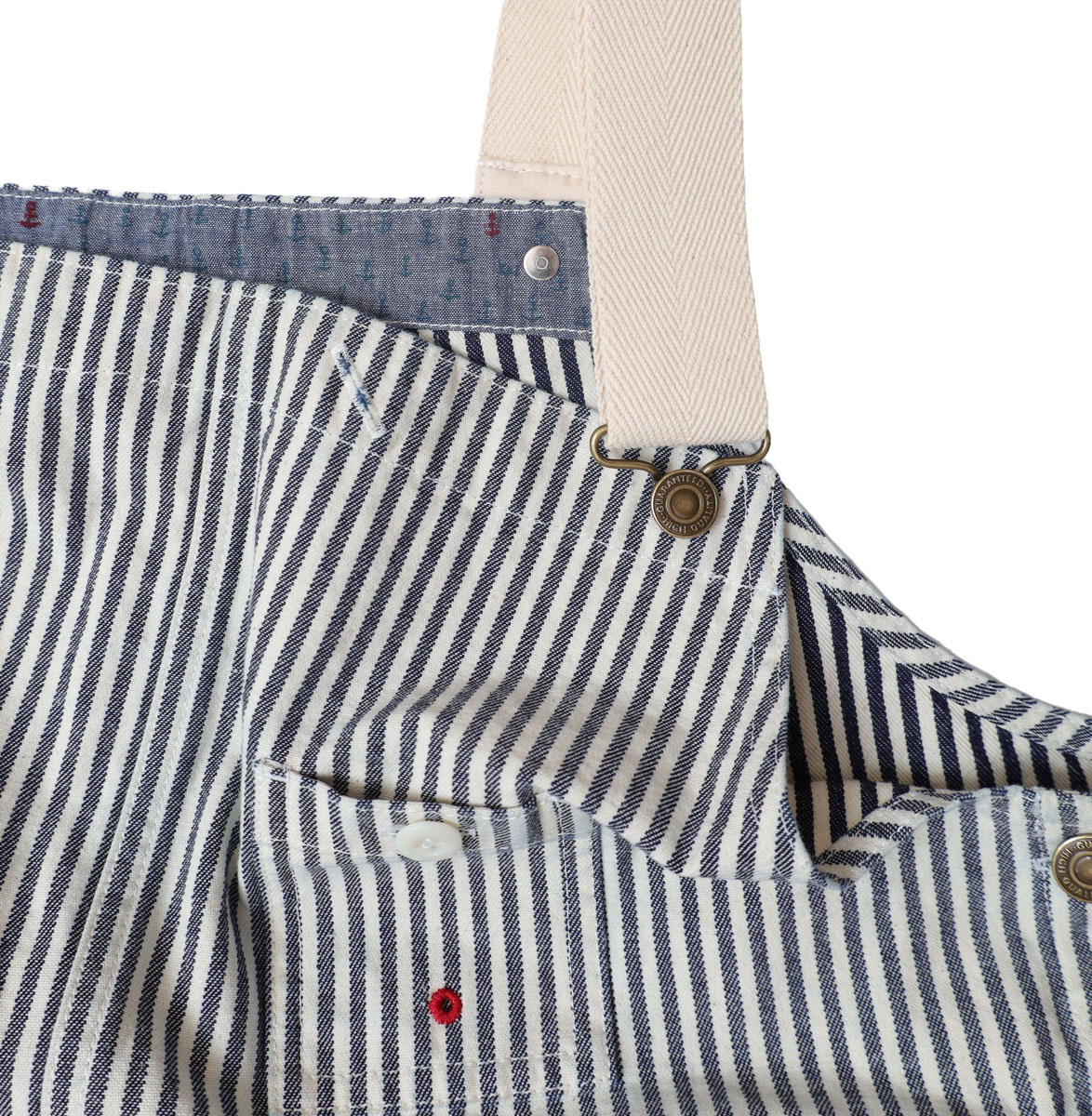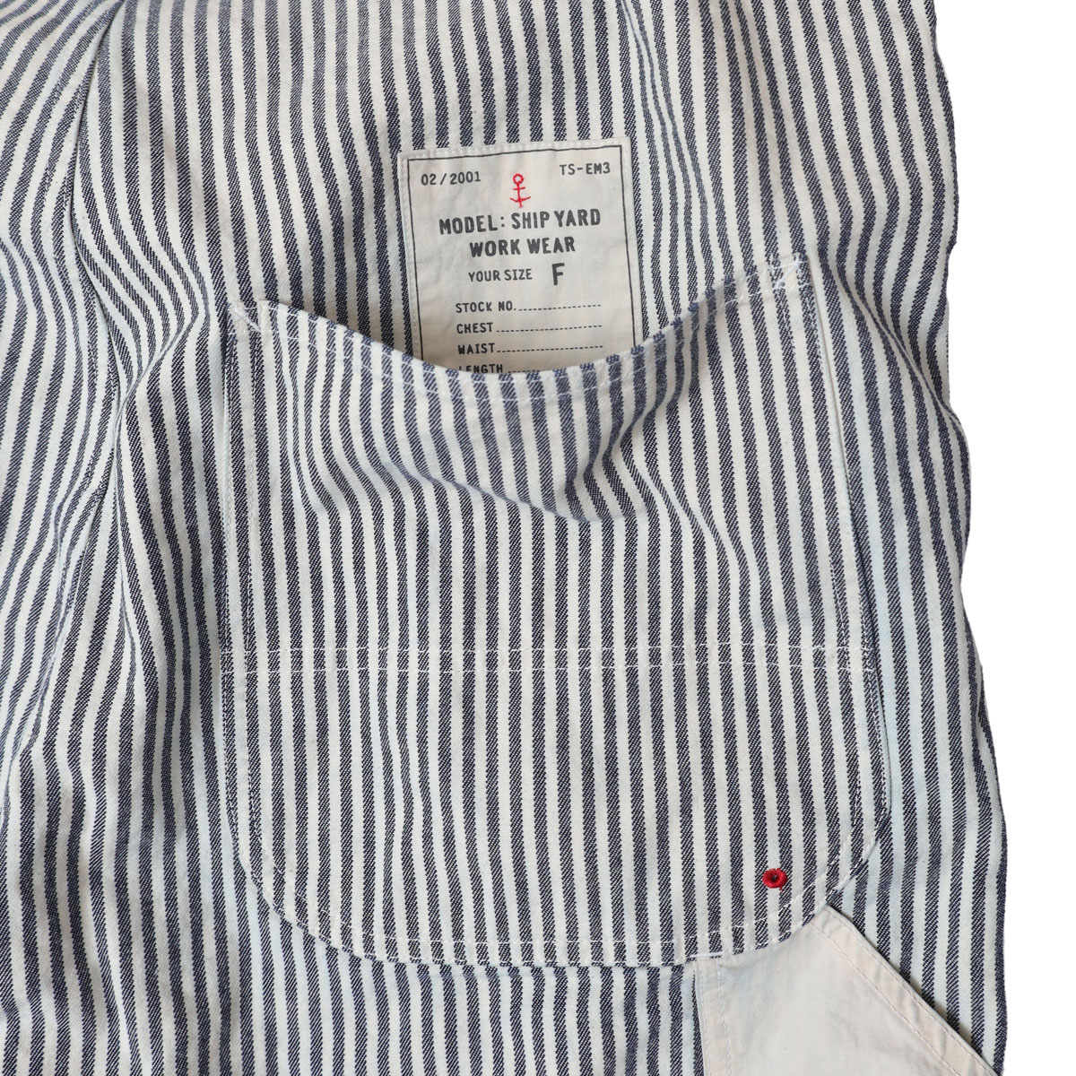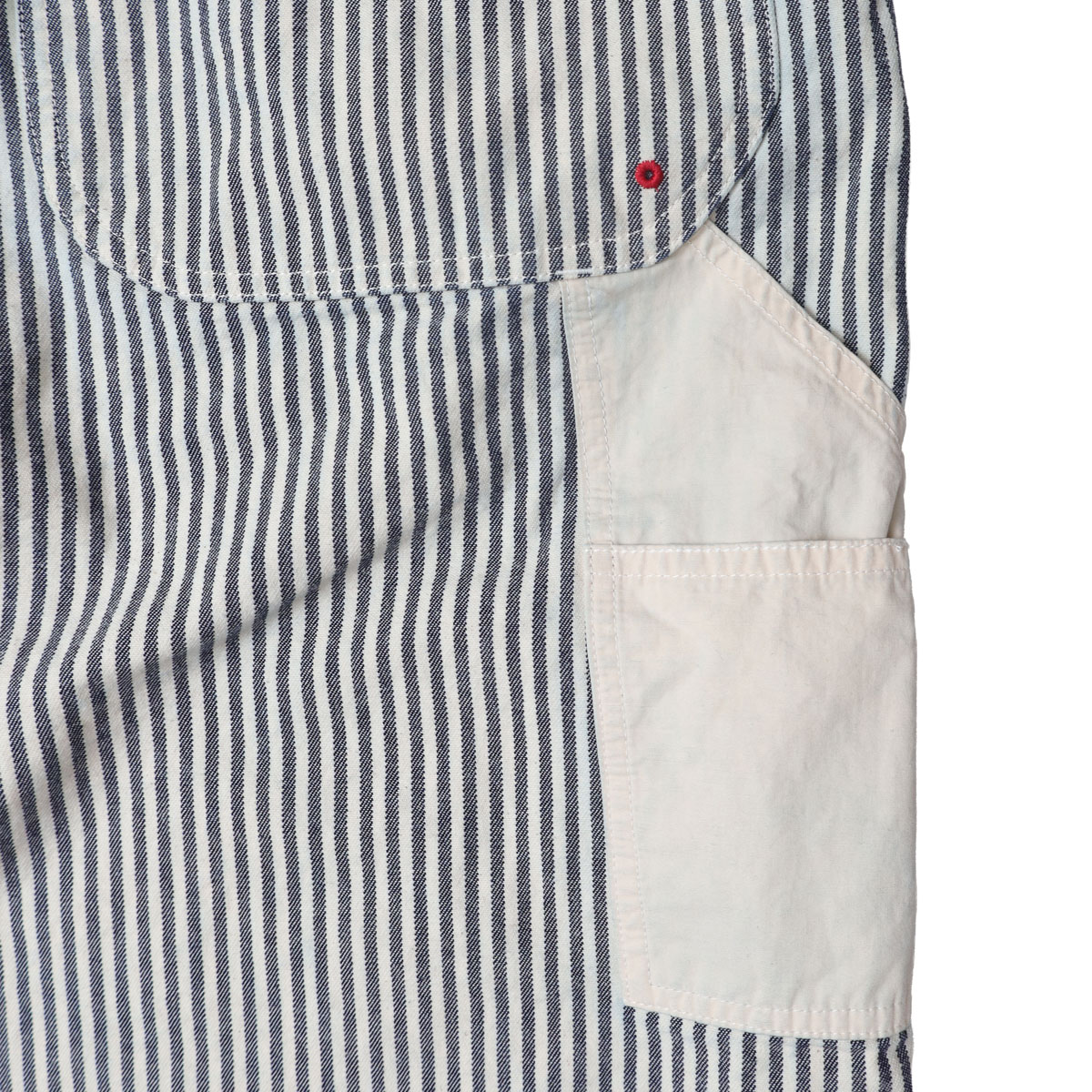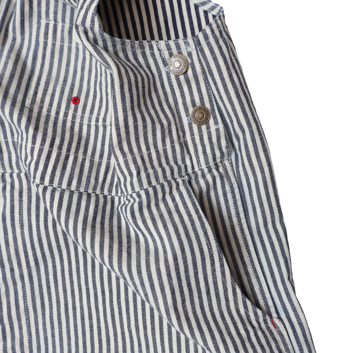 61P73 BIGオーバーオール HAYATE CCBY DUTY WEAR は、快晴堂【かいせいどう】の架空の小さな造船所「CAPE COD BOAT YARD」のユニフォームをイメージして作られたオーバーオール。「日本綿布」の8オンスヒッコリーデニムを使用。生地の裏側をあえて表にしてストライプのコントラストを抑えています。そのため、長く着ているかのようなヴィンテージ感があるワークウエアに仕上がっています。生地に少しハリがあるので、だらしなく見えずすっきりとした印象の一着です。