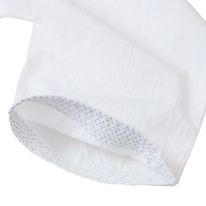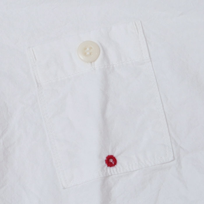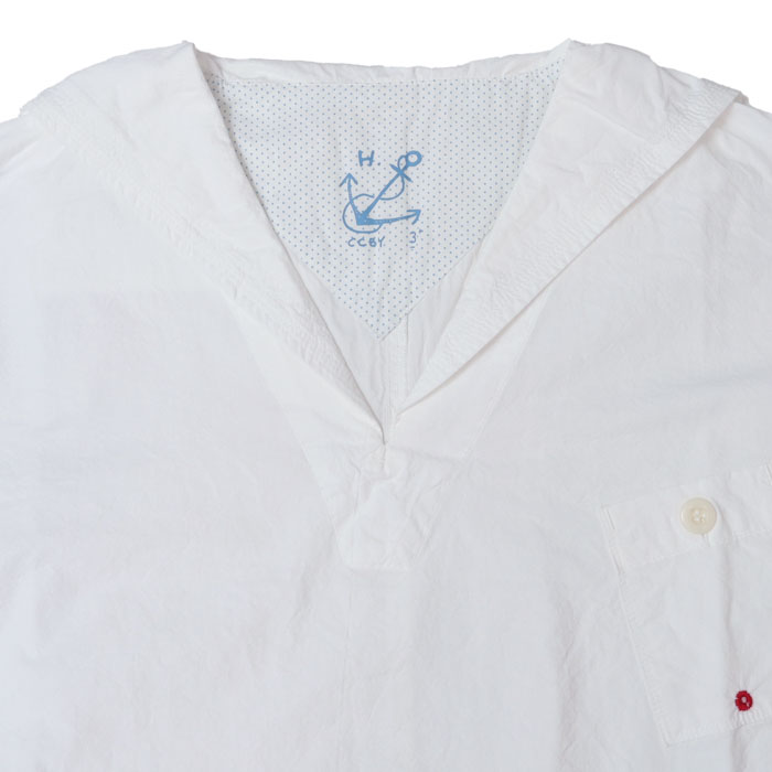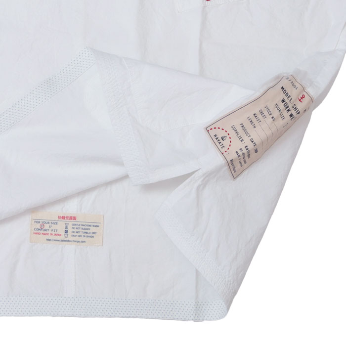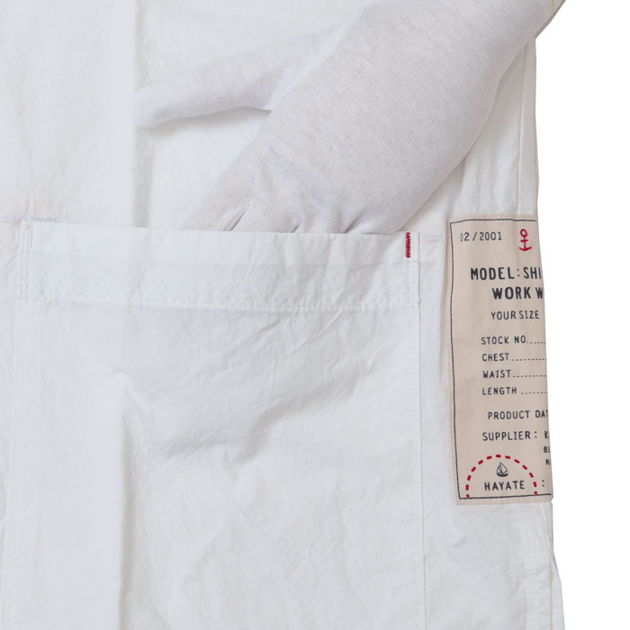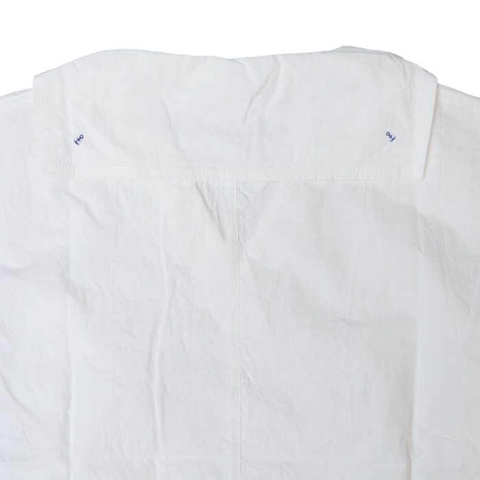 61S-65 HAYATE 白シャツ セーラーシャツ は、快晴堂【かいせいどう】の架空の造船所「CAPE COD BOAT YARD」の作業員が、仕事が終わり着替えた真っ白なシャツをイメージして作られたアイテム。通常よりたくさんの手間と時間をかけて練り込んだ究極のナチュラルシワ加工の生地はシワが消えにくく、耐久性があります。自然なシワと風合いのある生地に、ステッチを効かせて立体感のあるきれいなシルエットの軽やかなシャツです。セーラーカラーが爽やかな印象。さりげなく付けられたボートヤードパッチネームがアクセントに。ポケットの形や配置もユニークです。