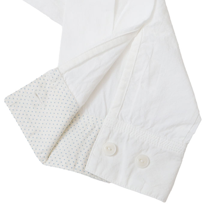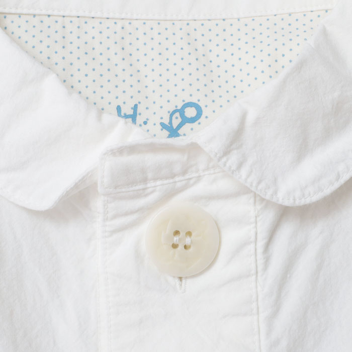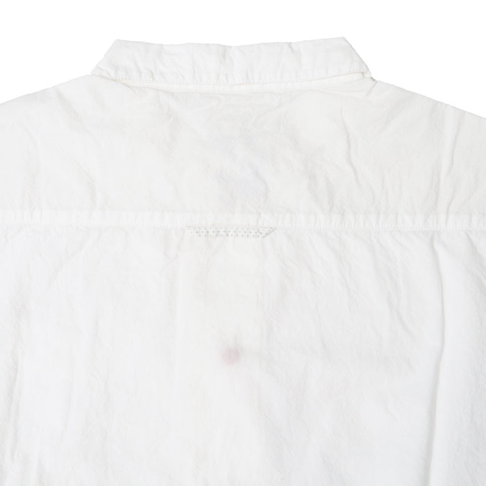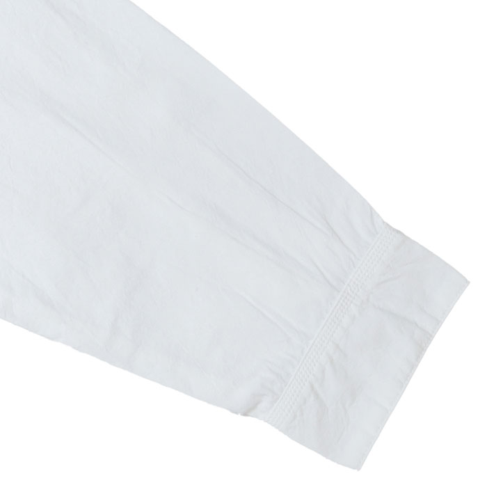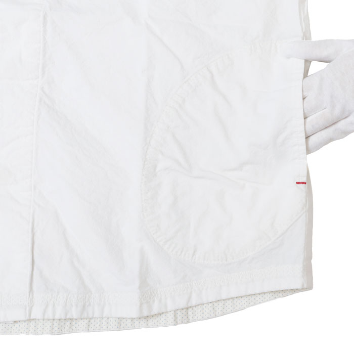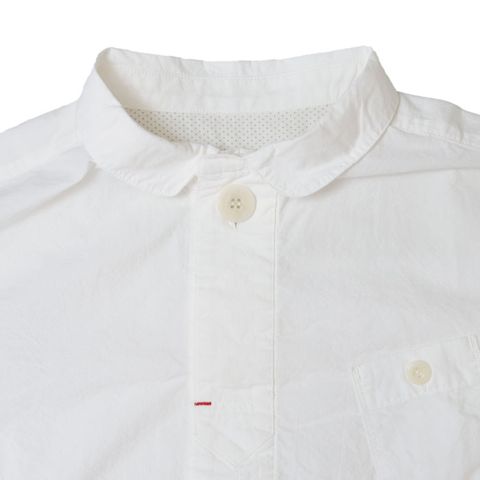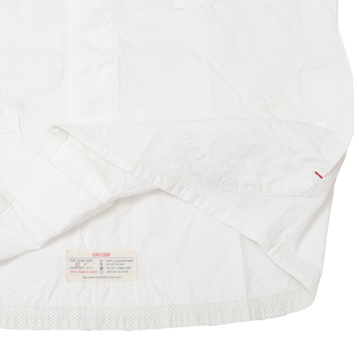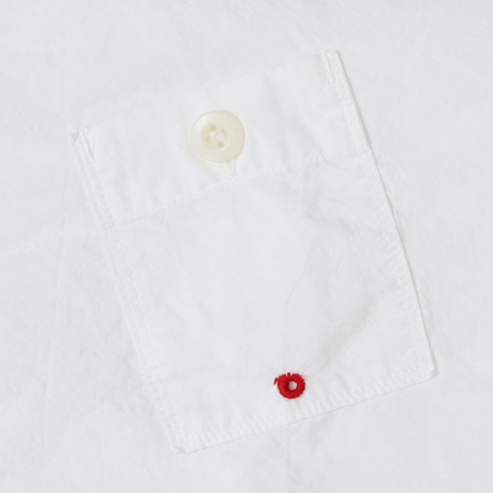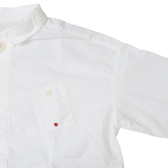 61S-67 HAYATE 白シャツ マリネシャツ は、快晴堂【かいせいどう】の架空の造船所「CAPE COD BOAT YARD」の作業員が、仕事が終わり着替えた真っ白なシャツをイメージして作られたアイテム。通常よりたくさんの手間と時間をかけて練り込んだ究極のナチュラルシワ加工の生地はシワが消えにくく、耐久性があります。自然なシワと風合いのある生地に、ステッチを効かせて立体感のあるきれいなシルエットの軽やかなシャツです。さりげなく付けられたボートヤードパッチネームがアクセントに。ポケットの形や配置もユニークです。