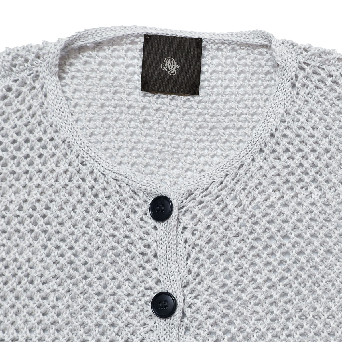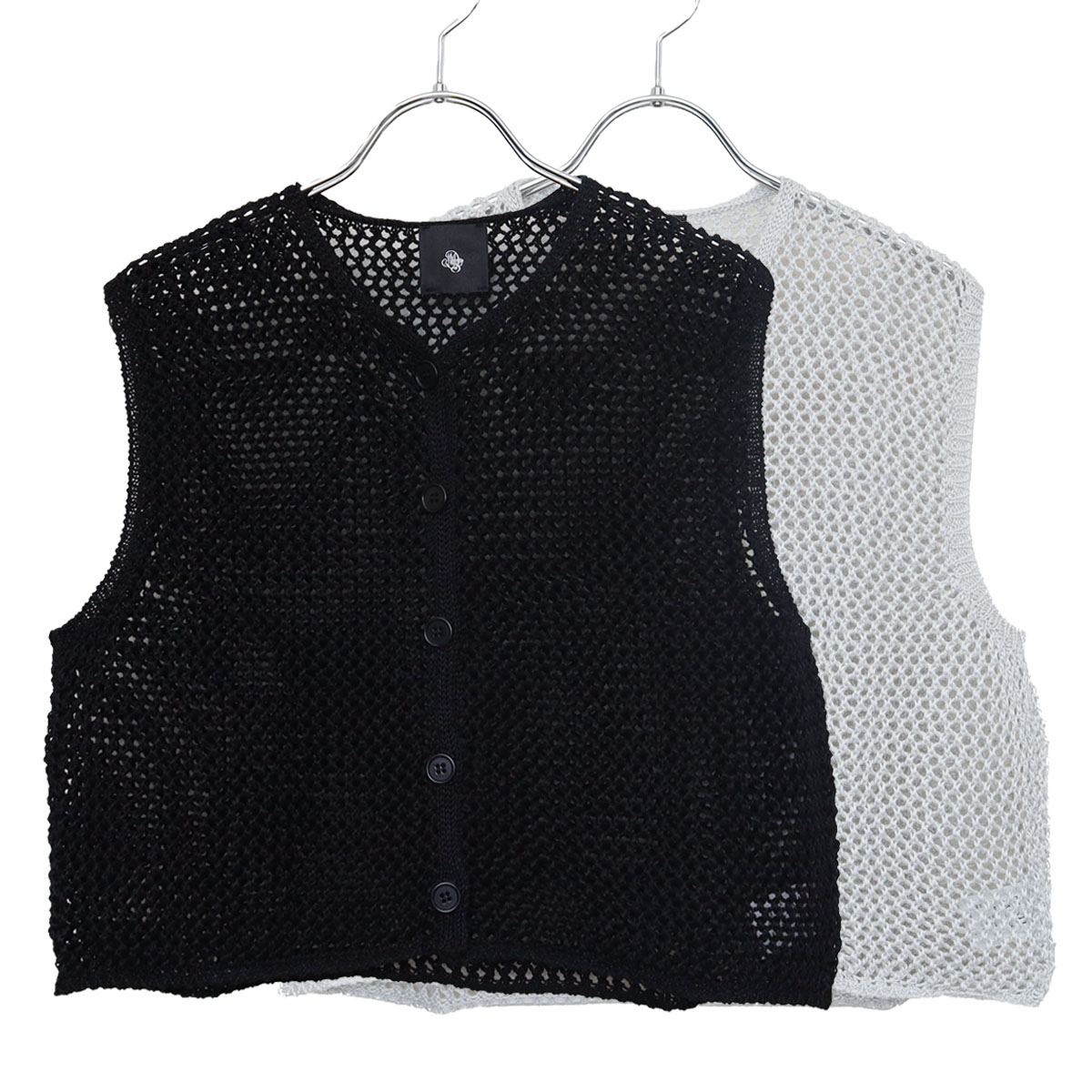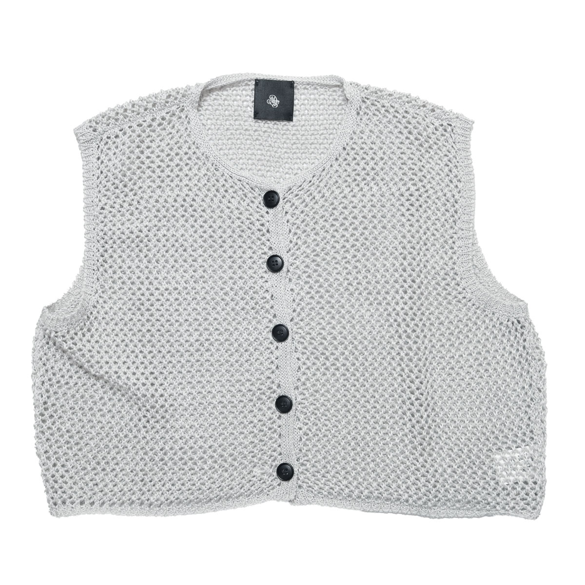 CNMDS2601 5GG LINEN OPENWORK KNIT VEST は、maison de soil【メゾンドソイル】のリネンの糸を使用し、メッシュに編み立てられた前開きタイプのベスト。コンパクトな着丈でワンピースなどとの相性も◎コーディネートにプラスするとグッと今年らしい印象になるアイテムです。