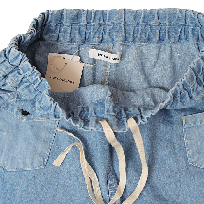 EB25307-B ネップデニム パンツ は、ESTROISLOSE【エストゥロワルーズ】の軽く柔らかさのある素材で加工をメインに作り上げたデニムパンツ。切り替えデザインが特徴的で、ウエストゴム+ヒモで調節可能なので履き心地も良い一着。