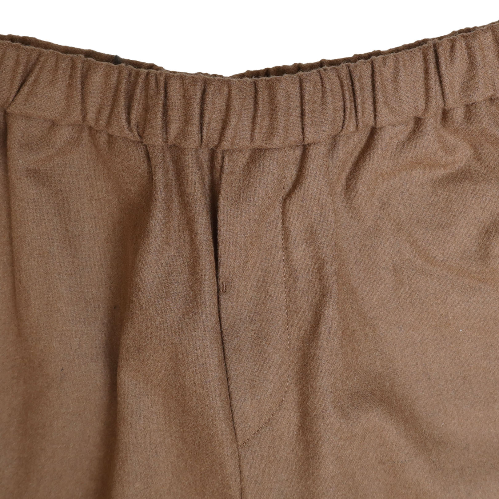 GNMDS2101WF WOOL FLANNEL EASY TAPERED PANTSは、maison de soil【メゾンドソイル】の表面に光沢があり、スーツなどにも使われるような上品な印象のウールフランネル生地を使用したパンツ。 ウールフランネルは、柔らかくて弾力のある素材のため、暖かくシワになりにくいのが特徴です。 ウエスト部分全体にはゴムが入っており、さらに内側から紐で調節が可能なイージー仕様。 腰まわりはゆったり、そして裾にかけて細くなるテーパードパンツは、すっきりとしたシルエットです。 股下をやや短めに設定することで、足首周りがもたつかないので、靴下やブーツなどを合わせ、足元のレイヤードを楽しめるのもポイントです。 シャツやブラウスと合わせていただくのはもちろん、ボリューム感のあるワンピースなどの下に合わせても、スッキリとした着こなしが叶います。