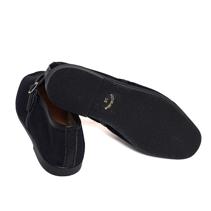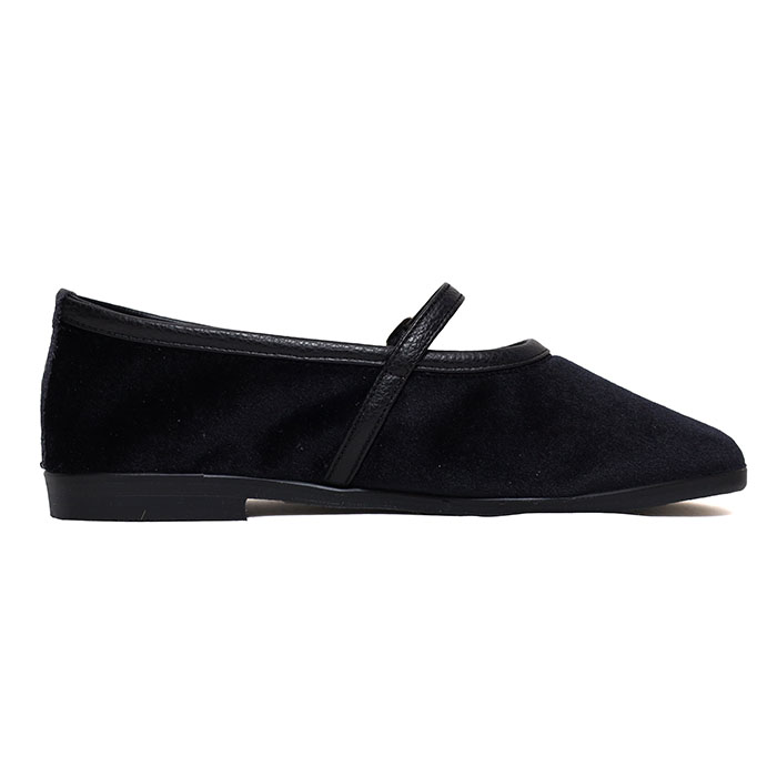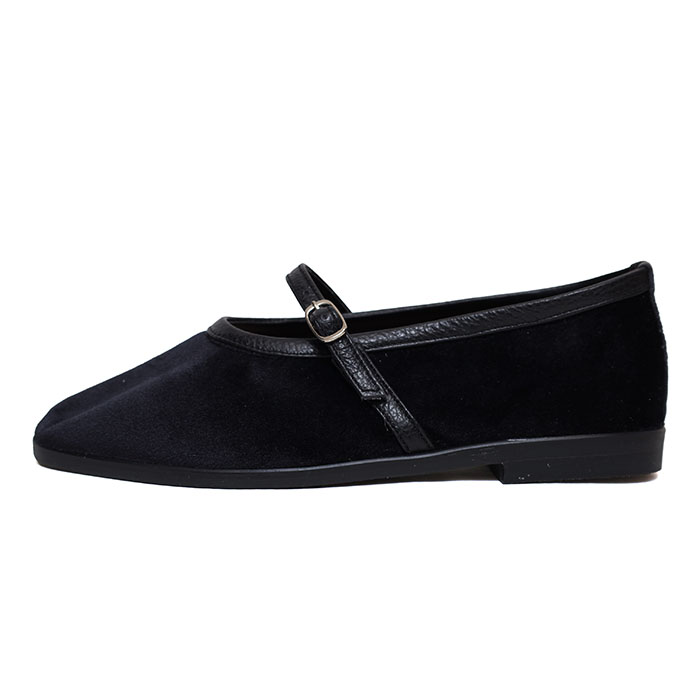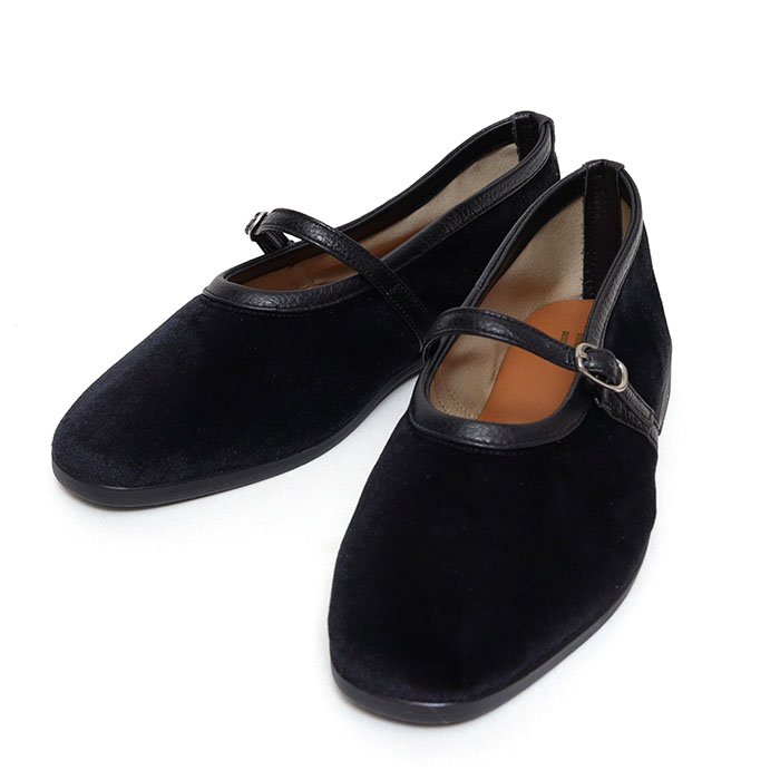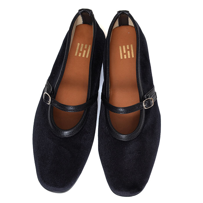H172 squirrel(スクイール)は、hcubuch【フーブ】のベルベット生地とシボ型押しのイタリアンレザーのコンビのメリージェーンフラットシューズ。すっきりと見えるけれどゆとりのある足入れ感の木型で作られています。バックルはゴムで取り付けているので外さずに脱ぎ履きでき、柔らかい底周りで履きやすく仕上げられています。
