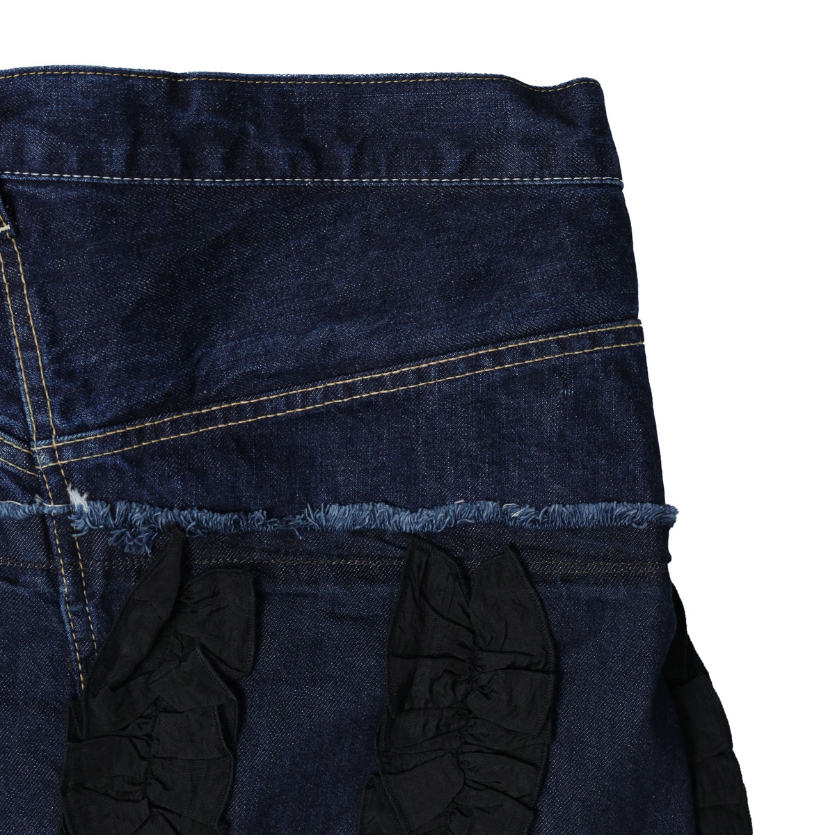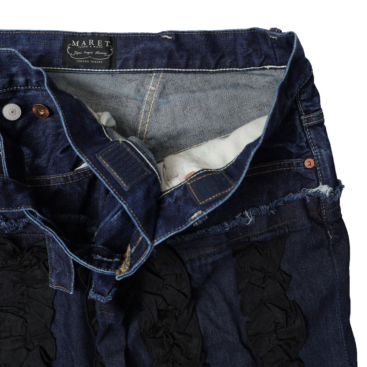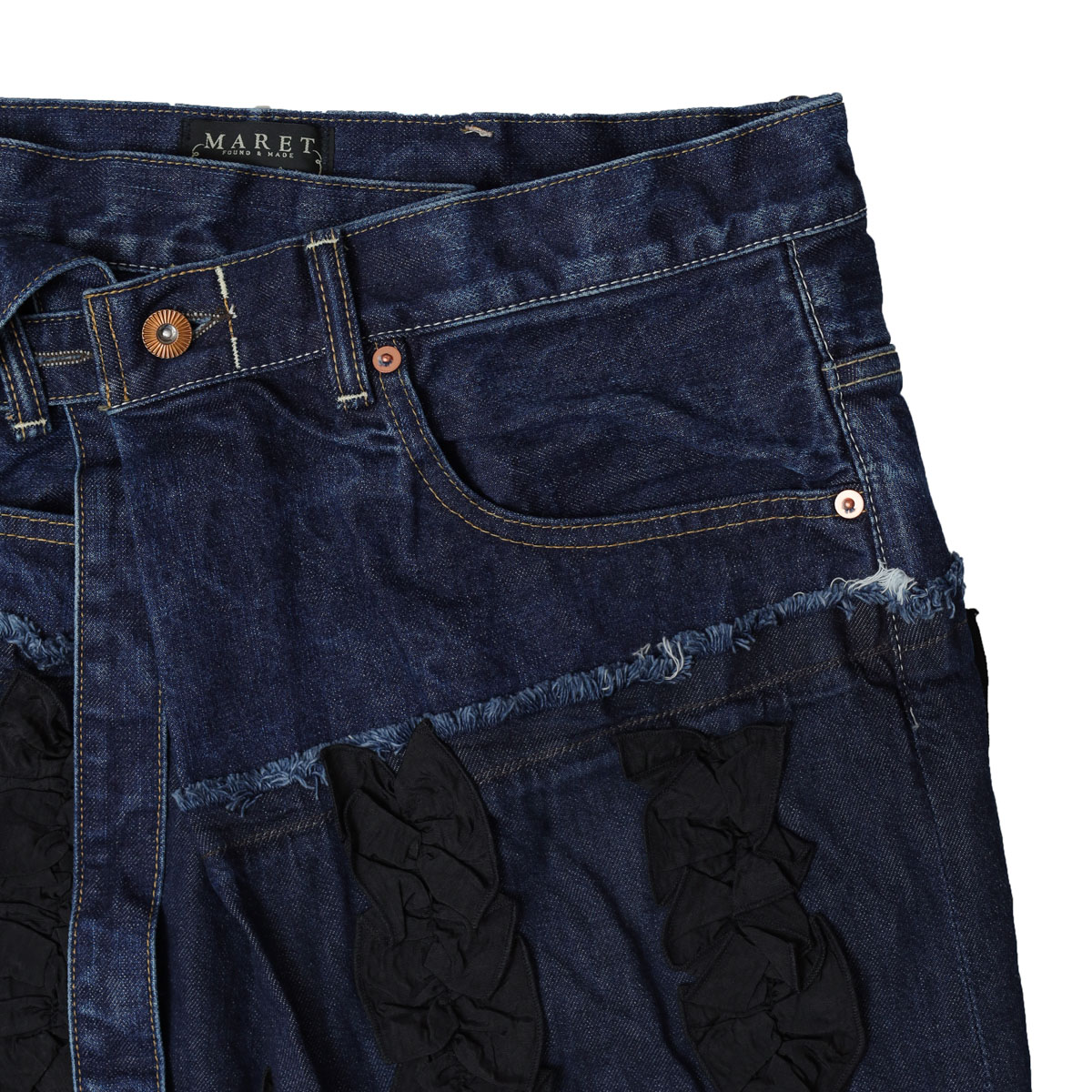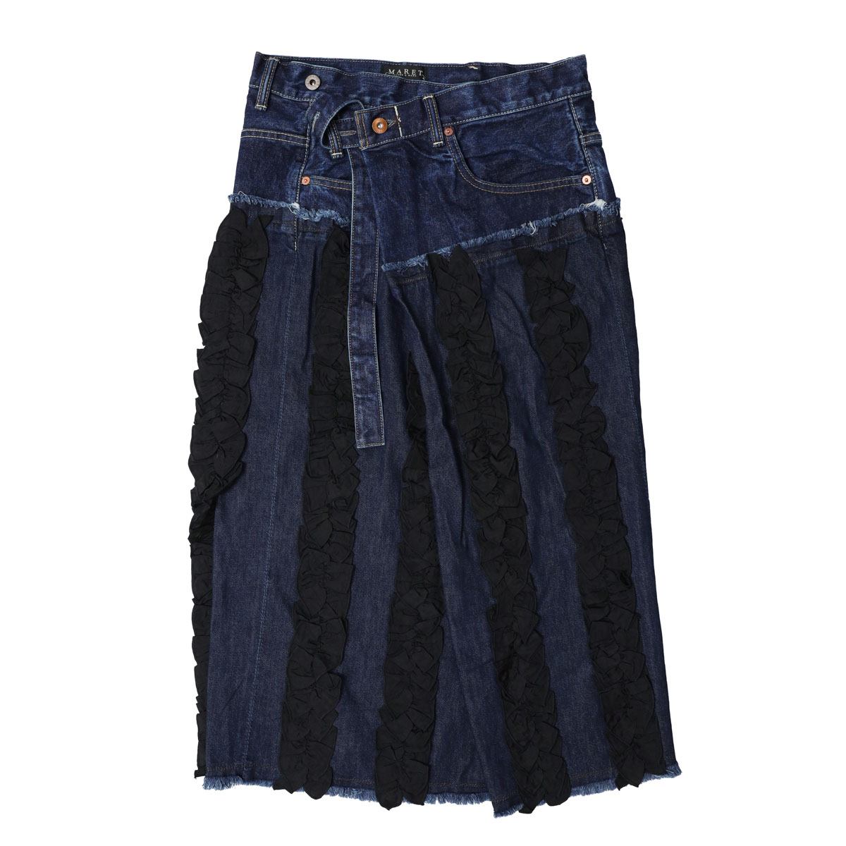 M236S82 アシタックフリル スカート は、MARET【マレ】のデニムのアシタックパンツのディテールに、ラップスカートを大胆にドッキングしたアイテム。異素材のフリルを添えて、あえて違和感がプラスされ個性が際立ちます。足が太く見えない丈感にこだわり、切りっぱなしのクラフト感と独特の存在感を共存させた、MARETらしい一着です。