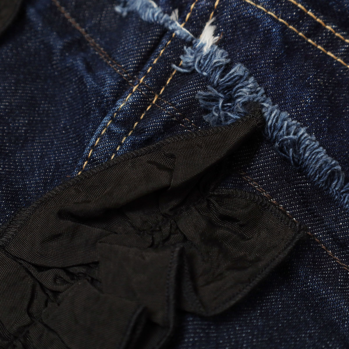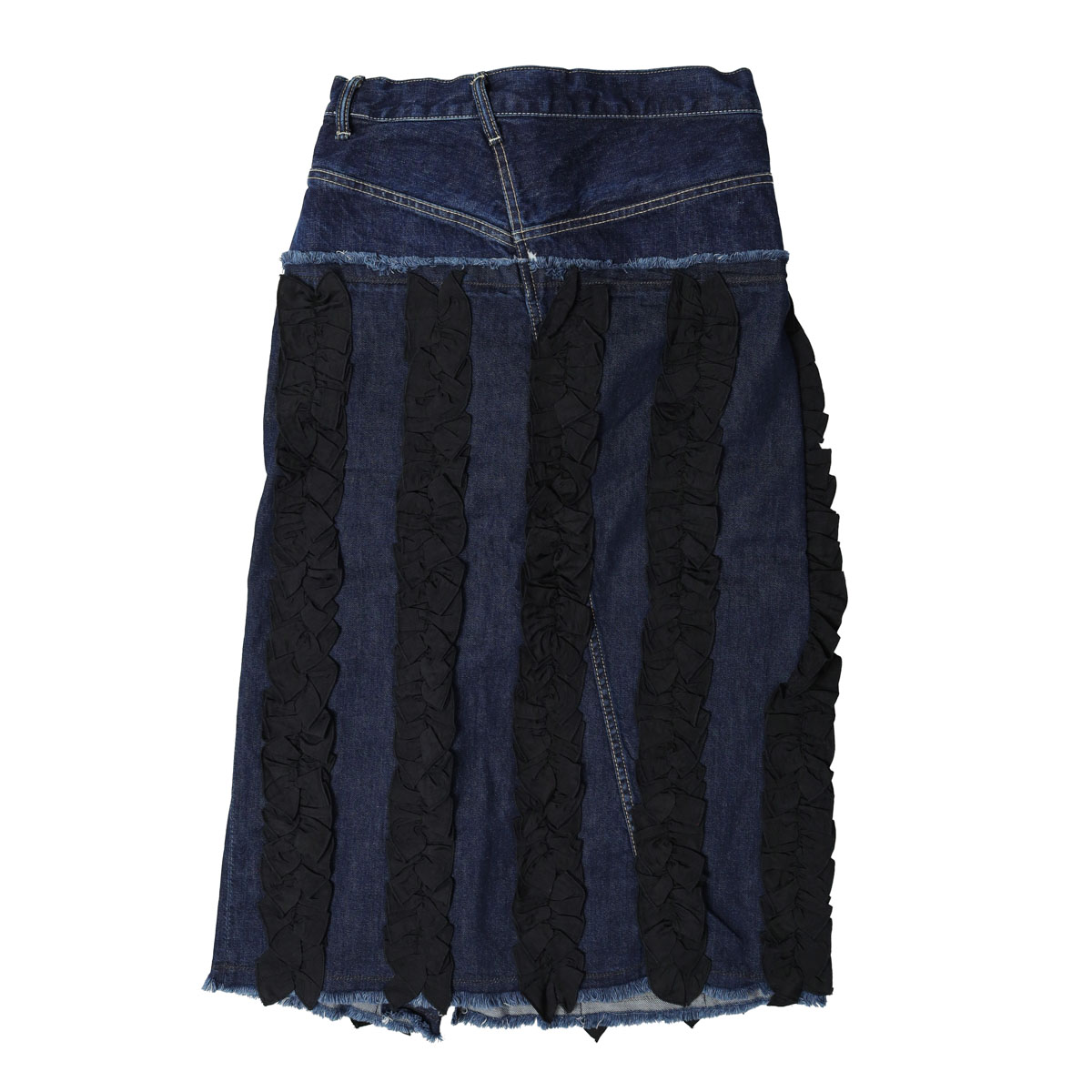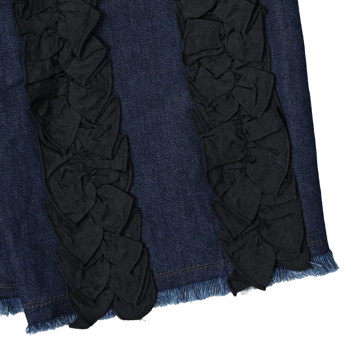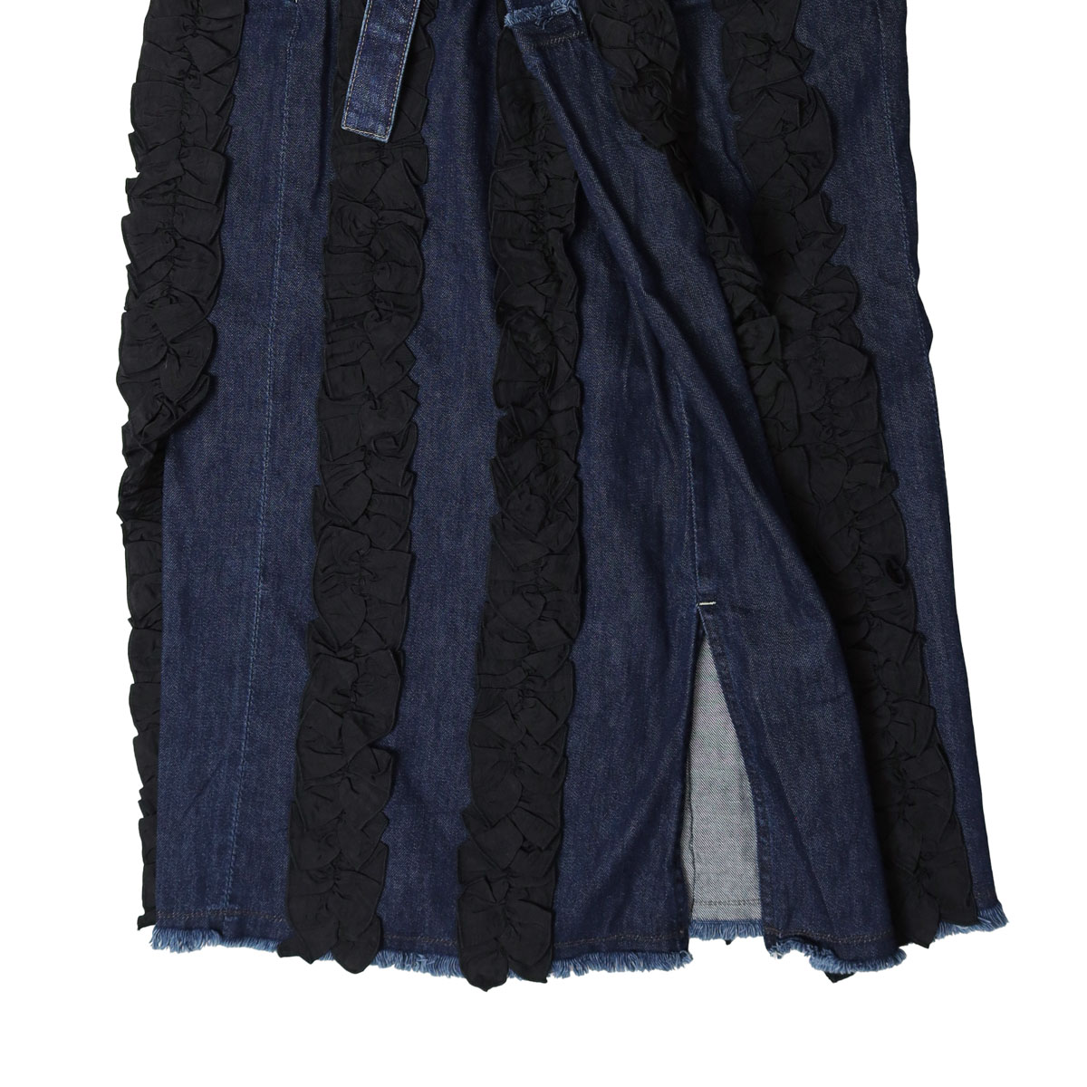 M236S82 アシタックフリル スカート は、MARET【マレ】のデニムのアシタックパンツのディテールに、ラップスカートを大胆にドッキングしたアイテム。異素材のフリルを添えて、あえて違和感がプラスされ個性が際立ちます。足が太く見えない丈感にこだわり、切りっぱなしのクラフト感と独特の存在感を共存させた、MARETらしい一着です。