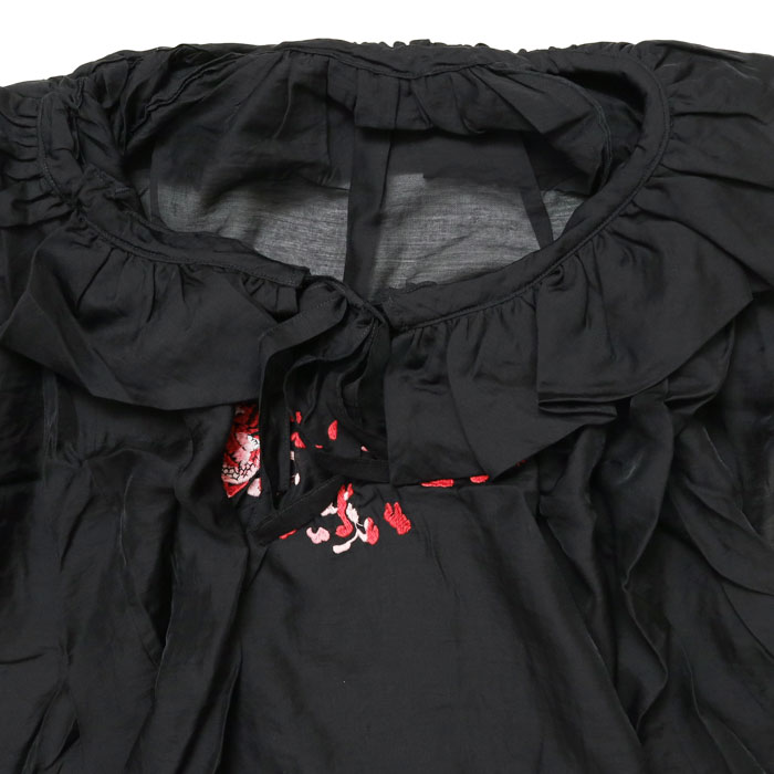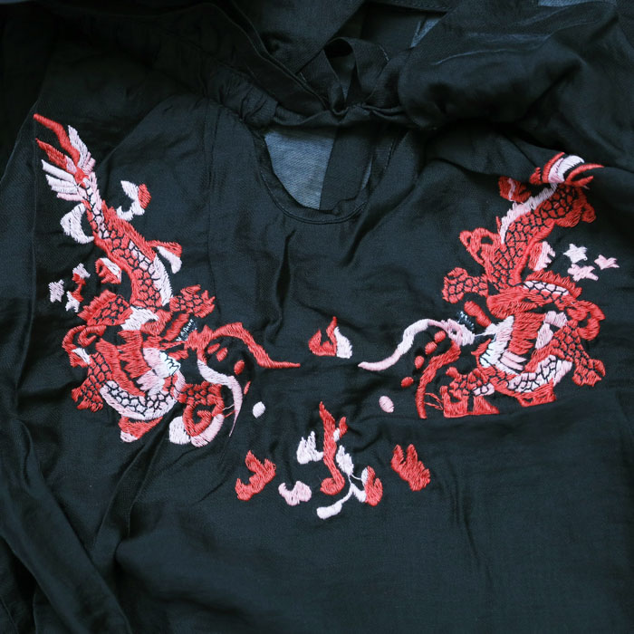 M25A11 スカ刺繍 プルオーバーは、MARET【マレ】の自然なムラ感のあるテンセルとナイロンのシアー素材に反してドラゴンの刺繍を施したチュニック。襟を絞ることで様々な表情に着こなすことができます。