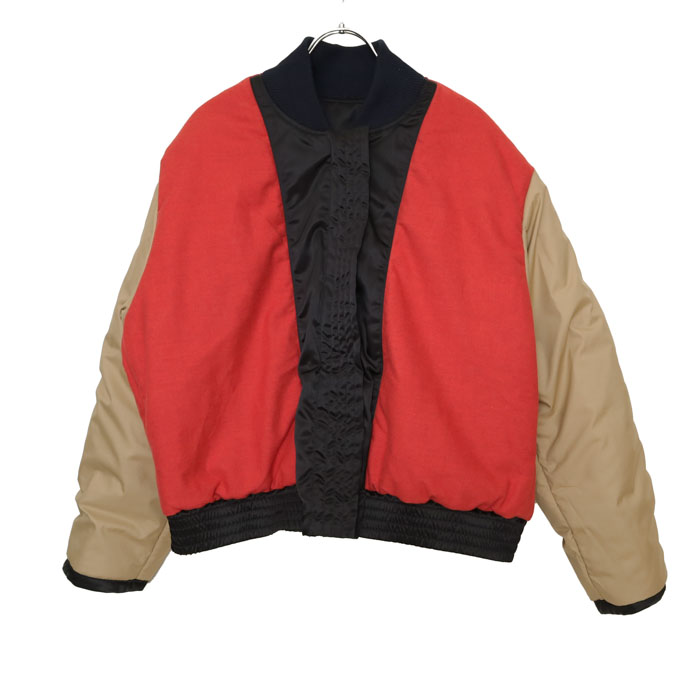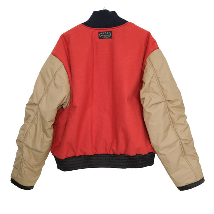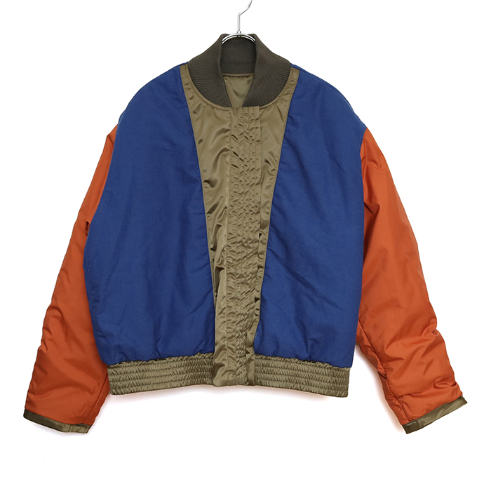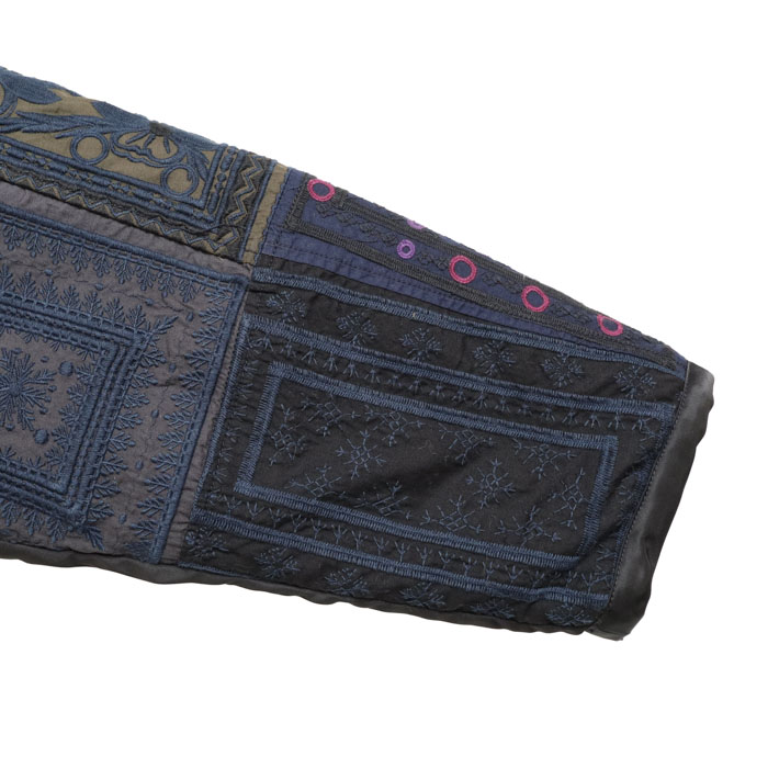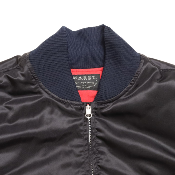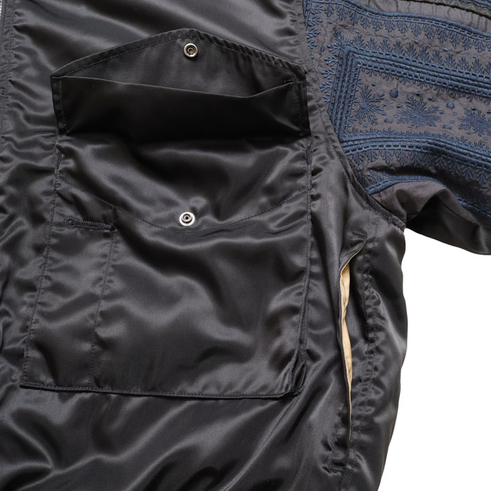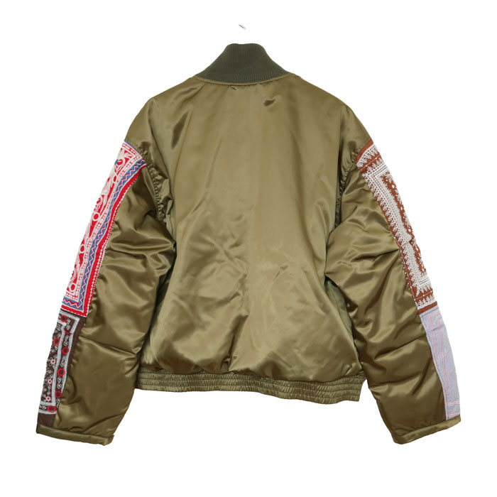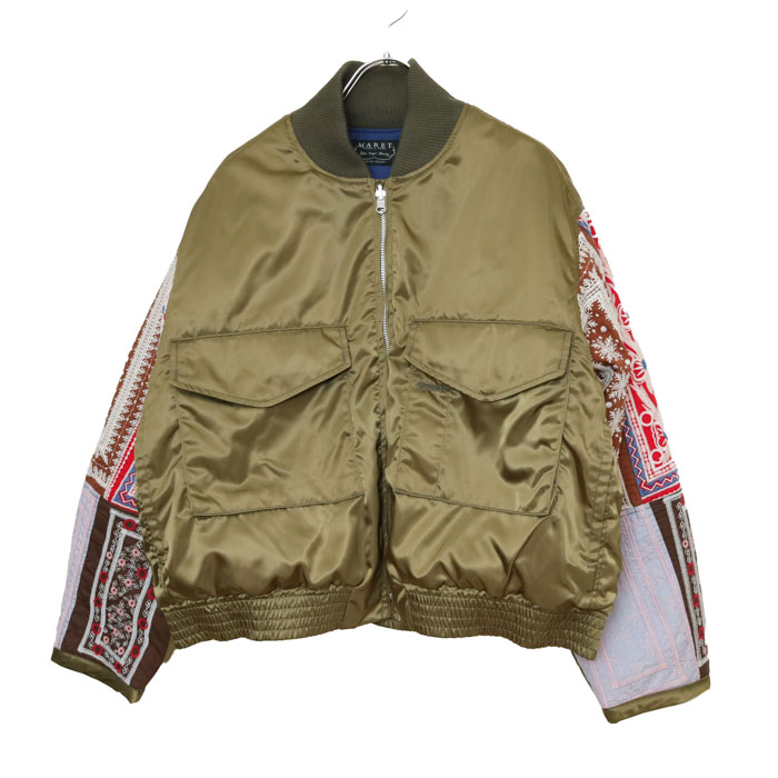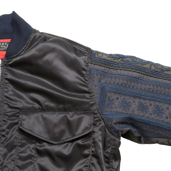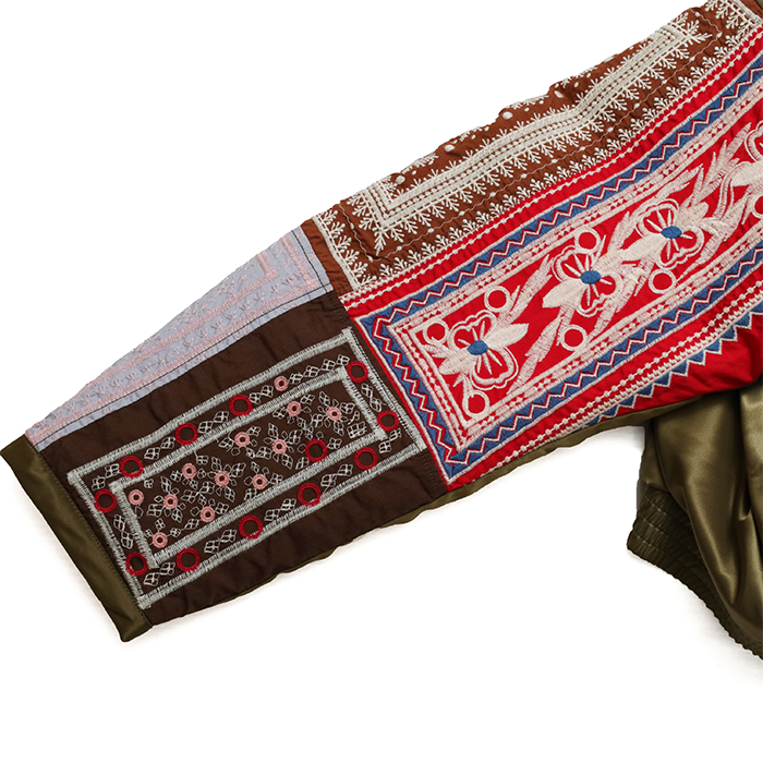 M25A22 ミニタリー刺繡袖ドッキングジャケットは、MARET【マレ】のWEPジャケットと呼ばれるMA4の前身のフライトジャケットに、エスニックな刺繍ラグのパッチワーク袖をドッキングしたアイテム。ゆったりしながら短めのサイズでコーディネートしやすくなっています。
