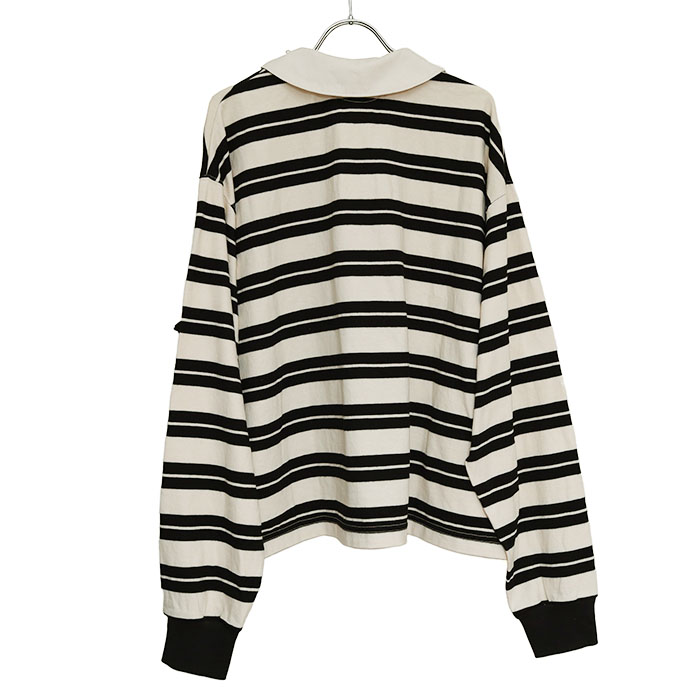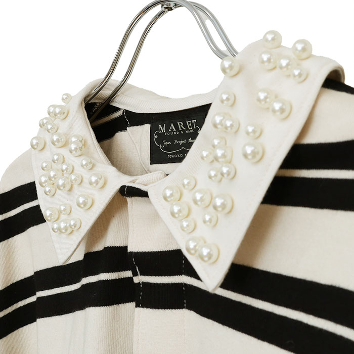 M25A71 ボーダーラガーワイフシャツは、MARET【マレ】のラガーシャツの襟にパールを散りばめたスポーツ×エレガントなアイテム。身幅を広くクロップド丈でさらにフラットカラーにアレンジすることで女性でも着やすい形に。存在感のある一着です。