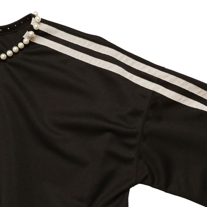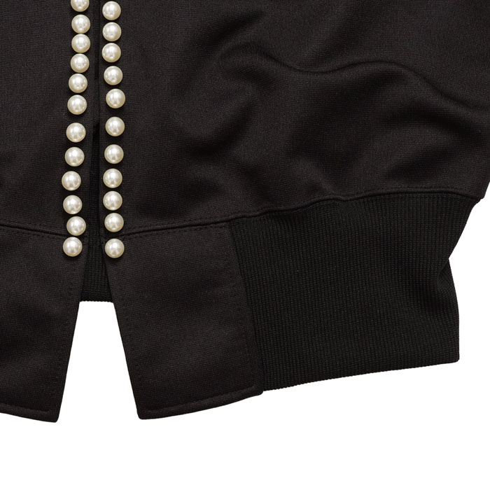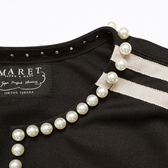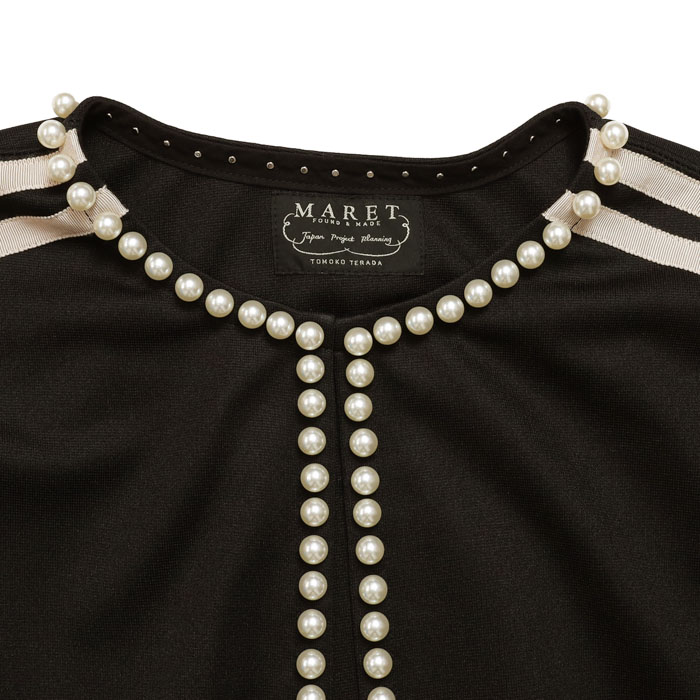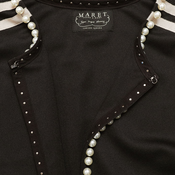 M25S23 パールON THE トラックカーデは、MARET【マレ】のスポーティーなトラックジャケットをノーカラーにし、袖口にボリュームを、裾もバルーンシルエットにしたカーディガン。襟から前端にひとつひとつ手作業でパールを打ち付け、一枚でミスマッチを楽しめるアイテムに。薄い割に適度なハリがあり、ニット素材ですが伸びすぎないのでだらしなくならないのが嬉しいポイントです。