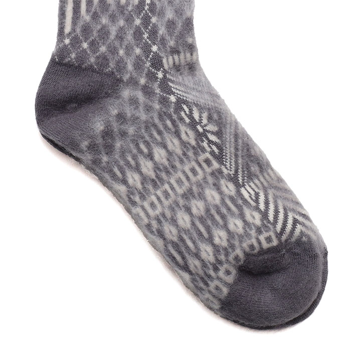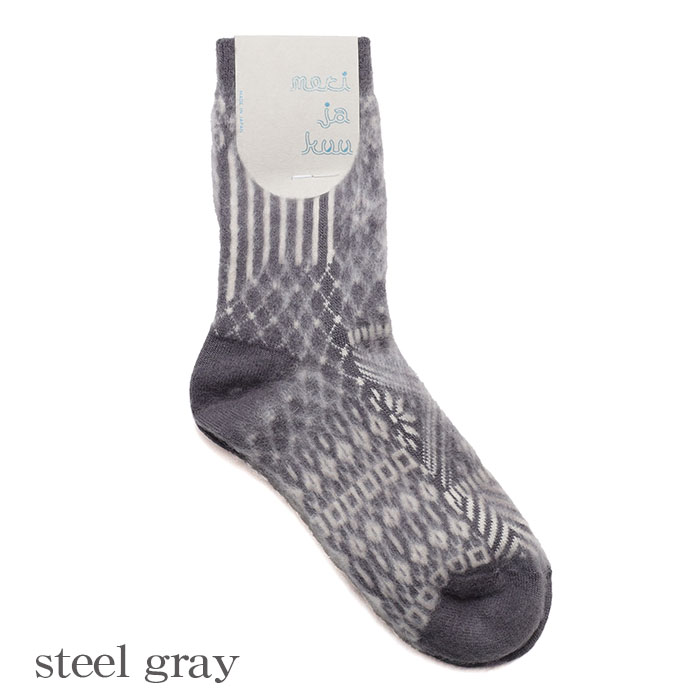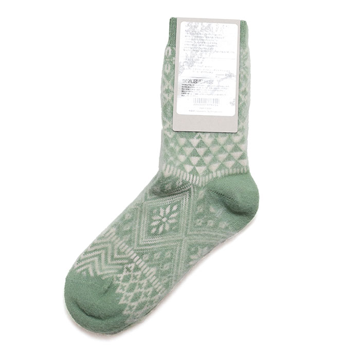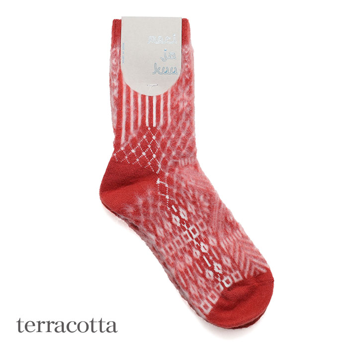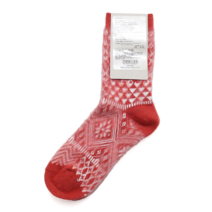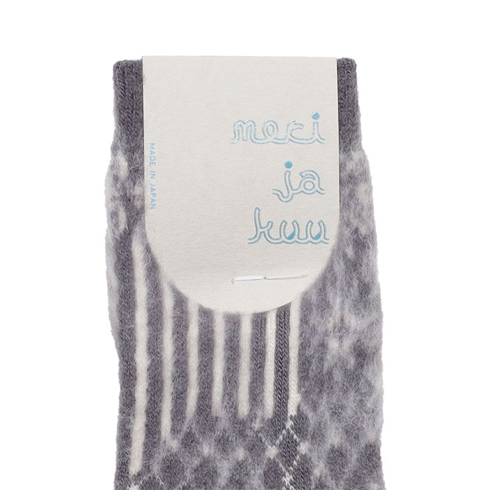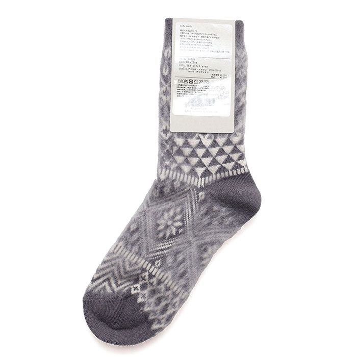 mj-25205 fluffy nordic ソックスは、meri ja kuu【メリヤクー】のふわふわとしたアクリルウールの糸で、ノルディック柄のセーターをイメージして編んだ靴下です。起毛をかけてより温かみのある雰囲気に仕上げています。ギフトにも喜ばれるアイテムです♪