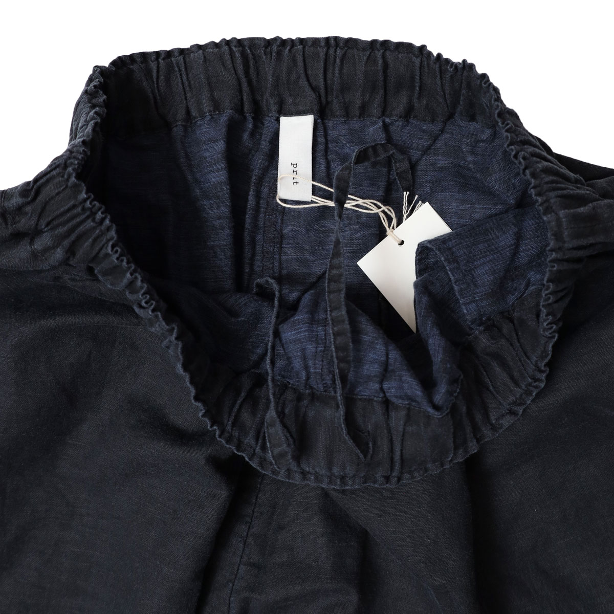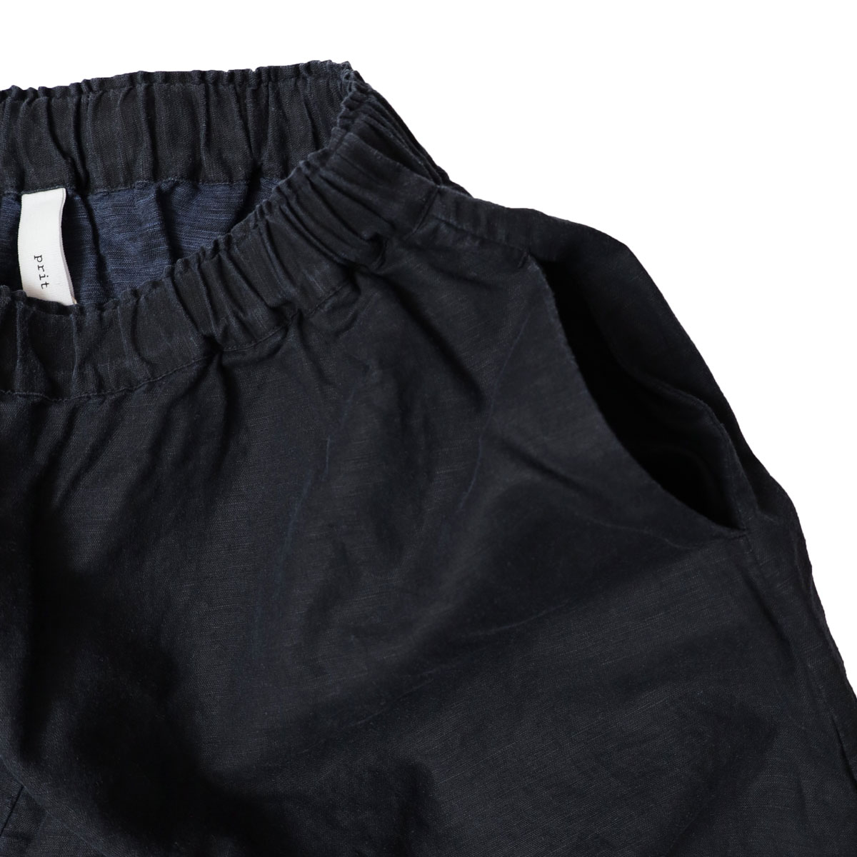 P71601 リネンコットン交織平織ピグメント加工 ペンギンパンツ は、prit【プリット】のリネンとコットンの混紡糸を平織りにした生地に、顔料(ピグメント)を付着させてバイオ加工を施した生地を使用したパンツ。