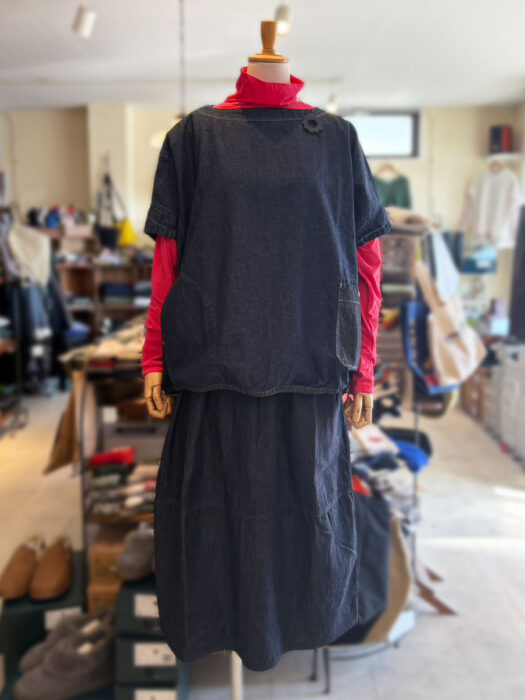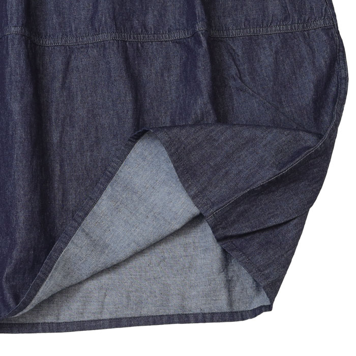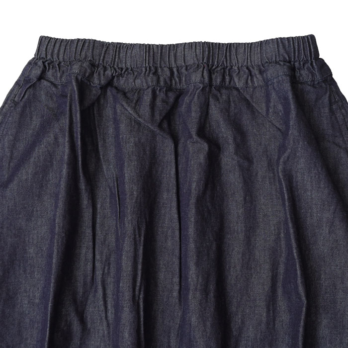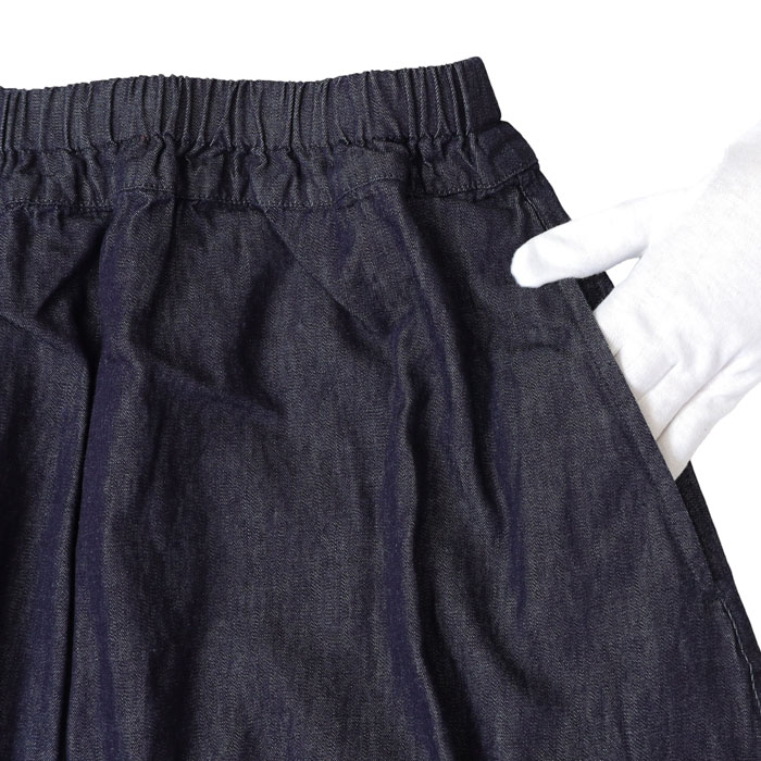 P71615 6ozデニム コクーンスカート は、prit【プリット】の一般的なデニムより少し薄くて軽い6ozデニムスカート。やわらかな肌触りで着心地がよく、着るほどに風合いのでる経年変化を感じられる生地です。切替のデザインとコクーンシルエットが可愛いスカートです。ウエストはゴムとひもで調節できます。
