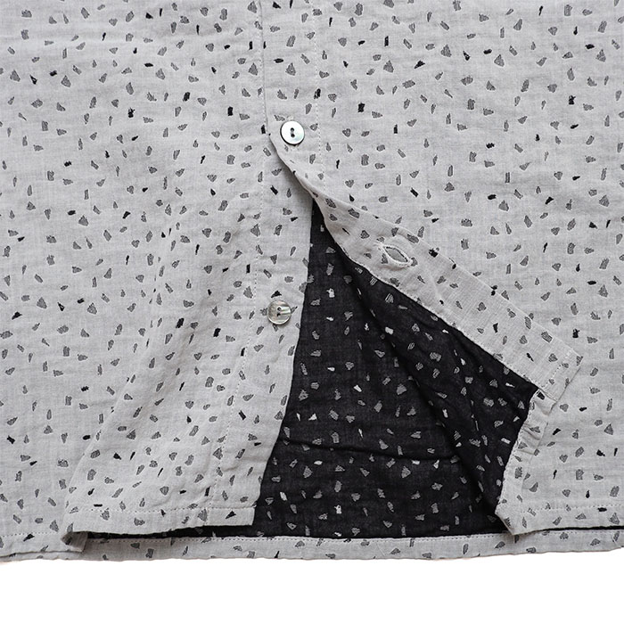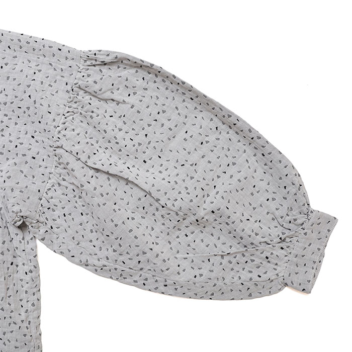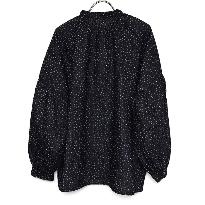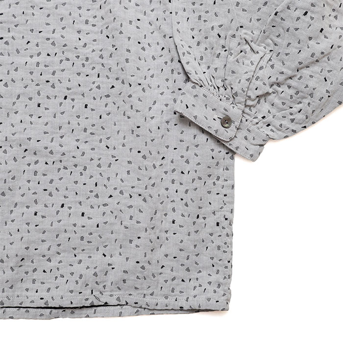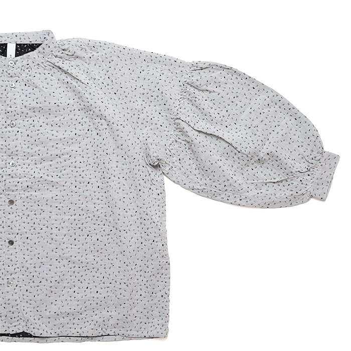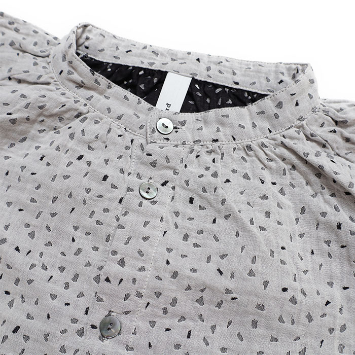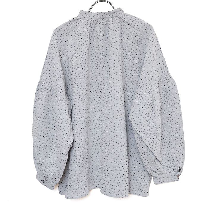 P80613 60/1ピースジャガード スタンドカラーギャザーブラウスは、prit【プリット】のやわらかく膨らみのある風合いが特徴の、オーガニックコットンを使用したサスティナブル素材を使用した一着。デザインが生地に織り込まれているジャガード織りで、かけらや破片を意味するピース柄を表現しています。着心地がよく、さらりと1枚でも季節が進めば重ね着でもお楽しみいただけます。肩馴染みのよいラグランスリーブ仕様で着るほどに馴染み、袖の切替とたっぷりのギャザー使いがポイントになります。