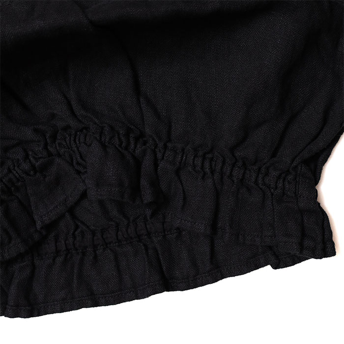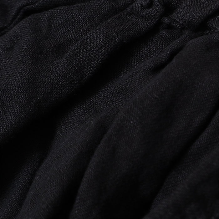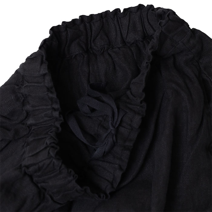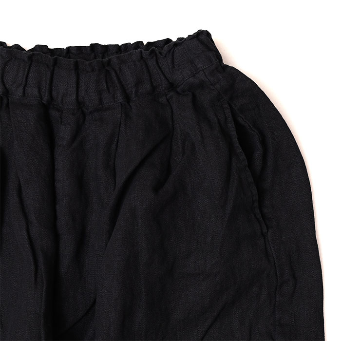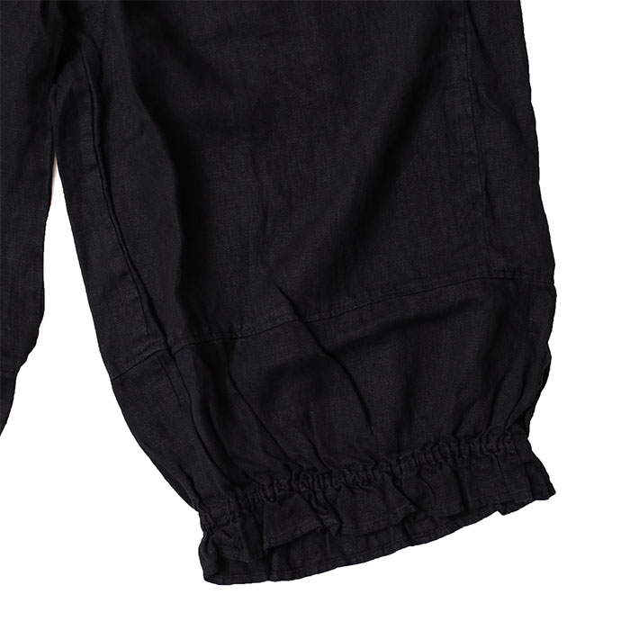 TB25317 ソリトリネン① フリルワイドパンツは、tumugu【ツムグ】の中肉厚のリネンツイルで、耐久性がありつつも通気性に優れているパンツ。こだわりの製品染め加工により、色合いに深みが増し、独特の表情を持った仕上がりになっています。股上深めのワイドでゆったりとした着心地とウエストはゴム仕様で締め付け感がなく、ストレスフリーな履き心地です。裾のシャーリングフリルが大人の可愛さを演出。ワンピースなどのアンダーパンツとしても活躍します。季節の変わり目から春夏まで、ロングシーズン重宝していただけるアイテムです。