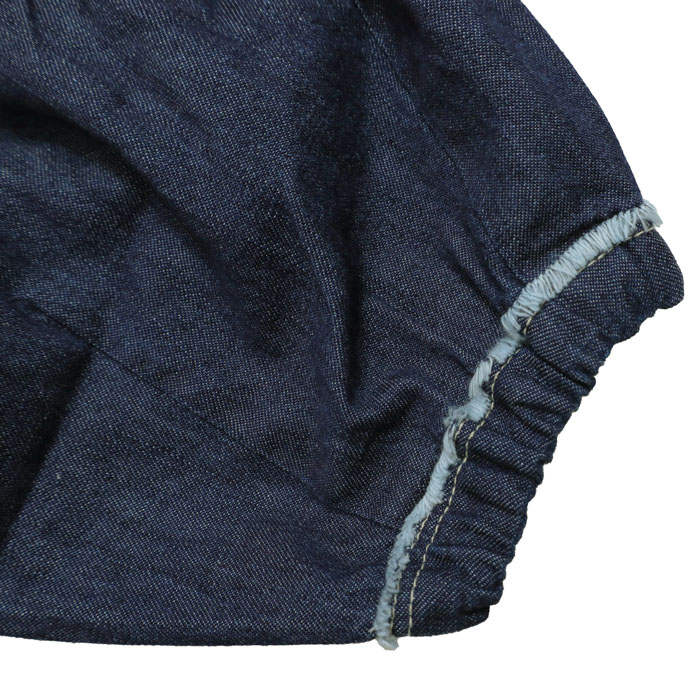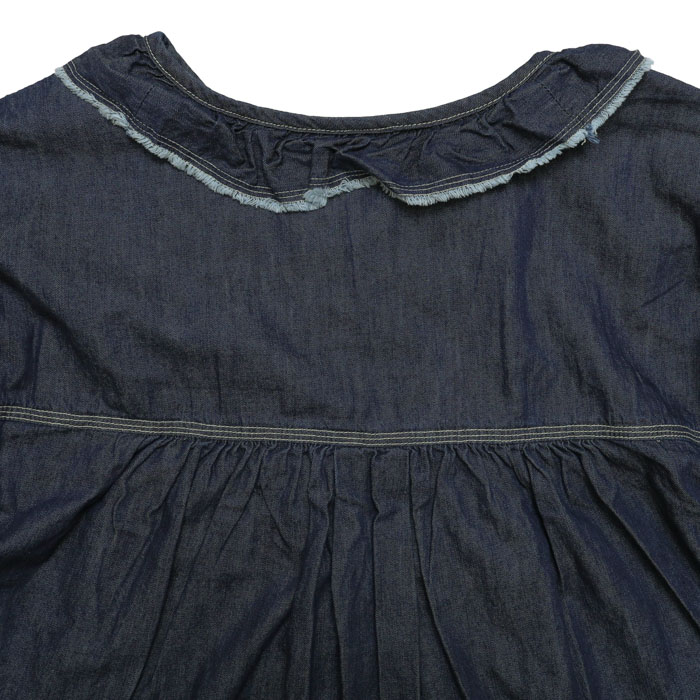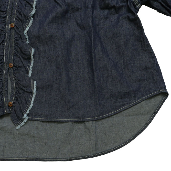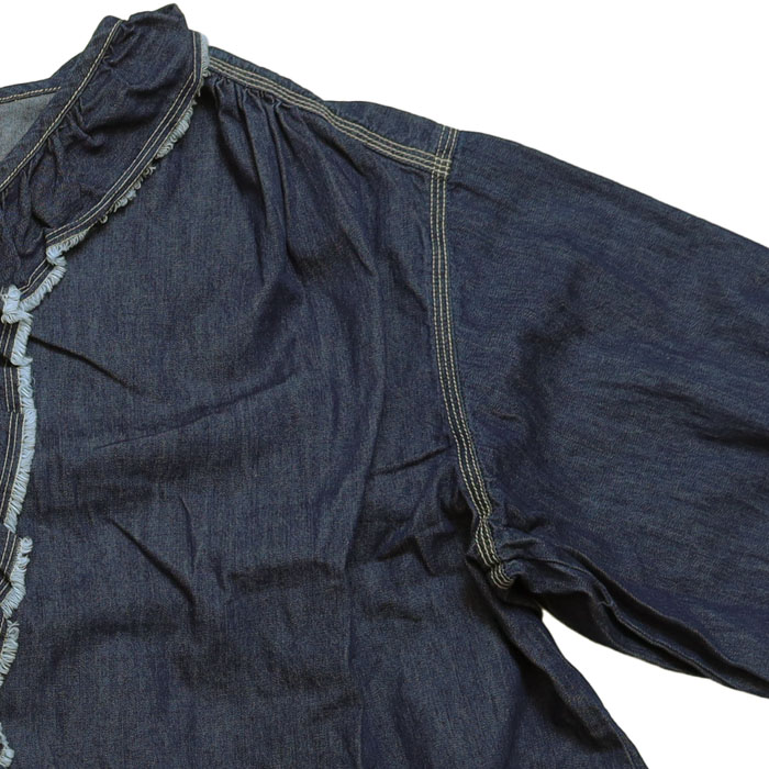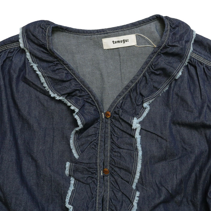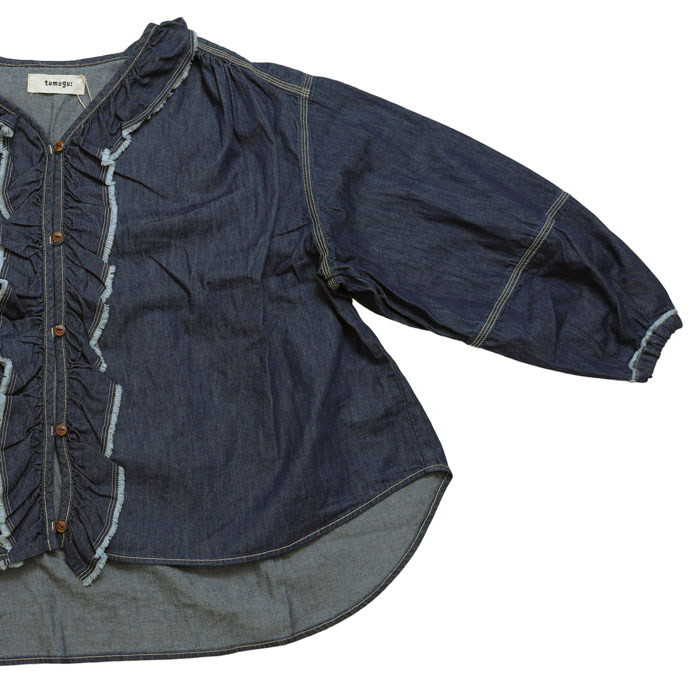 TB25325 ライトオンスデニム フリルブラウスは、tumugu【ツムグ】の軽やかでやわらかいライトオンスデニム素材で仕立てたブラウス。デニム特有のゴワつき感がなく、肌に心地よくなじみ、ふんわりと軽やかな着心地を実現。